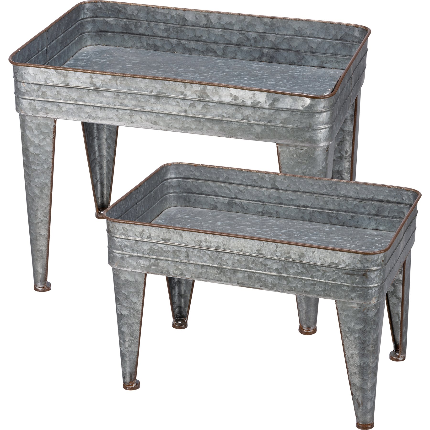 A set of two galvanized metal tray tables. Our Galvanized tray table set is perfect for holding candles, potted plants, and other creative décor items.