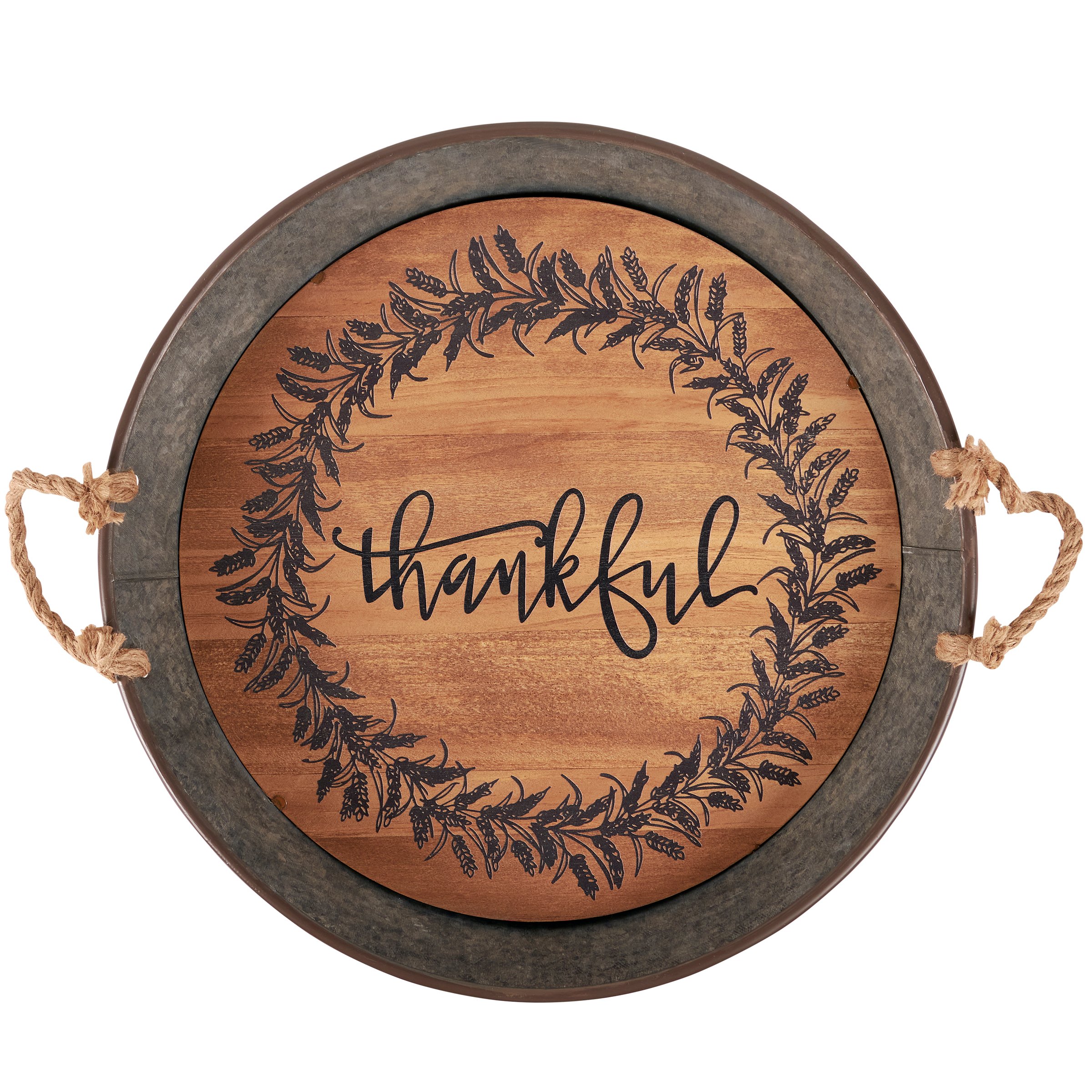 A galvanized metal tray from our Fall & Harvest Collection featuring a natural wood base displaying a hand illustrated "Thankful" sentiment with wheat stalk designs. Our Thankful tray includes dual rope handles for easy carrying. A rustic fall home accent perfect for seasonal use.