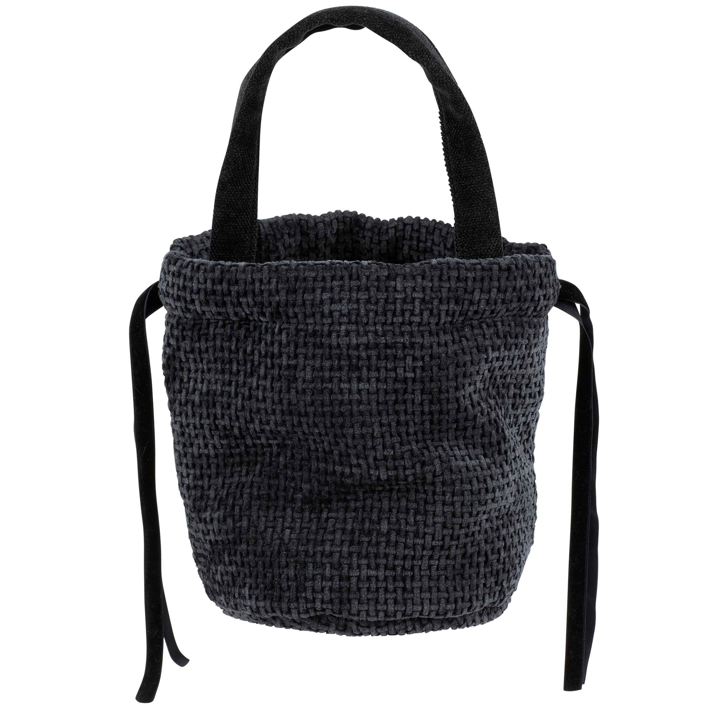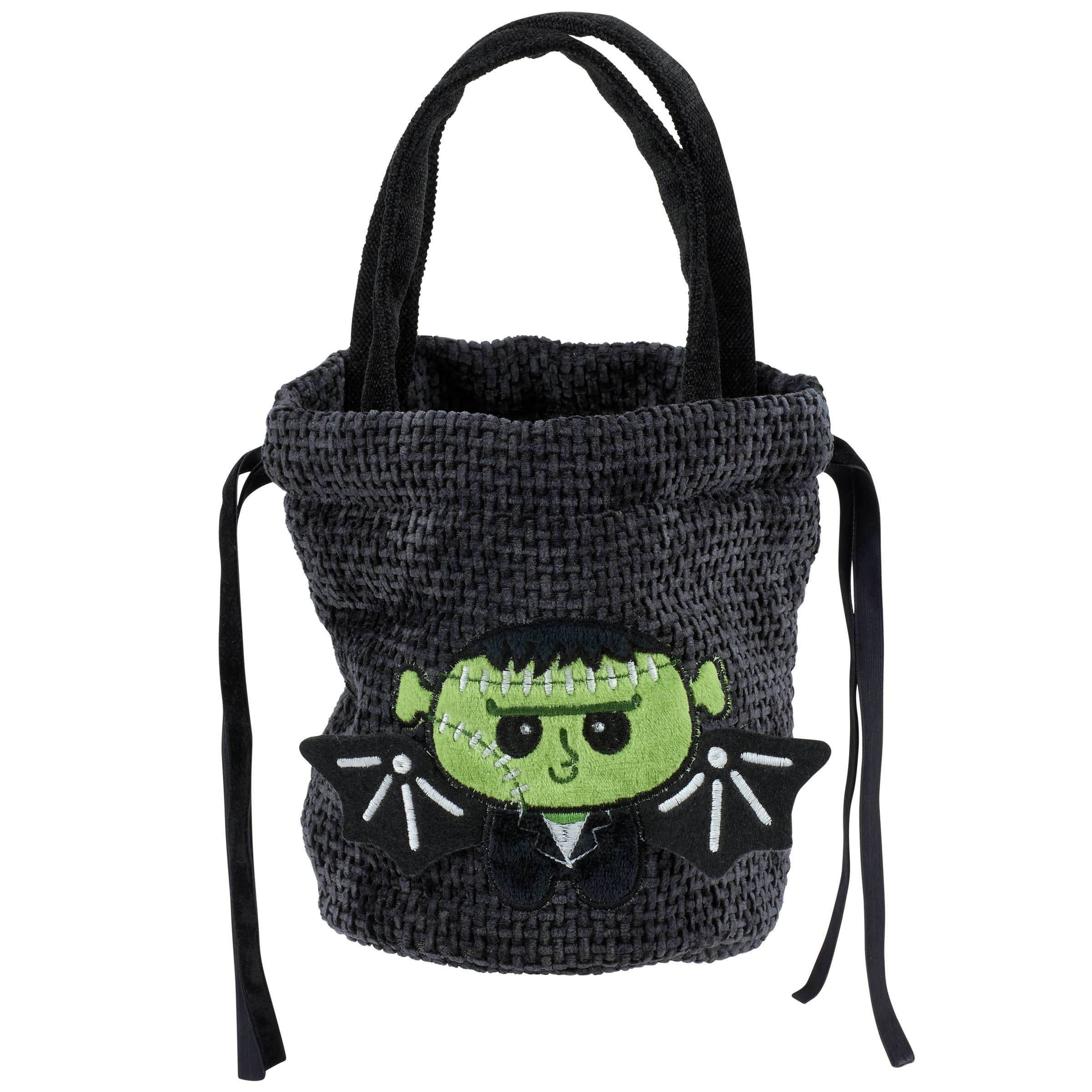 A reusable treat bag from our Halloween Collection featuring a black woven bag with an embroidered patch on the front displaying a cute Frankenstein monster with bat wings. Our Frankenbat treat bag includes fabric handles and sinch tie to secure items inside. A whimsical Halloween accessory perfect for trick or treating as well as for reusable gift wrapping.