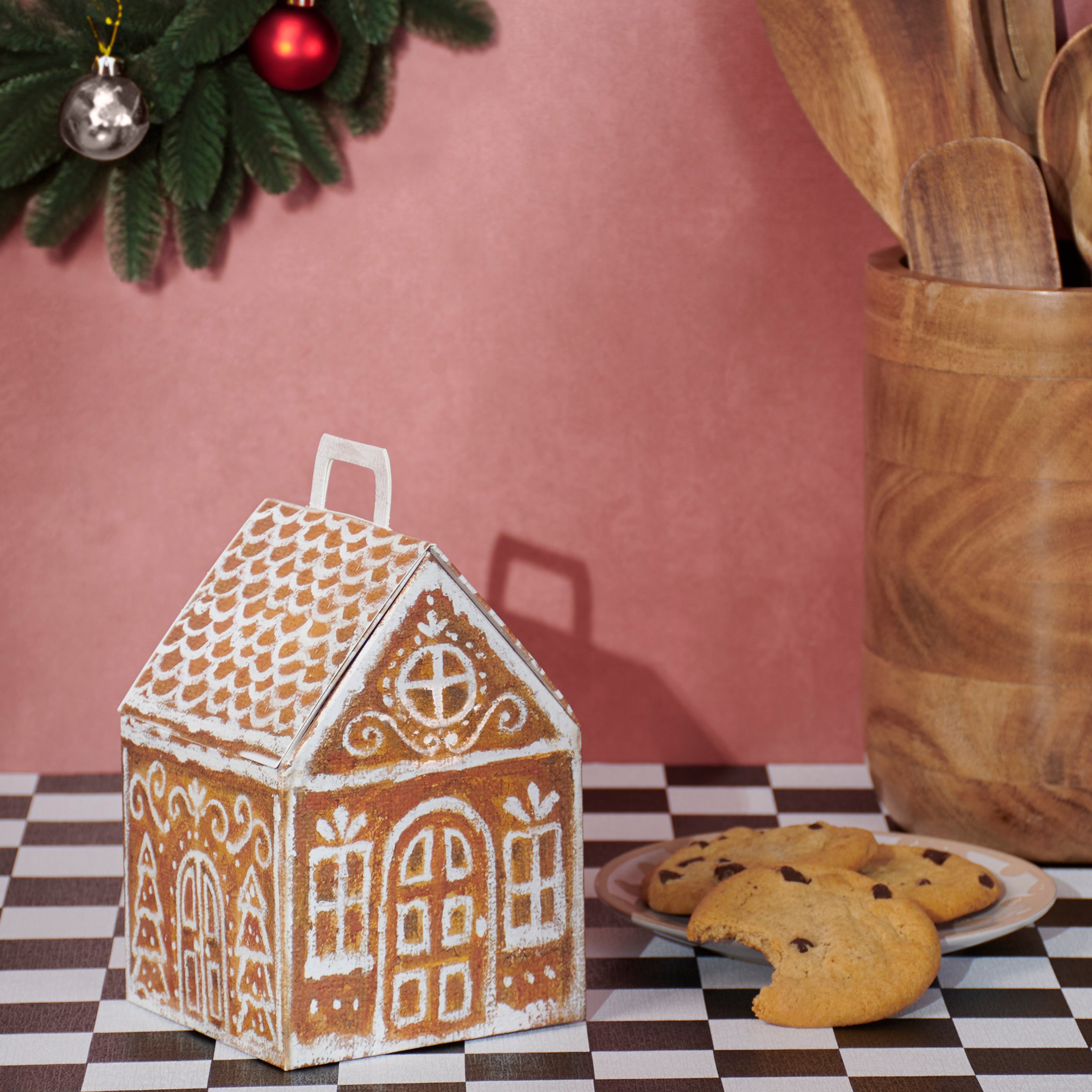 A pack of paper treat boxes from our Christmas Collection perfect for gifting baked holiday treats. Seasonal treat boxes feature a print of a gingerbread house replicated from original hand painted art that folds and latches to create a dimensional gingerbread house appearance with handle on top for convenient carrying and gifting. Our Gingerbread House treat boxes include 6 flat treat boxes for easy storage. A fun gingerbread-themed set perfect for enhancing Christmas gifting.
