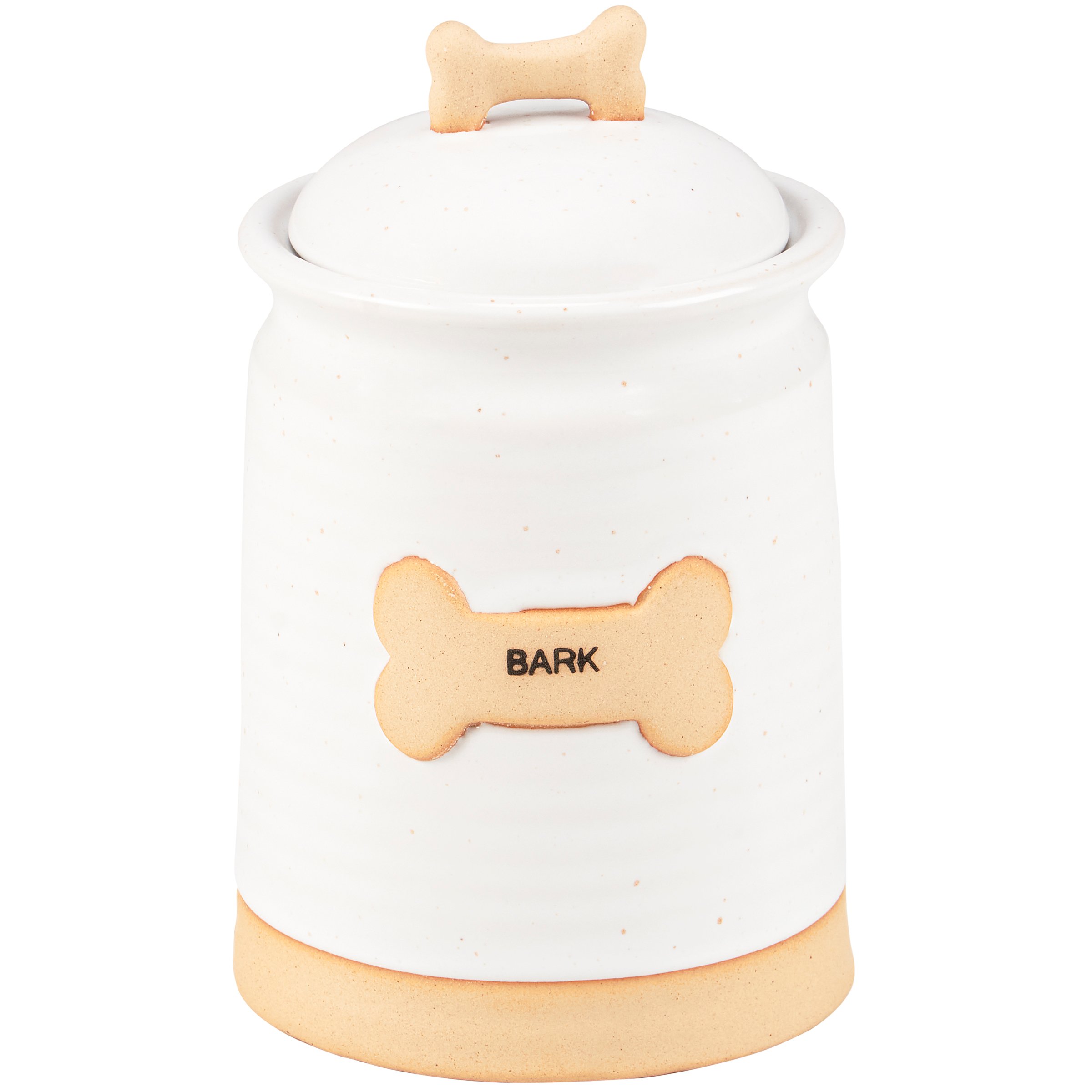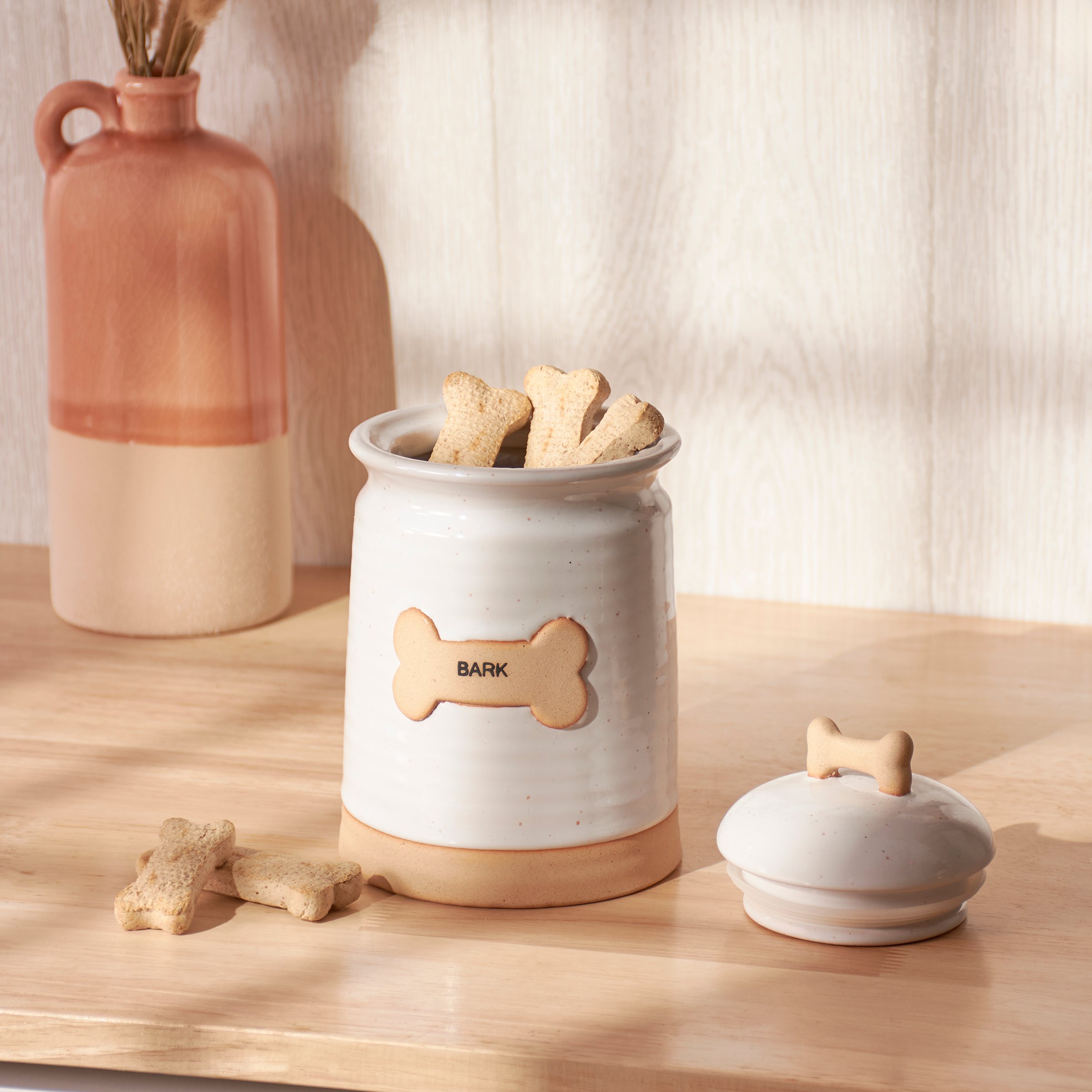 A stoneware treat jar from our Pet Collection displaying a simple cream glaze and bare ceramic pet inspired design that easily coordinates with a variety of home décor. Design features embossed dog bone shape with ""Bark" sentiment and sculpted dog bone on top of the lid. Our Bark Treat Jar is conveniently dishwasher and food safe for easy use. A fun pet-themed kitchen accessory perfect for storing dog treats.