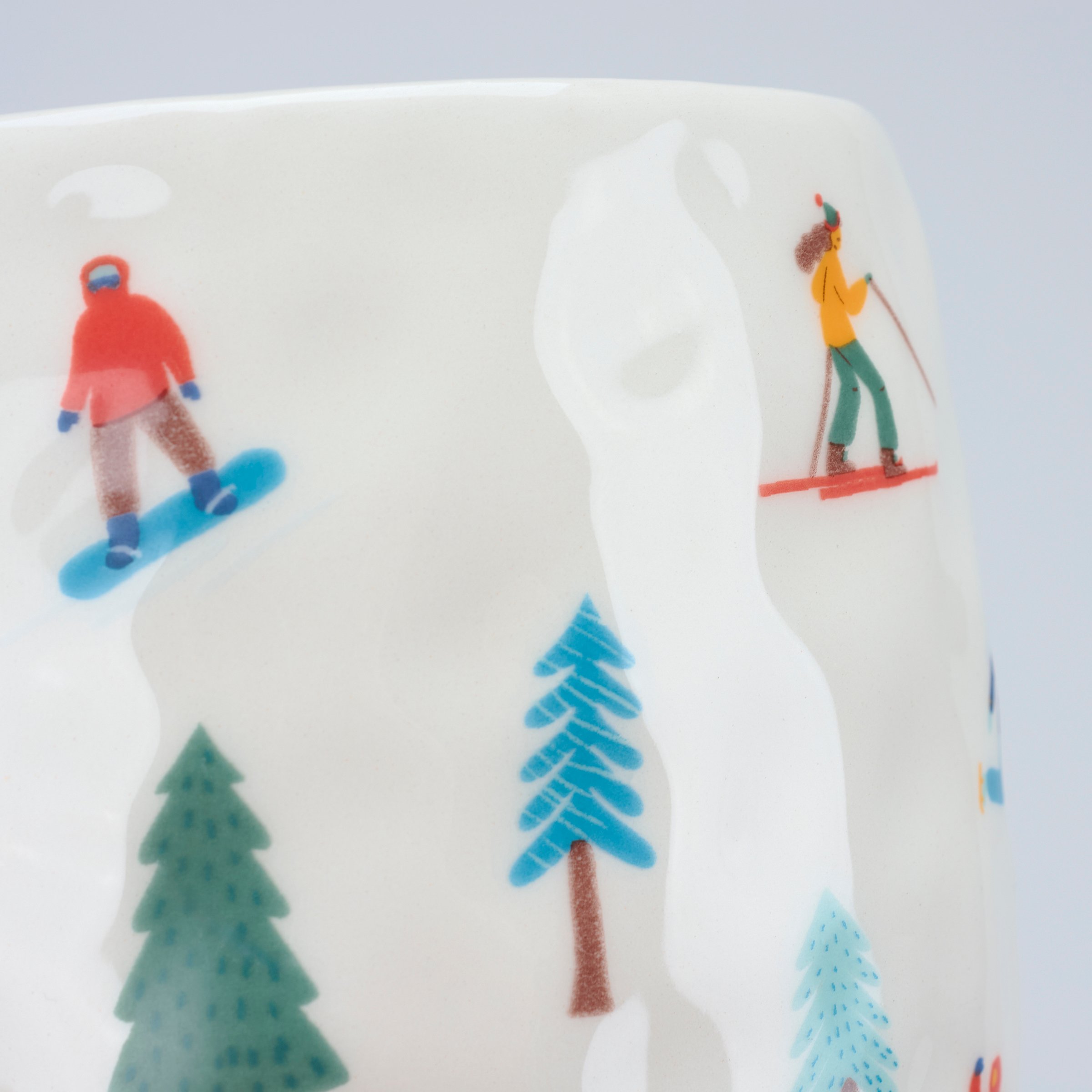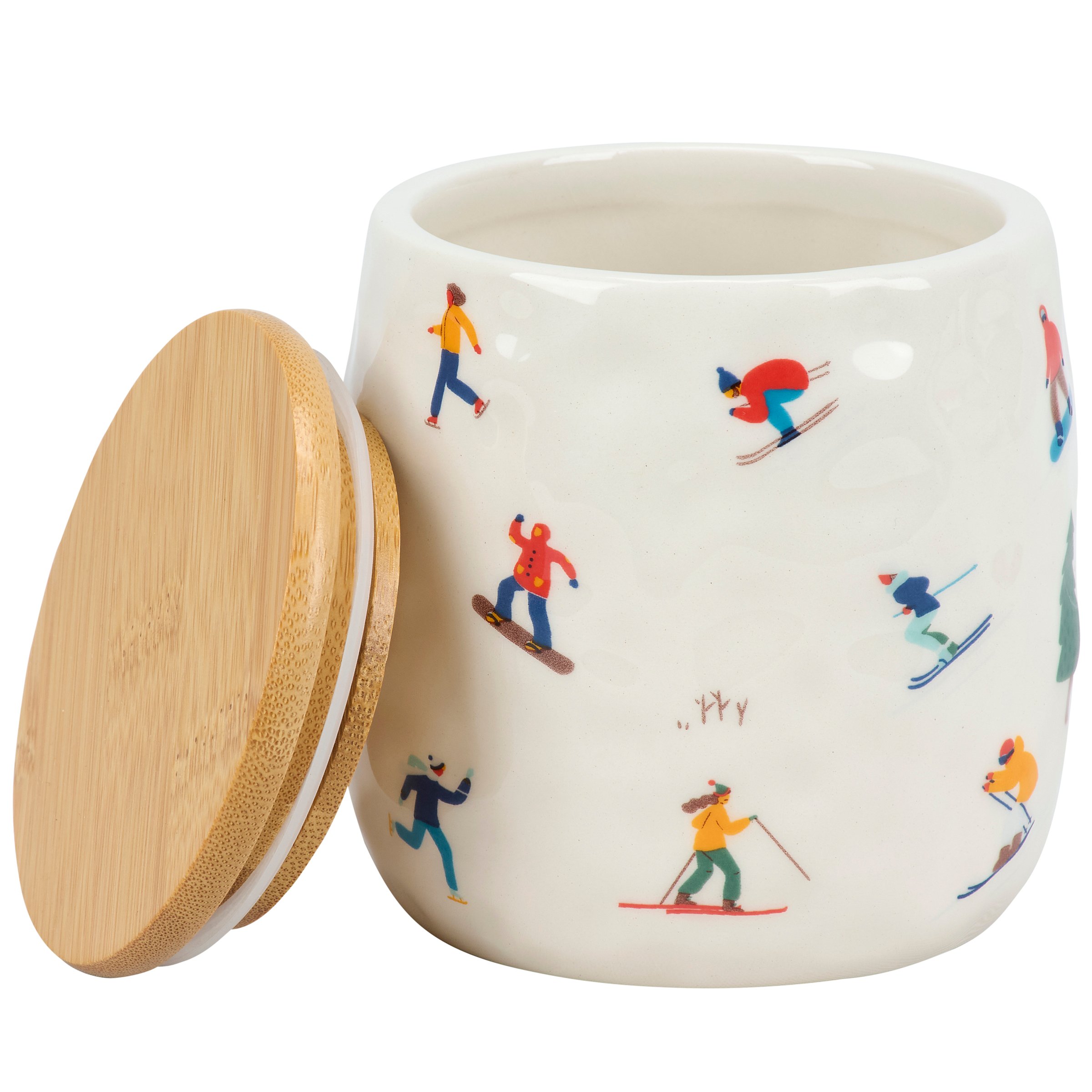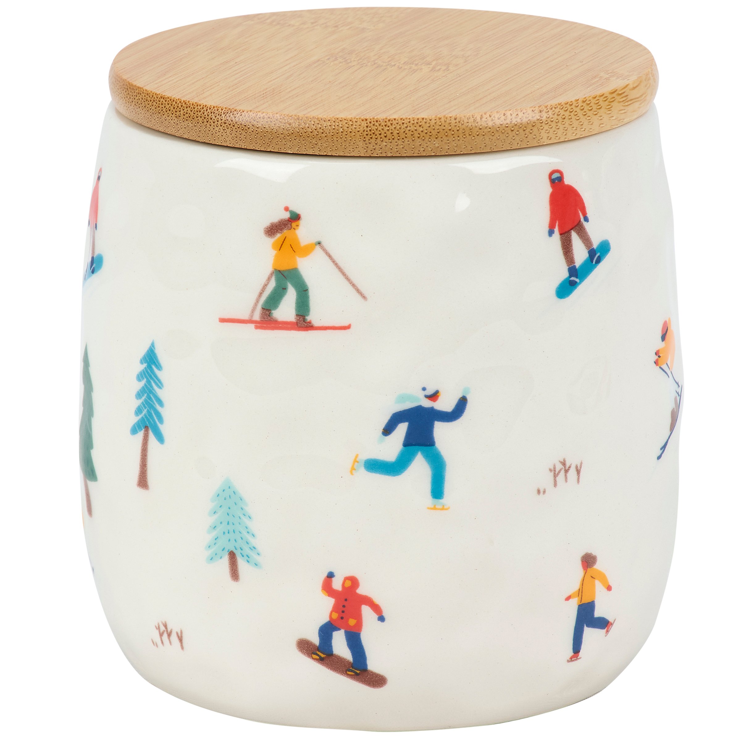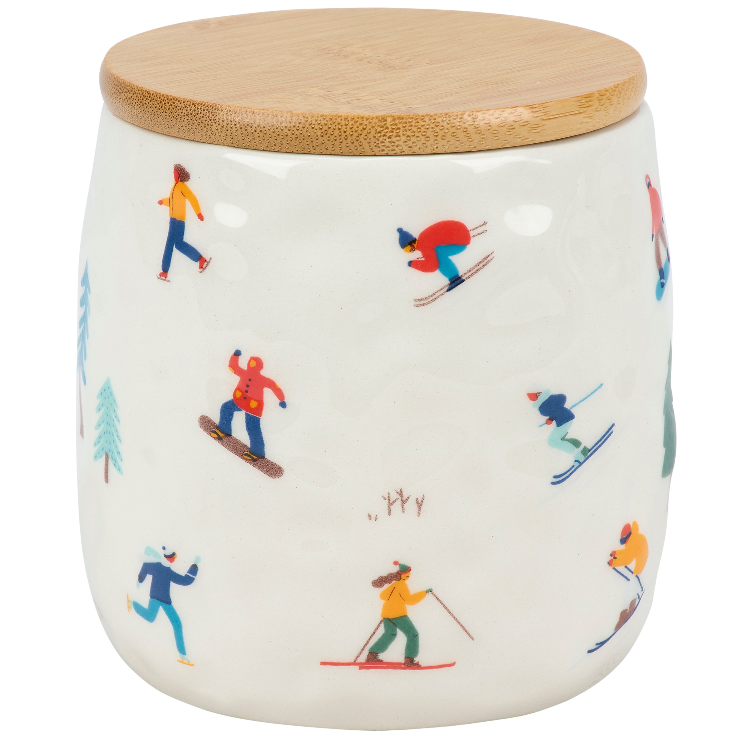 A ceramic canister from our Ski Lodge Collection featuring a full wrap-around design displaying a colorful pattern of skiers in a hand illustrated style. Ceramic canister includes a bamboo lid with plastic seal to help keep items inside fresh. Hand wash only. Our Skiers canister is a fun ski-themed kitchen accessory perfect for storing winter treats or baking ingredients.