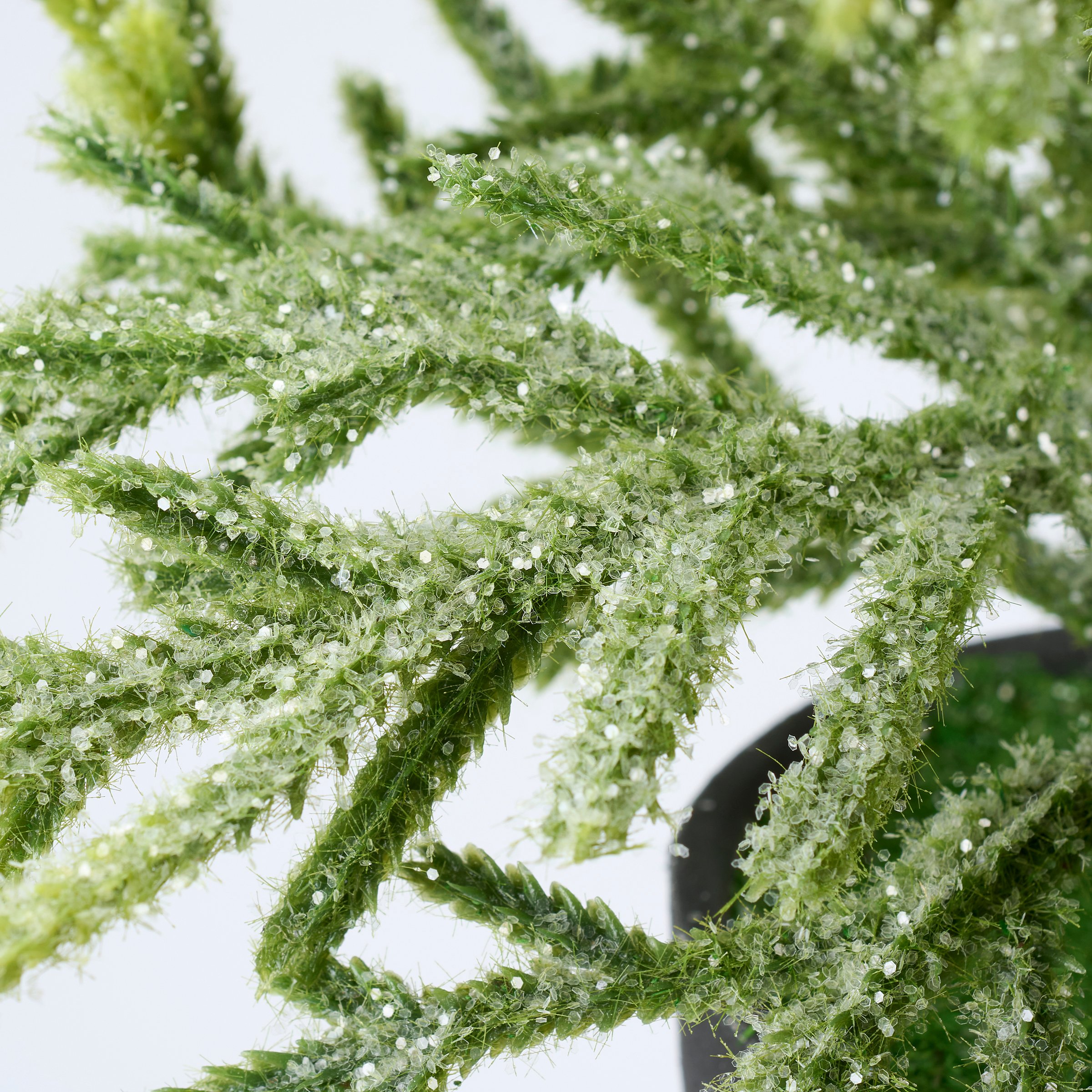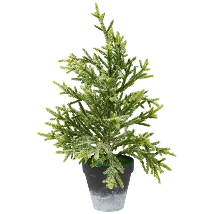 A medium decorative tree from our Christmas Collection displaying a Norfolk pine tree design with a mica coating on the branches for a frosty finish. Our medium Snowy Norfolk Pine tree stands 17.75 inches tall and is attached to a black planter base with a brush of white paint on the bottom that adds a snowy effect. A faux tree perfect for displaying as natural home decor or as a miniature Christmas tree with ornaments.