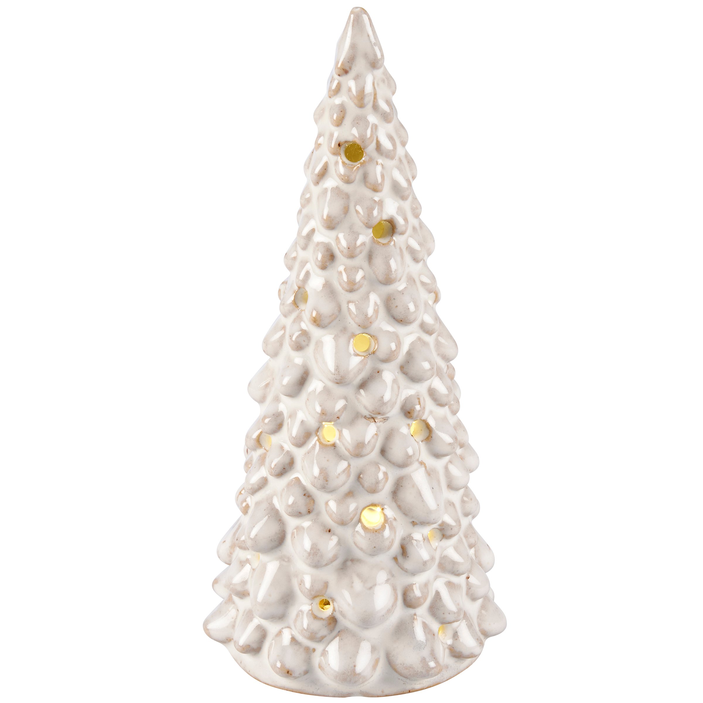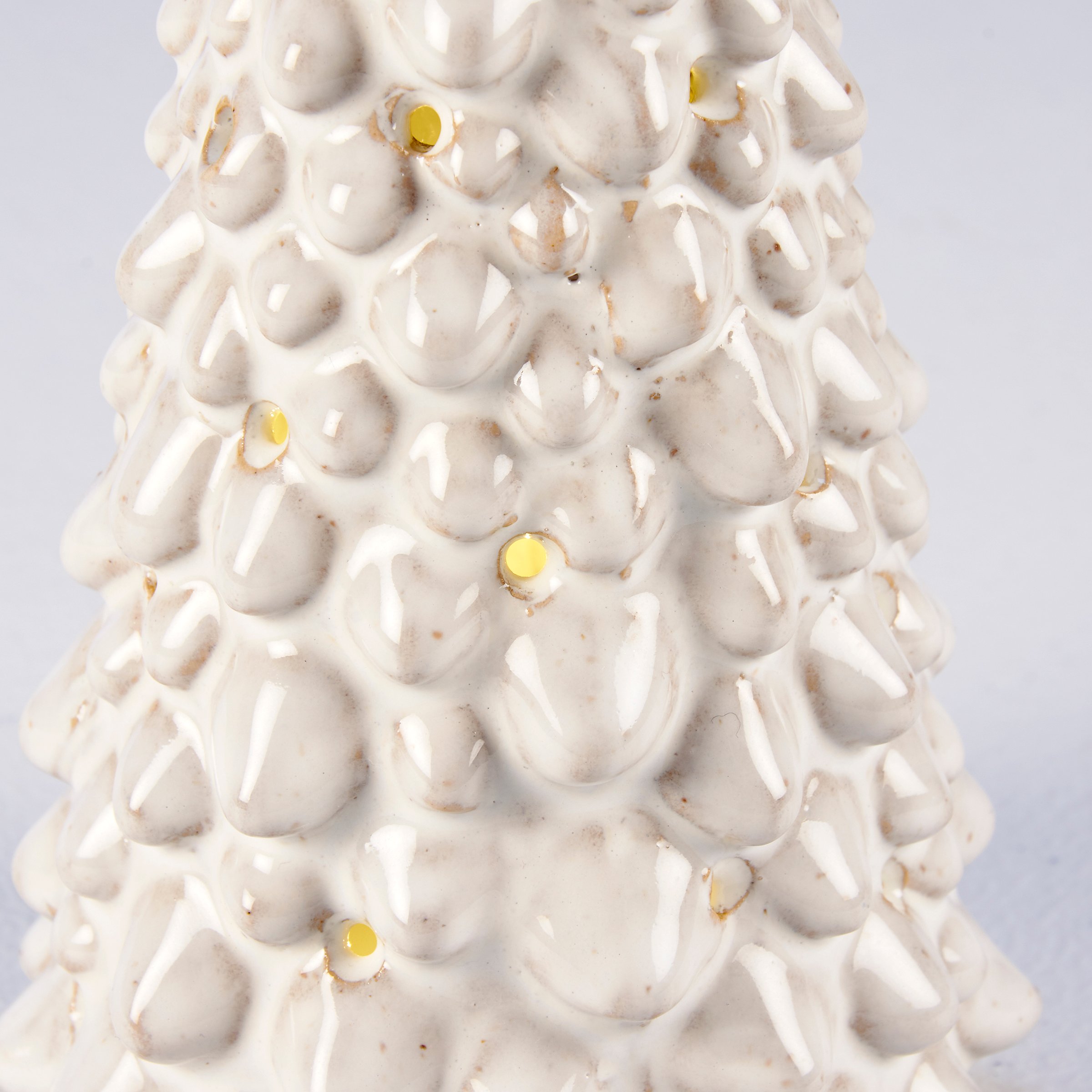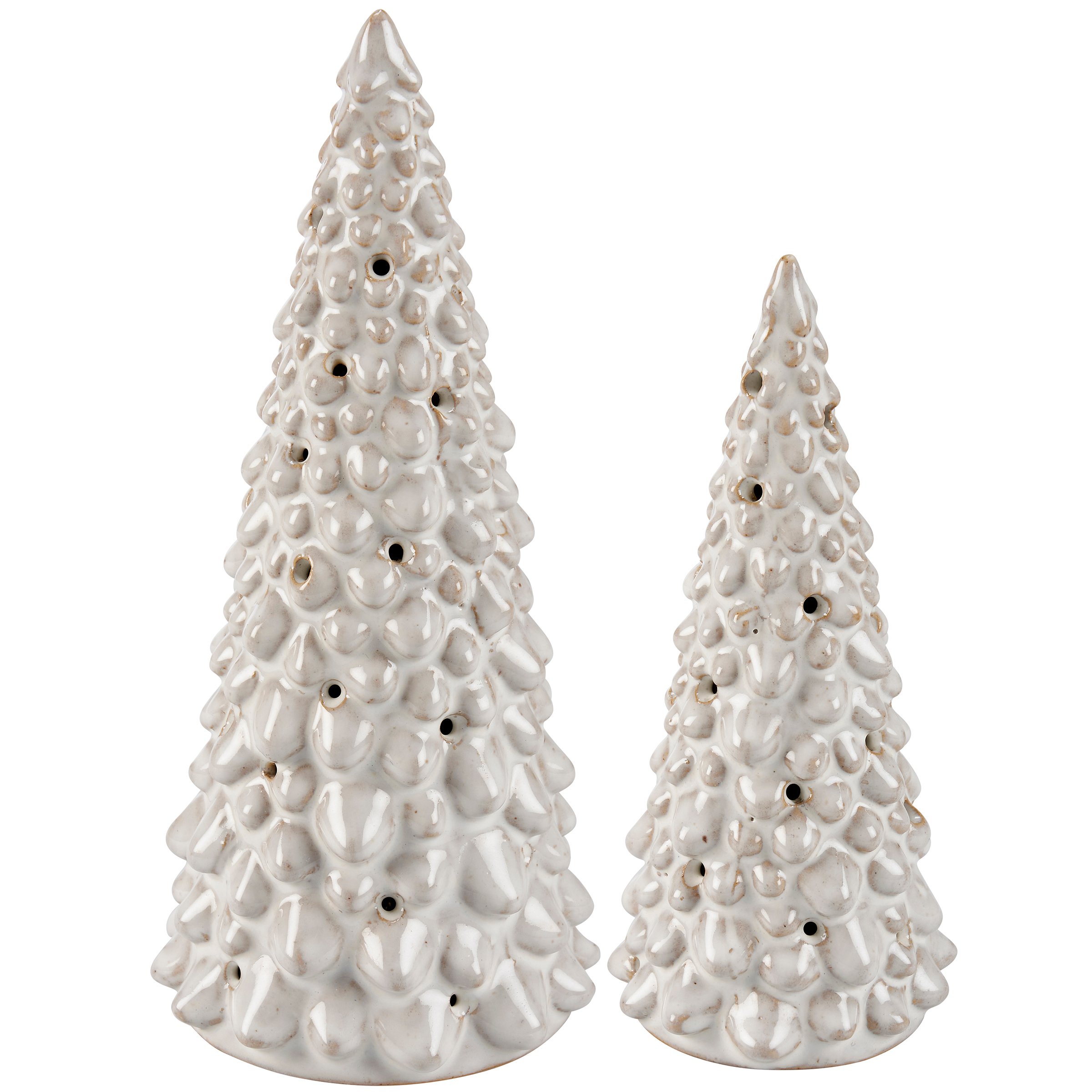 A set of two ceramic trees from our Christmas Collection displaying a snowy cream glaze finish. Trees feature light source inside that illuminates holes throughout each tree to give the appearance of a lighted tree. Our Lighted Christmas tree set can free-stand on flat surface and are powered by 3 LR44 batteries. A set of rustic home accents perfect for seasonal displays.