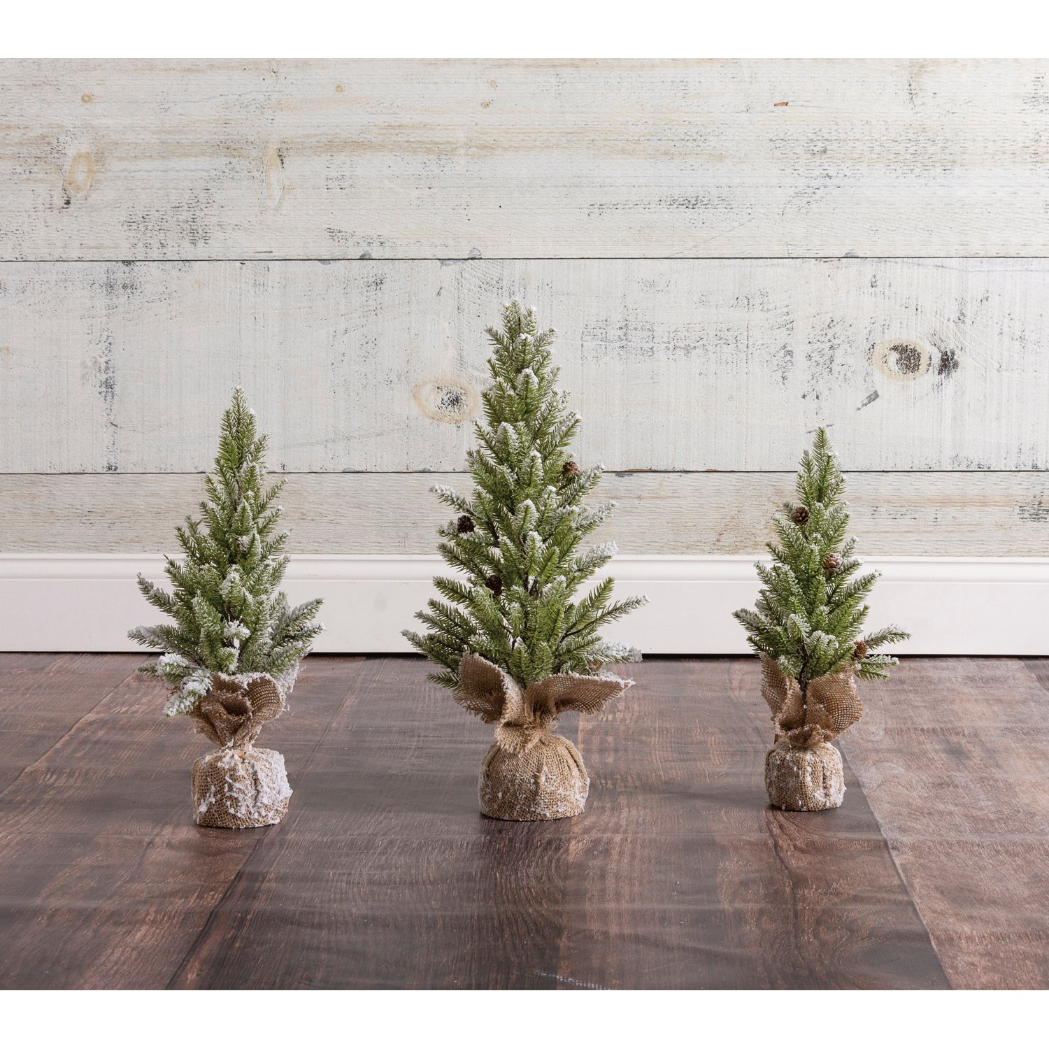 A standing bristle tree featuring flocked accents for a snowy effect. 16" tall with a burlap covered base.