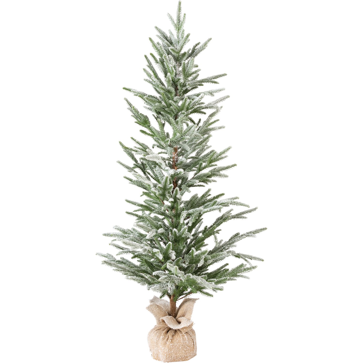 A standing bristle tree featuring flocked accents for a snowy effect. 60" tall with a burlap covered base.
