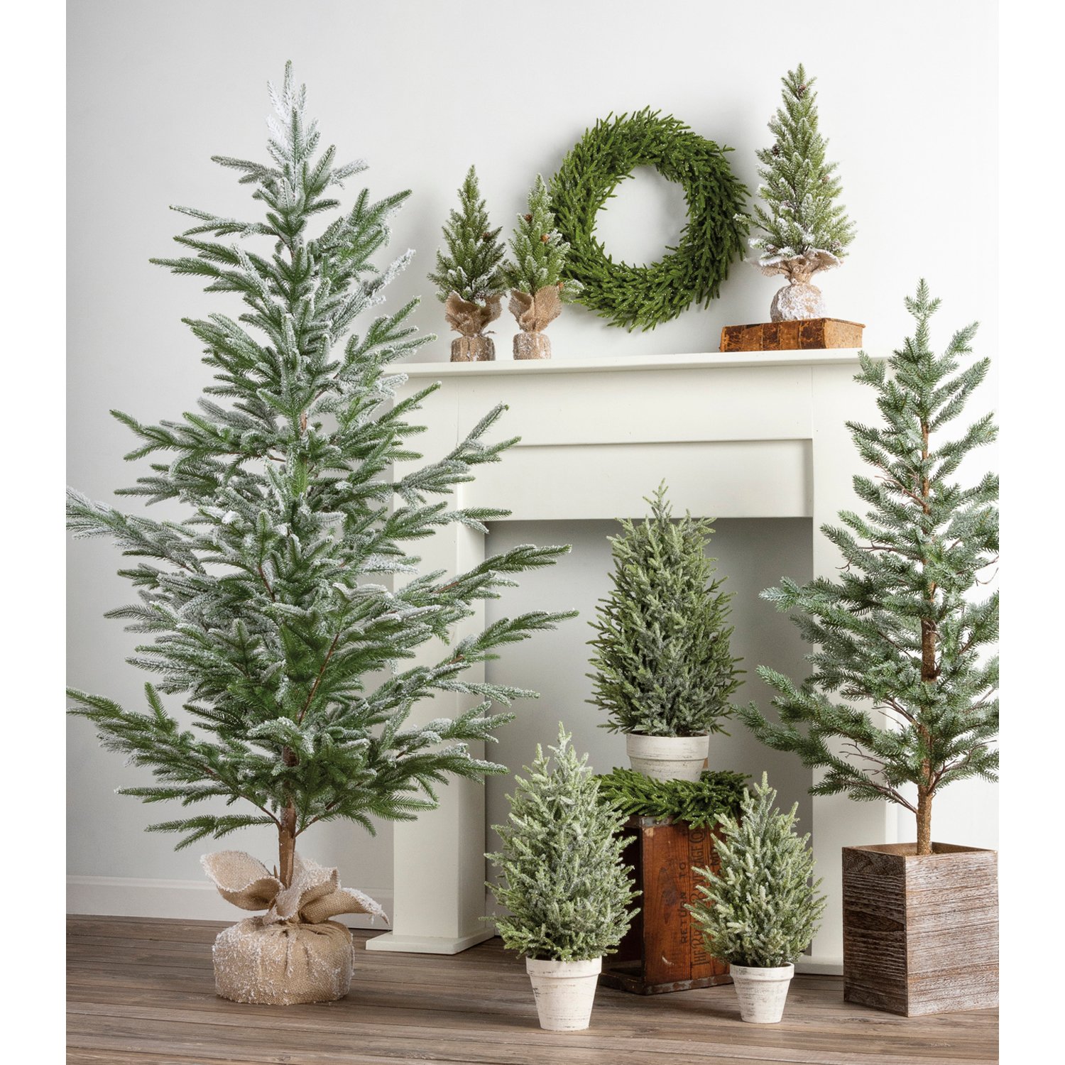 A standing bristle tree featuring flocked accents for a snowy effect. 72" tall with a burlap covered base.