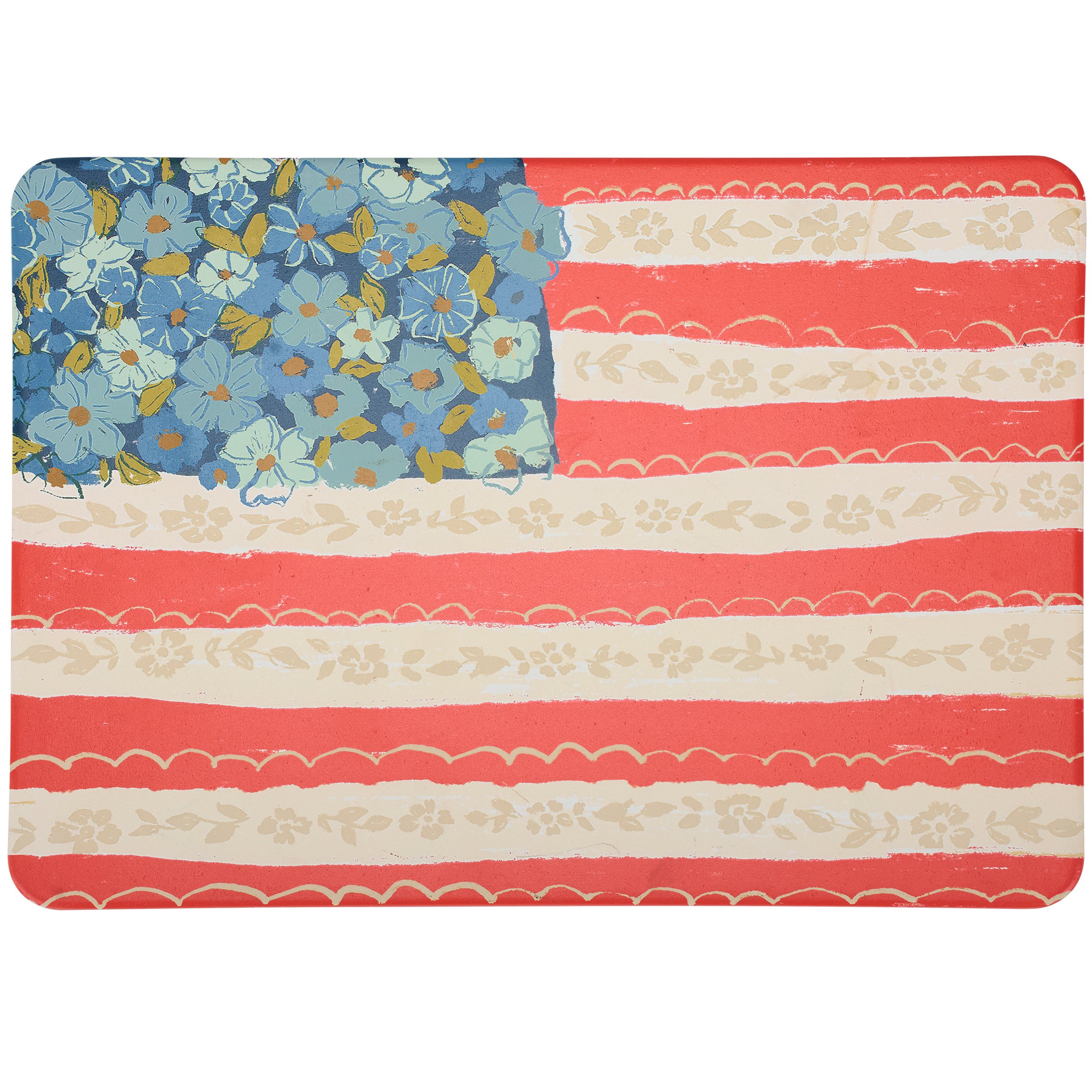 A stone trivet from our Patriotic Collection displaying a folk art inspired design of an American flag featuring floral details. Floral flag design is replicated from original art hand painted in a unique watercolor style. Our Floral Flag trivet features a cork base to safely place on kitchen surface. A stylish patriotic kitchen accessory perfect for 4th of July and Memorial Day decorating or celebrating stars and stripes all year round.