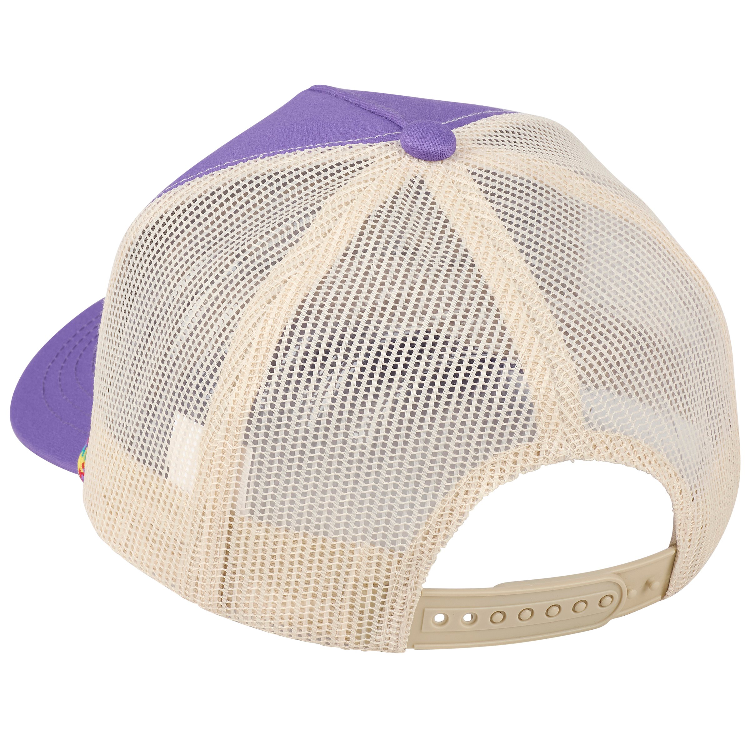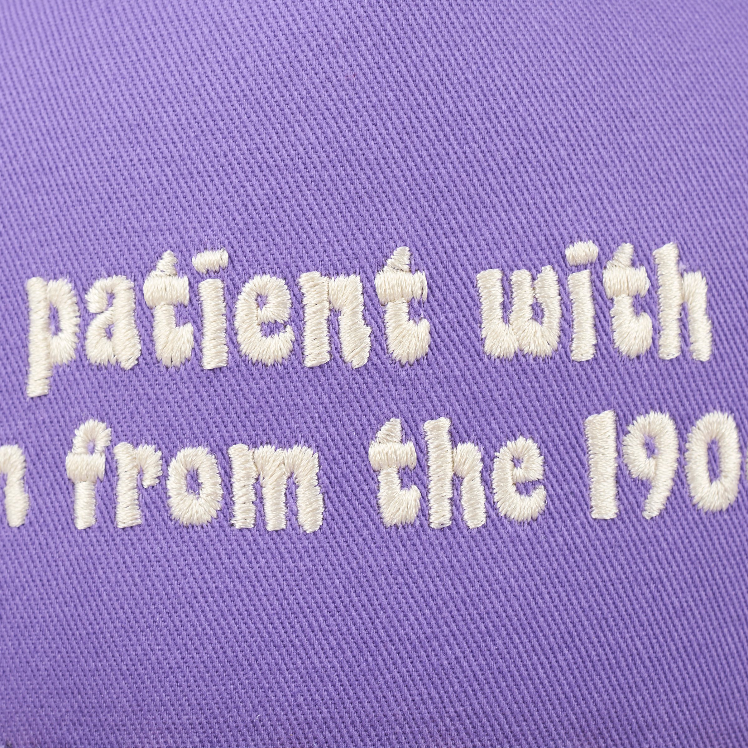 Flaunt your generational privilege with this trucker hat displaying a colorful retro style and a fun relatable sentiment that reads "Please Be Patient With Me I'm From The 1900s." Relatable sentiment is embroidered on purple cotton for eye-catching dimension with a coordinating rainbow color cording accent. Questionables trucker hats are one size fits most with an adjustable snap closure to create the perfect fit and feature a full mesh back for comfort and breathability in hot weather. Hand wash only. Our Be Patient With Me trucker hat calls back to a retro style while also calling out a modern mentality, perfect for everyday self expression or gifting to your favorite aging millennial.