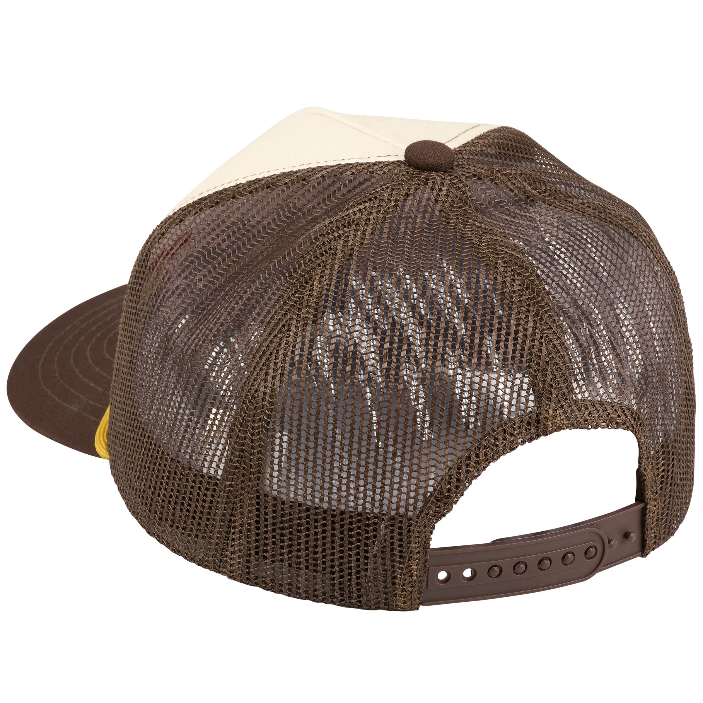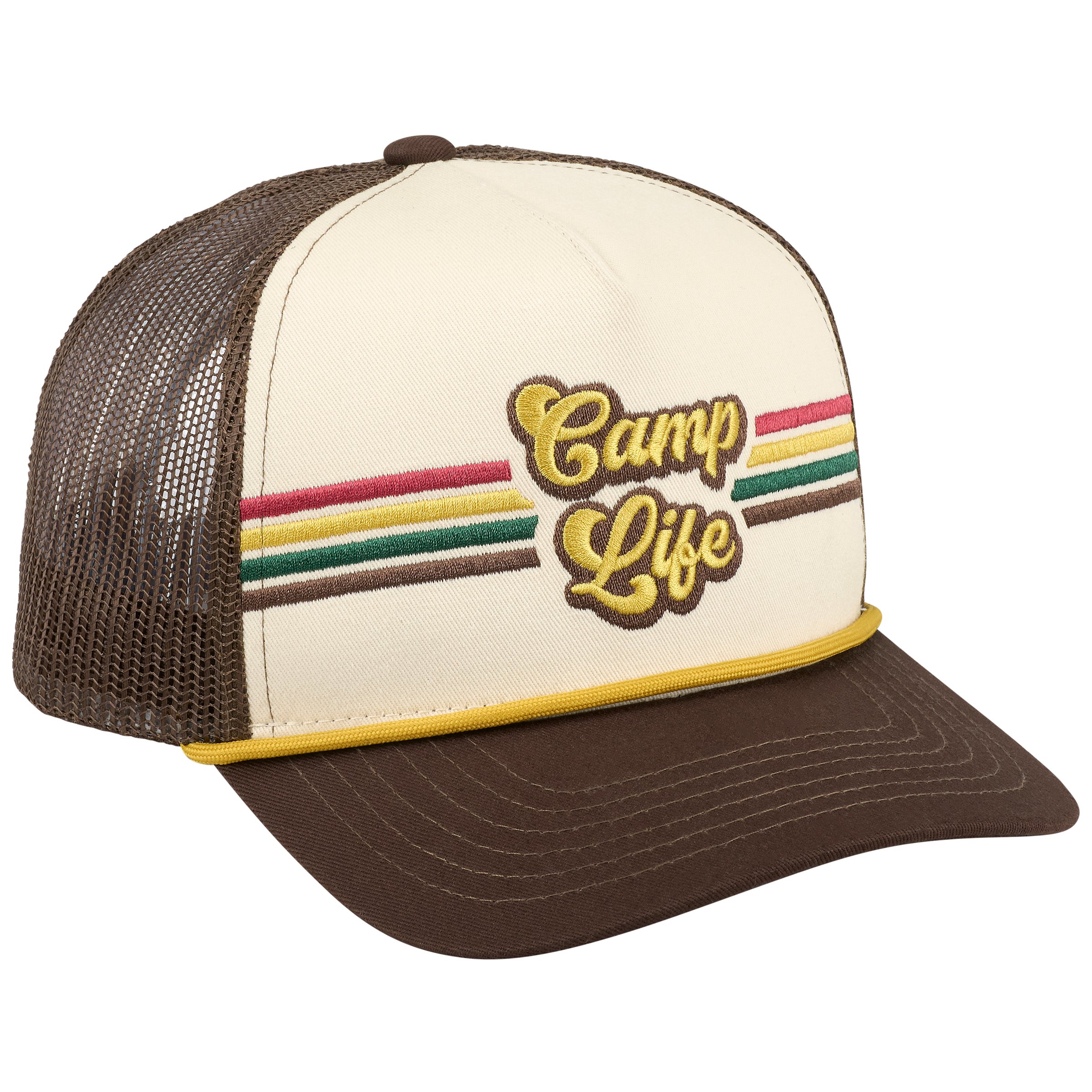 A cotton trucker hat from our Lake & Cabin Collection featuring a vintage summer camp inspired color palette and embroidered design displaying stripes and sentiment that reads "Camp Life." Trucker hat also features a coordinating yellow color cording accent. Our Camp Life trucker hat is one size fits most with an adjustable snap closure to create the perfect fit and full mesh back for comfort and breathability in hot weather. Hand wash only. A fun outdoor accessory great for gifting lovers of camping.