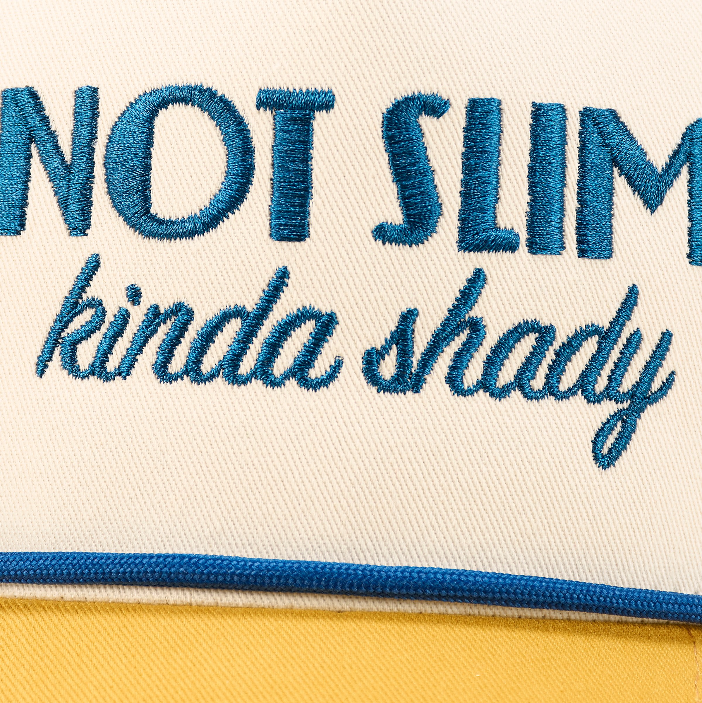 Anyone else done with keeping every little thought to themselves? Let 'em know up front what they're dealing with wearing this trucker hat displaying a sassy sentiment that reads "Not Slim Kinda Shady" in a bold style. This eccentric design is embroidered on cream color cotton for eye-catching dimension with a coordinating blue color cording accent and bold yellow throughout the hat. Questionables trucker hats are one size fits most with an adjustable snap closure to create the perfect fit and feature a full mesh back for comfort and breathability in hot weather. Hand wash only. Our Kinda Shady trucker hat demands attention making it perfect for everyday expression.