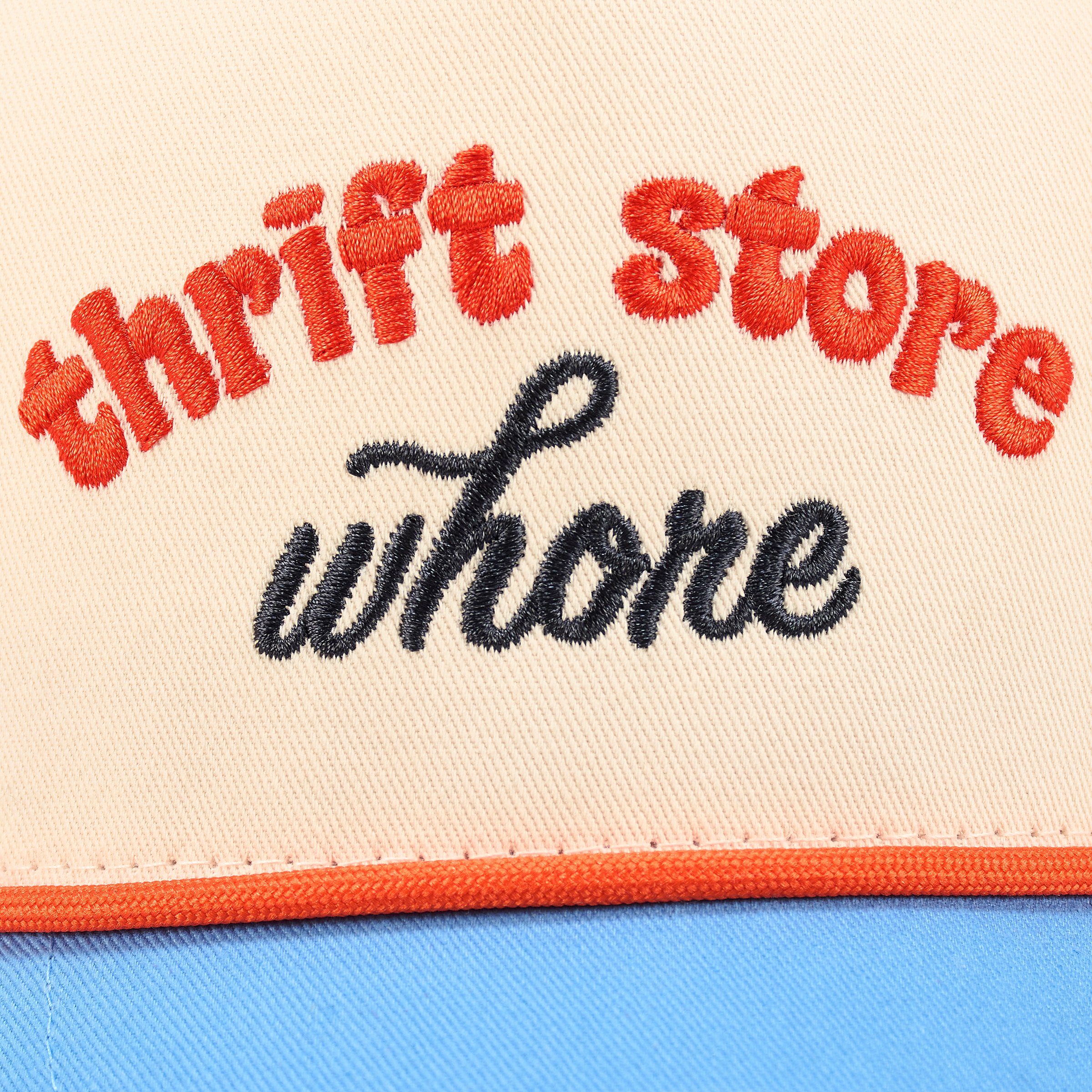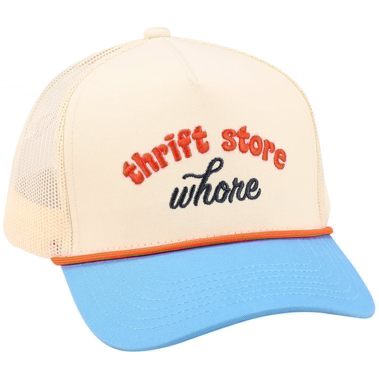 They'll be thriftin' in style with this trucker hat displaying a thrift shopping inspired sentiment that reads "Thrift Store Whore" in a fun retro style. This fun thrift design is embroidered on cream cotton for eye-catching dimension with a coordinating orange color cording accent and retro blue color bill. Questionables trucker hats are one size fits most with an adjustable snap closure to create the perfect fit and feature a full mesh back for comfort and breathability in hot weather. Hand wash only. Our Thrift Store trucker hat calls back to a retro style while also calling out a modern mentality, perfect for everyday expression and posting pics of your thrift store haul.