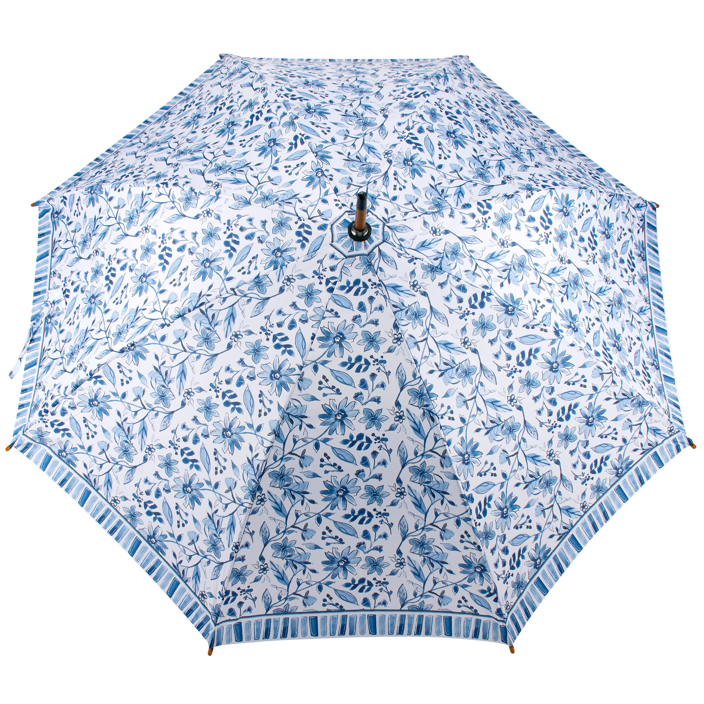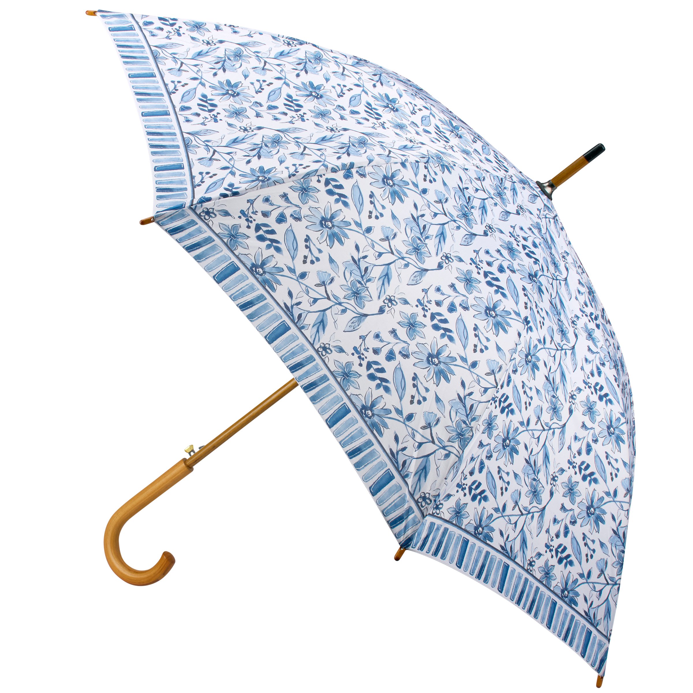 A stylish umbrella from our Indigo Collection displaying a pattern of flowers in a calming indigo color palette on the canopy. Floral pattern is replicated from original art hand painted in a unique watercolor style. This floral umbrella features a durable curved wooden handle with easy to open canopy and push button to collapse and tie shut with coordinating strap. Our Blue Florals umbrella canopy features a spread of over 40 inches for plenty of coverage from the weather. A stylish floral themed accessory that is great for gifting.