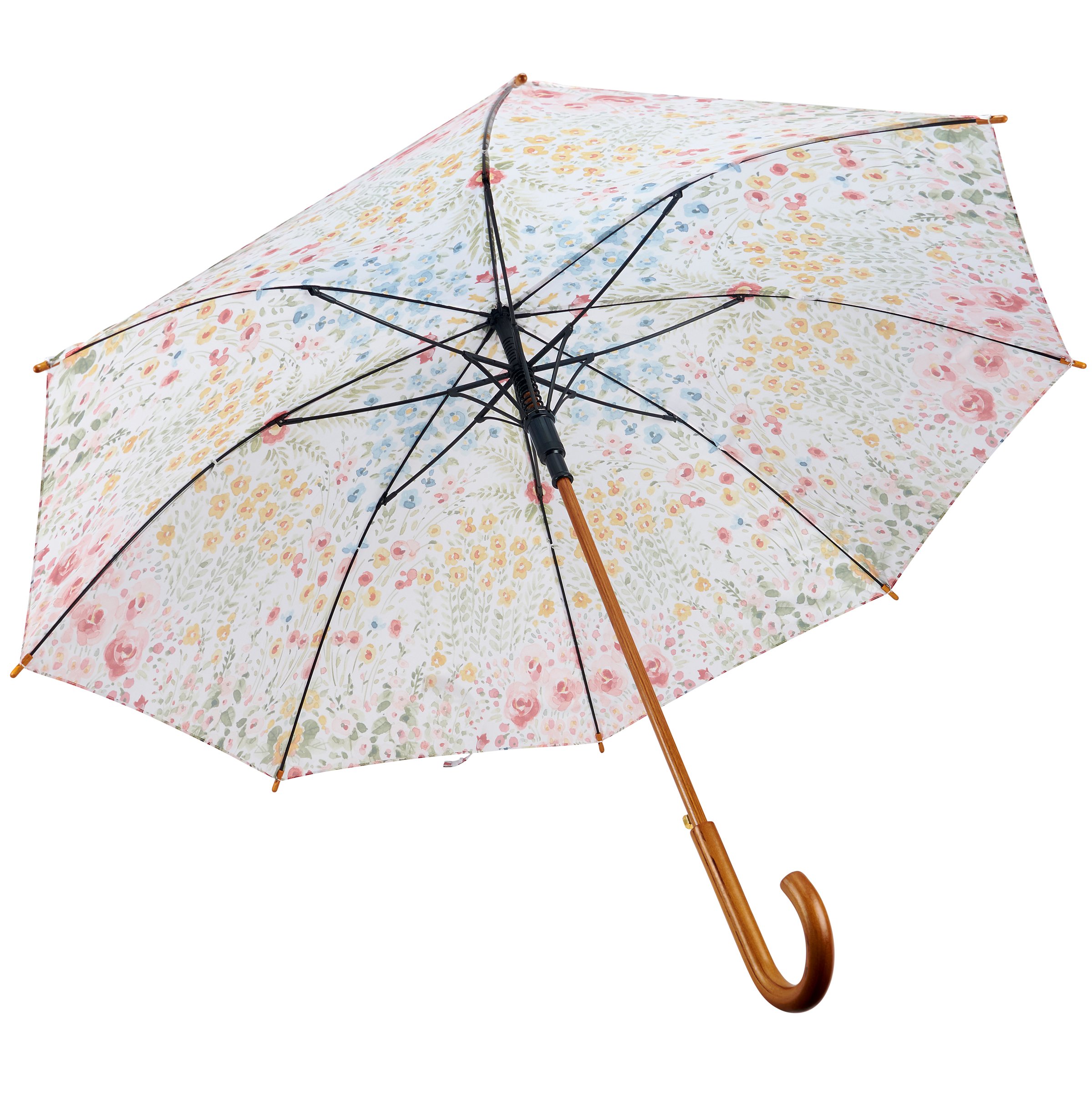 A stylish umbrella from our Watercolor Collection displaying full color designs of mixed floral inspired by nature on the canopy. Floral designs are replicated from original art hand painted in a delicate watercolor style.The Floral umbrella is a classic design featuring a durable curved wooden handle with easy to open canopy and push button to collapse and tie shut with coordinating strap. Our Mixed Floral umbrella canopy features a spread of over 40 inches for plenty of coverage from the weather. A nature-themed accessory that is great for gifting.