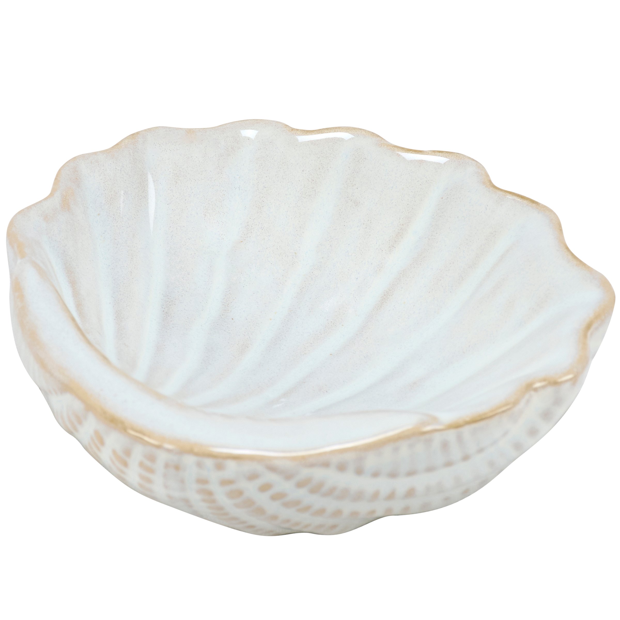 A ceramic vanity tray from our Beach Collection displaying a sculpted clamshell design with cream glaze and raw ceramic accents. Our Clamshell vanity tray is perfect for holding daily keepsakes. Accessories pictured not included. A beach-themed home accent great for gifting.