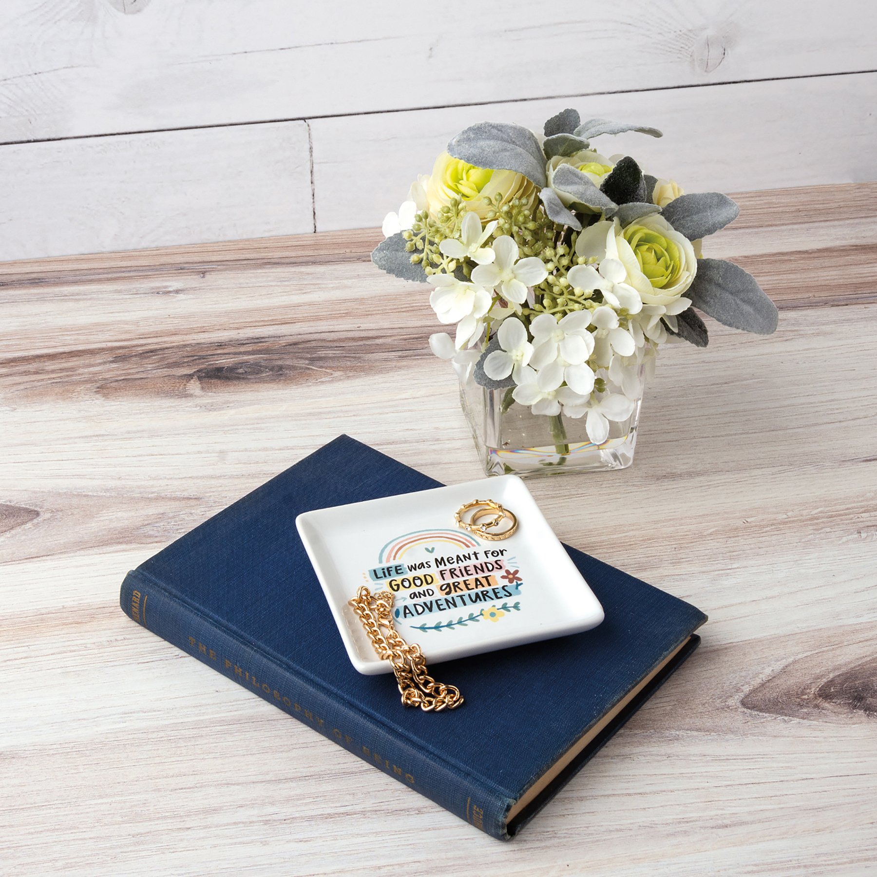 A glossy white stoneware vanity tray featuring vibrant rainbow and floral designs with "Life Was Meant For Good Friends And Great Adventures" sentiment. Our Good Friends vanity tray is dishwasher safe.