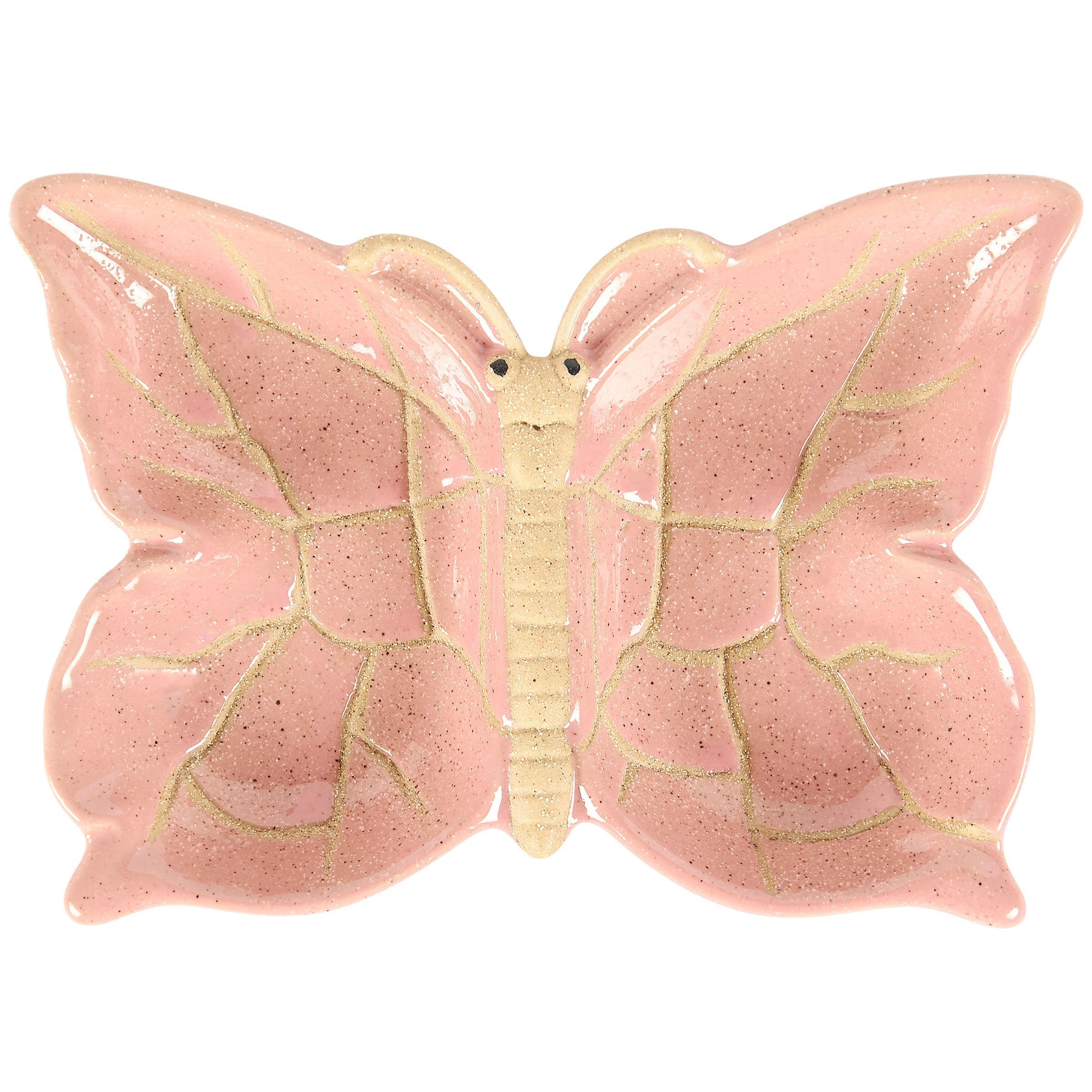 A ceramic vanity tray from our Art Nouveau Collection displaying a sculpted butterfly design with painted details and speckled pink glaze finish. Our Pink Butterfly vanity tray is perfect for holding daily keepsakes. Accessories pictured not included. A vintage nature-themed home accent great for gifting.