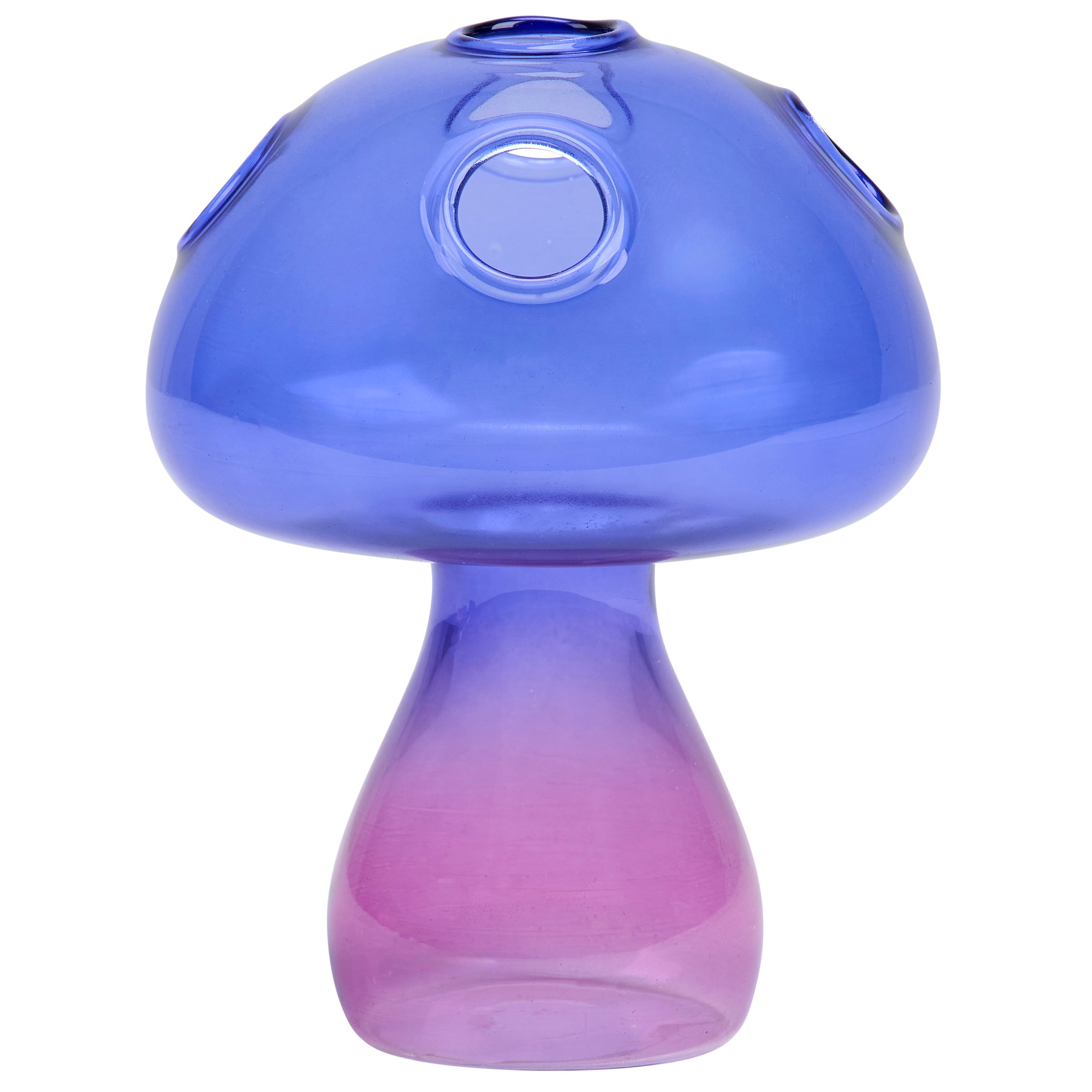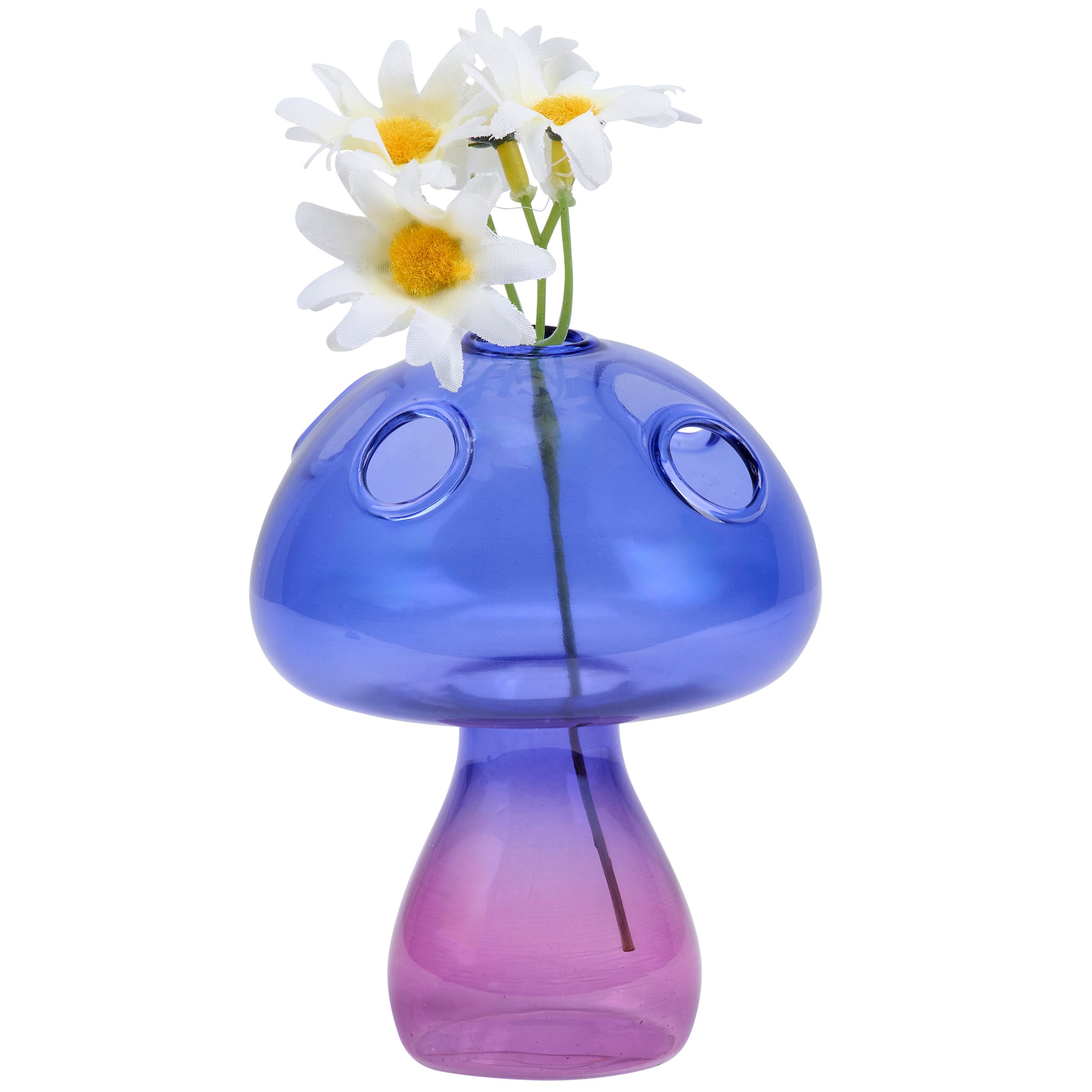 Add natural style to any space with this vase featuring a standing mushroom design made from sculpted glass in a gradient blue color. Our Blue Mushroom vase features openings on top to place stemmed florals of choice to create a unique display. Greenery pictured not included. A stylish nature themed home accent with a variety of display options.