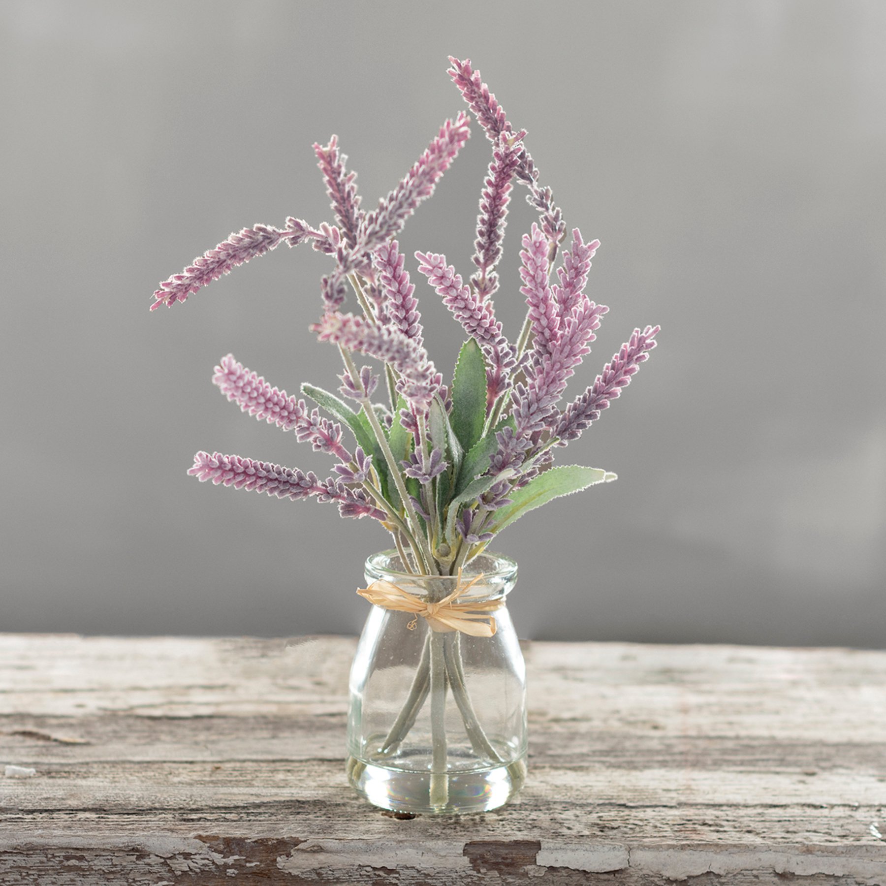 A small glass vase featuring a lavender bouquet from our Botanical Collection. Contains a silicone bottom fill to resemble water. Complements well with coordinating pieces in collection for a charming indoor garden.