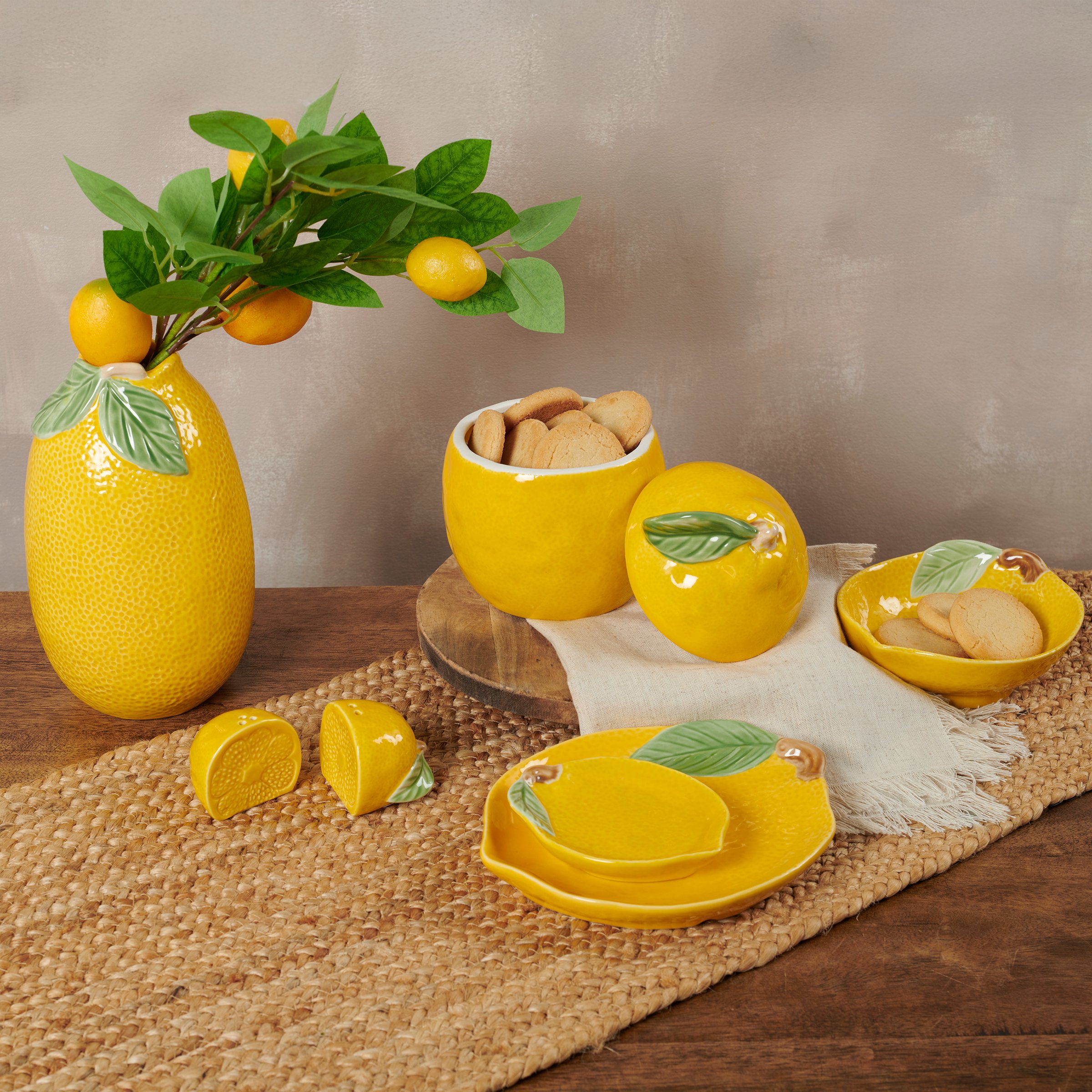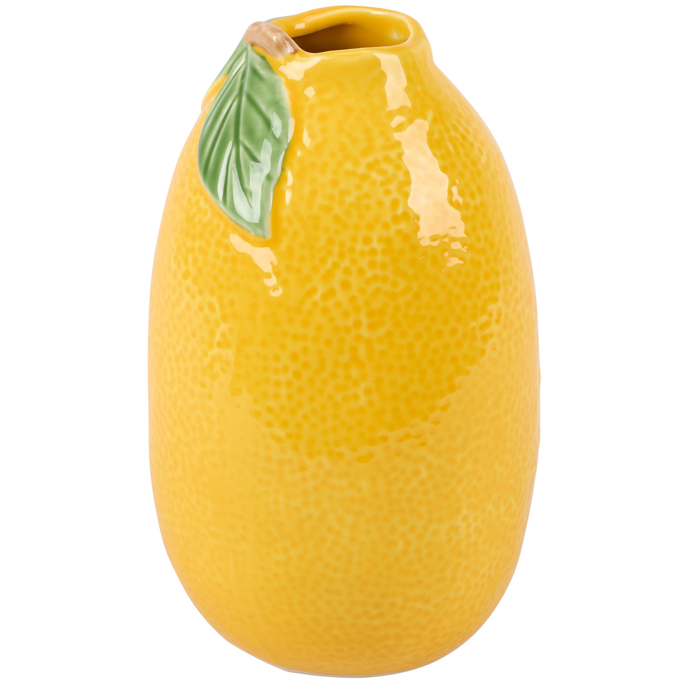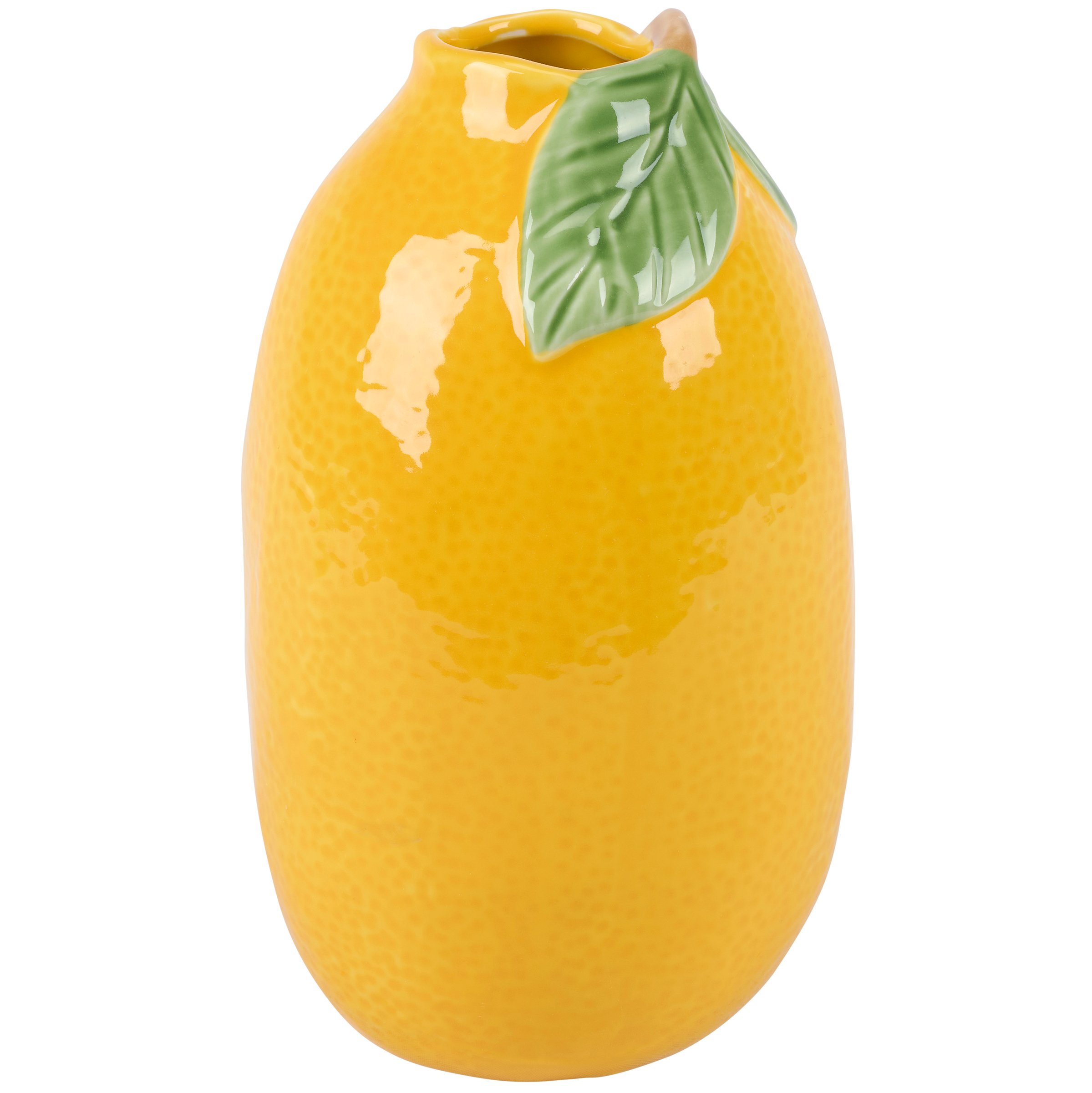 A stoneware vase from our Garden Collection displaying a lemon inspired design with textured glaze finish and sculpted leaf details to resemble the features of a lemon. Our Lemon vase features opening on top to place stemmed florals. Greenery pictured not included. A fun lemon-themed home accent with a variety of display options.