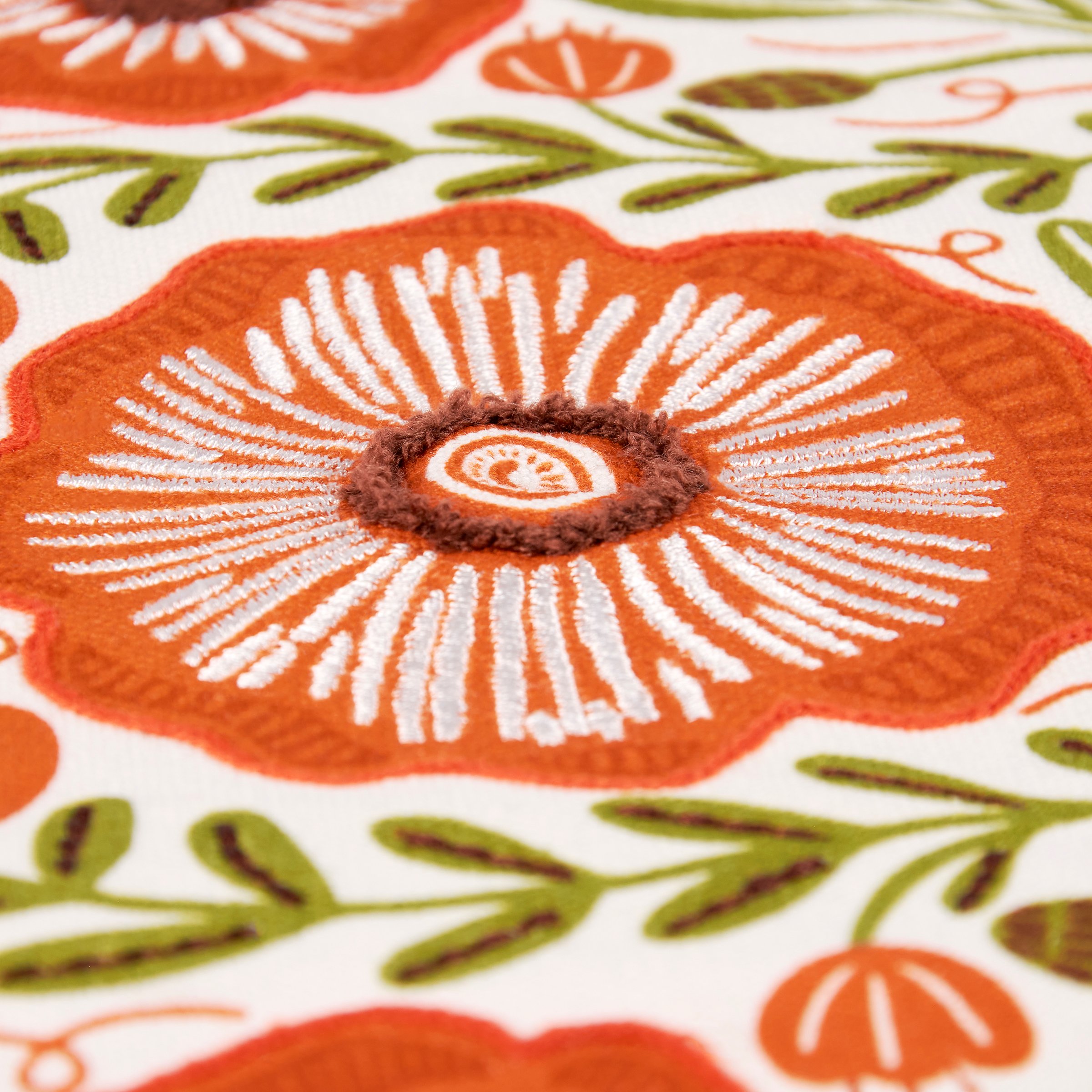A canvas wall banner from our Folk Art Collection displaying hand illustrated designs of poppies inspired by folk art with embroidered accents for added texture. Wall banner features stitched border details and a large size for a nature-themed statement piece. Our Poppies Folk Art wall banner is easy to hang using the metal grommets on the corners. A rustic floral-themed home accent perfect for everyday display.
