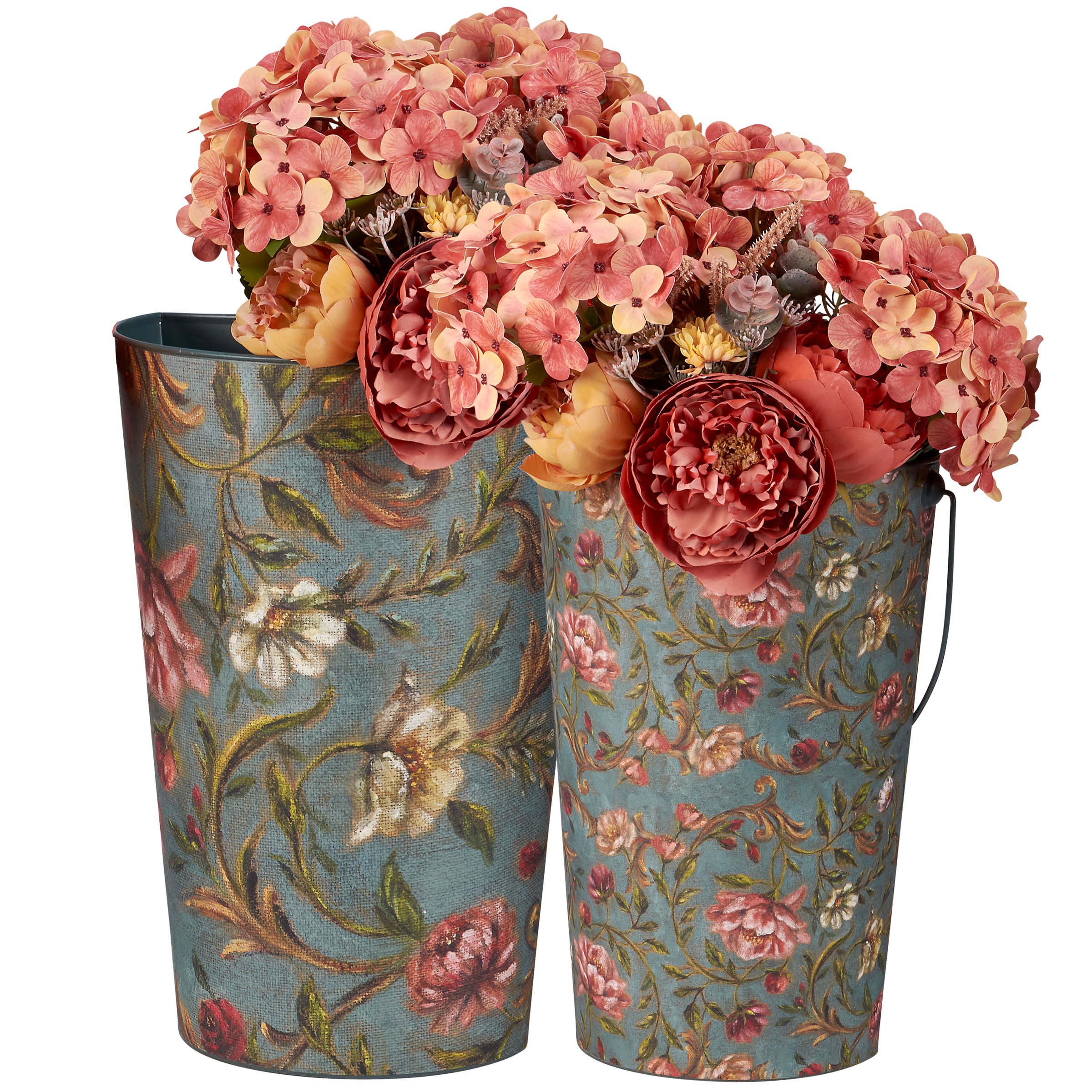 A set of metal wall buckets from our Art Nouveau Collection displaying art nouveau inspired designs of florals. Designs are replicated from original artwork painted onto burlap canvas, giving the art a unique depth and texture. Wall bucket set includes two buckets in different sizes that nest inside each other for convenient storage. Our Floral Nouveau wall bucket set features a flat back and metal handle with a small groove at the top for easy hanging. Buckets can also free-stand on a flat surface for display. Greenery pictured not included. A set of vintage home accents with a variety of display options.