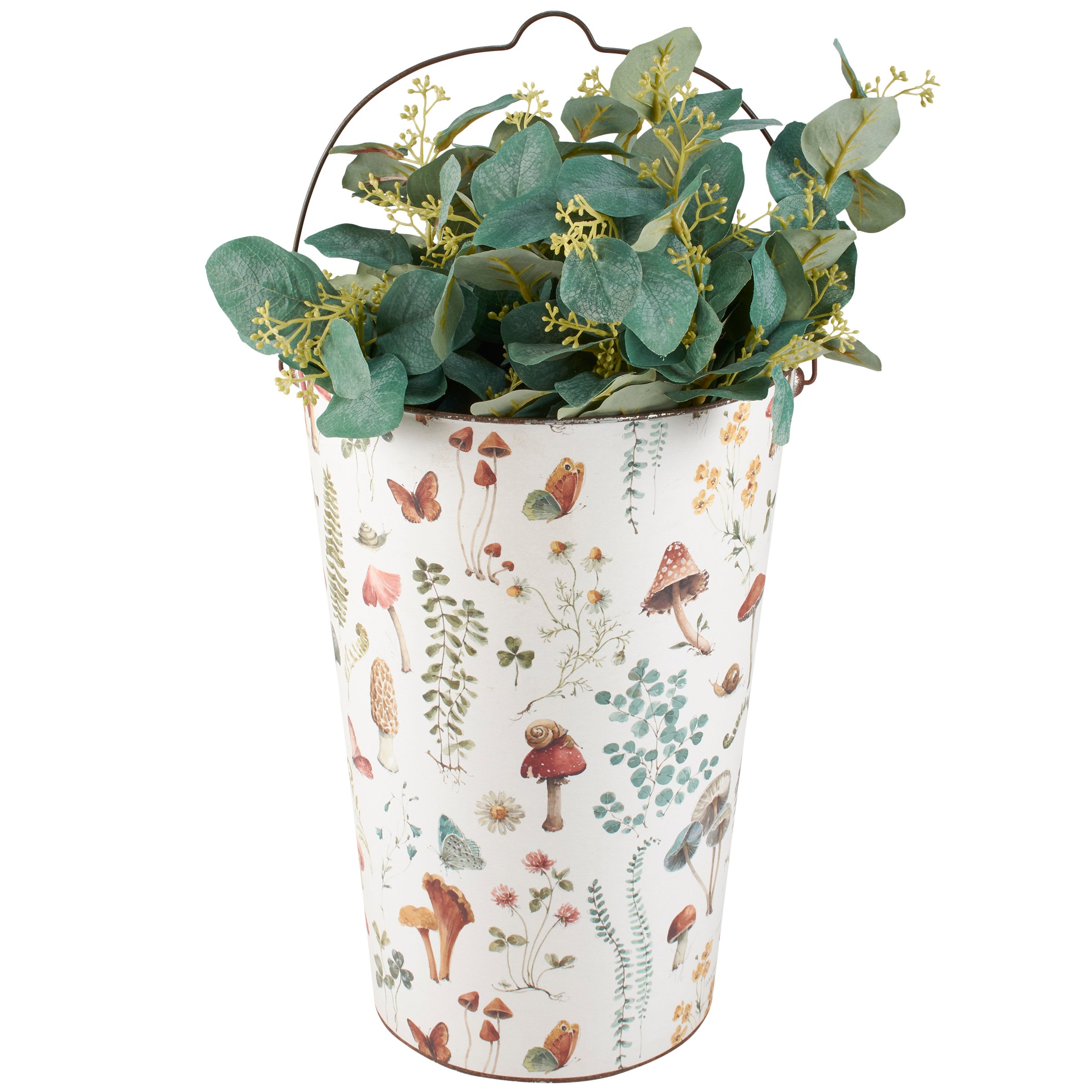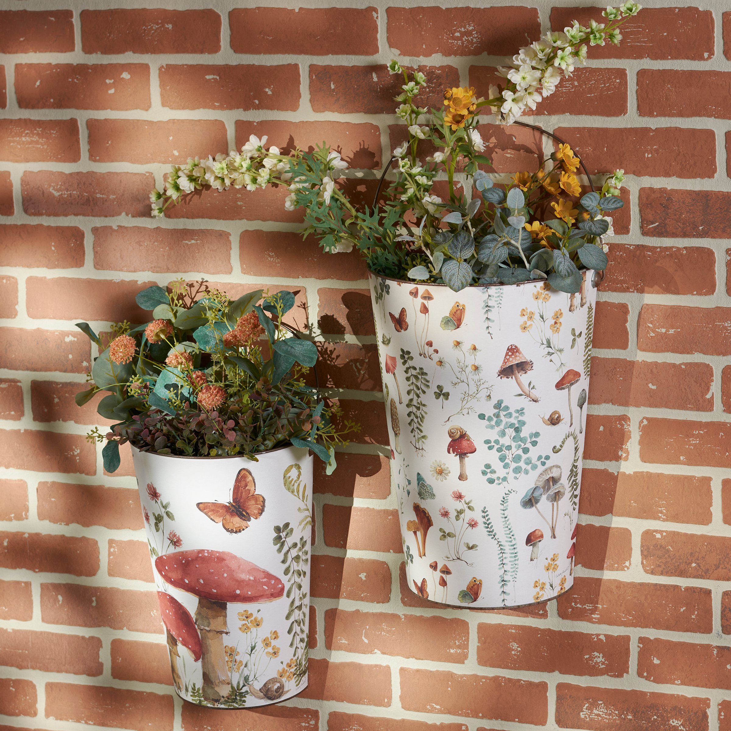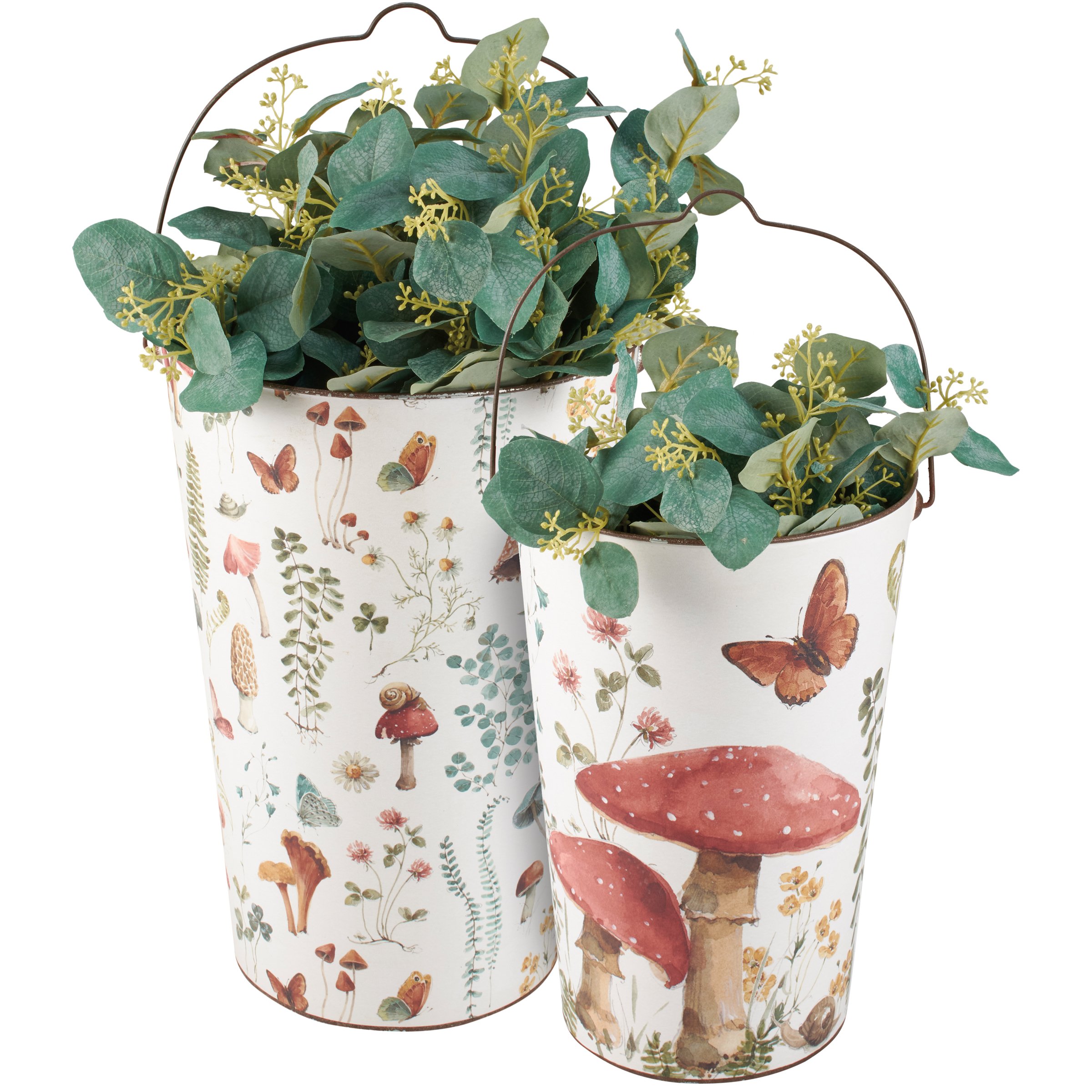 A set of metal wall buckets from our Cottagecore Collection displaying hand painted nature-themed designs on each. Designs feature large mushrooms with butterfly and snail on one bucket and pattern of mushrooms, flowers, butterflies, and snails on the other. Set includes two buckets in different sizes that nest inside each other for convenient storage. Our Mushrooms wall bucket set features a flat back and metal handle with a small groove at the top for easy hanging. Buckets can also free-stand on a flat surface. Greenery pictured not included. A rustic home accent perfect for everyday displays.