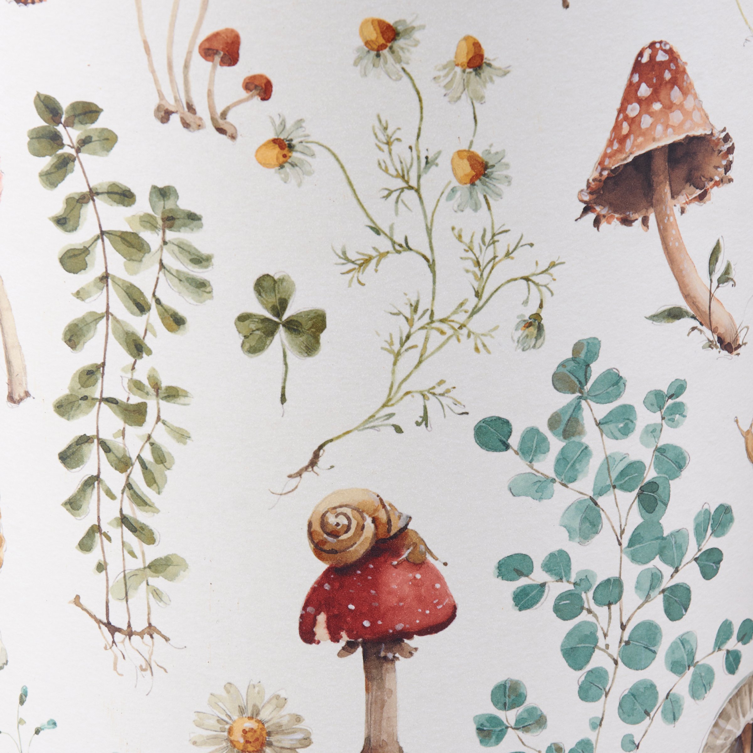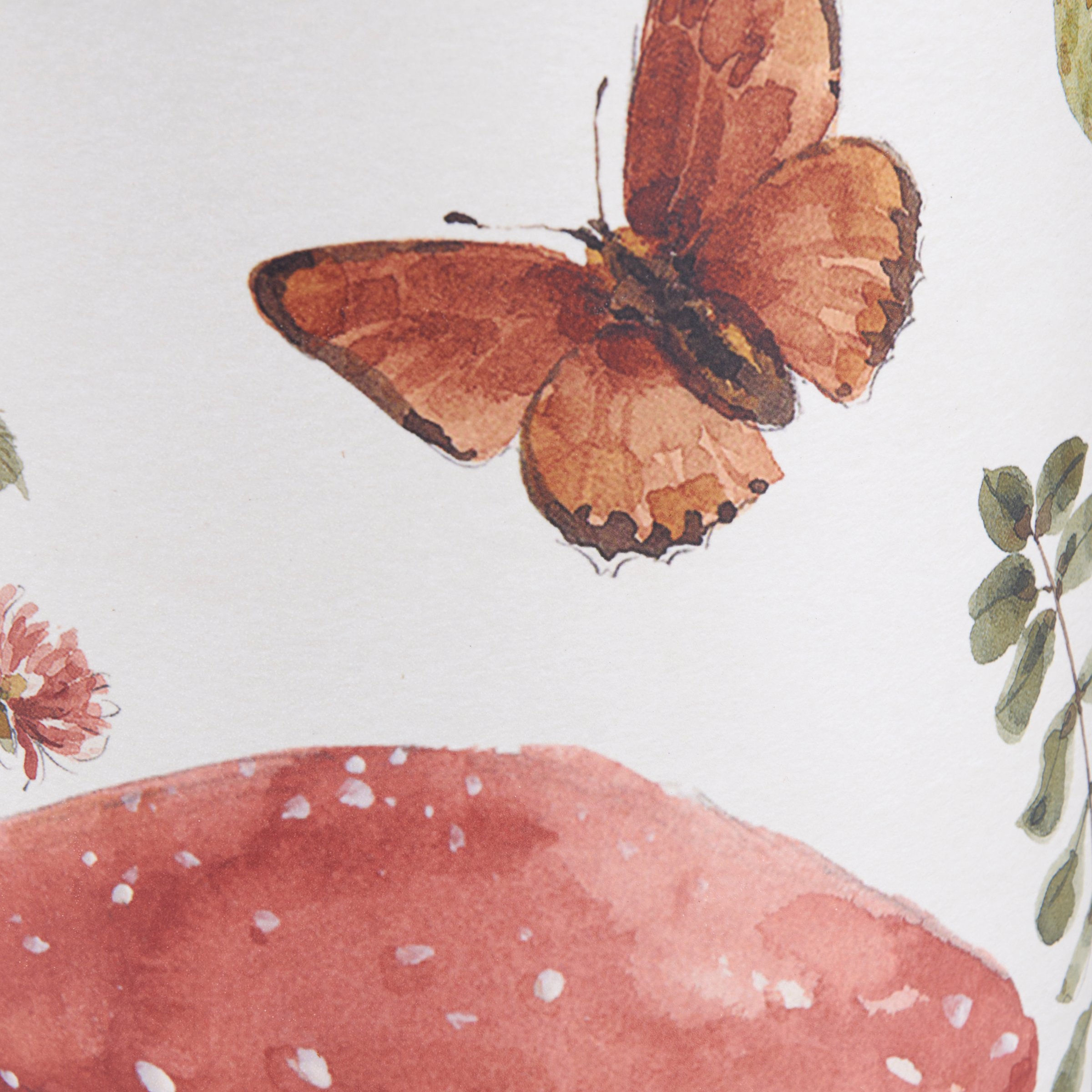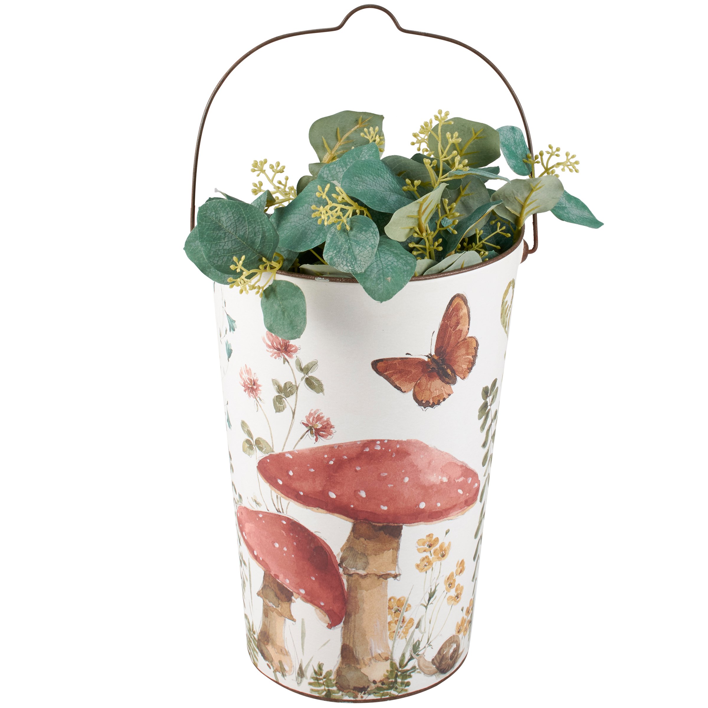 A set of metal wall buckets from our Cottagecore Collection displaying hand painted nature-themed designs on each. Designs feature large mushrooms with butterfly and snail on one bucket and pattern of mushrooms, flowers, butterflies, and snails on the other. Set includes two buckets in different sizes that nest inside each other for convenient storage. Our Mushrooms wall bucket set features a flat back and metal handle with a small groove at the top for easy hanging. Buckets can also free-stand on a flat surface. Greenery pictured not included. A rustic home accent perfect for everyday displays.