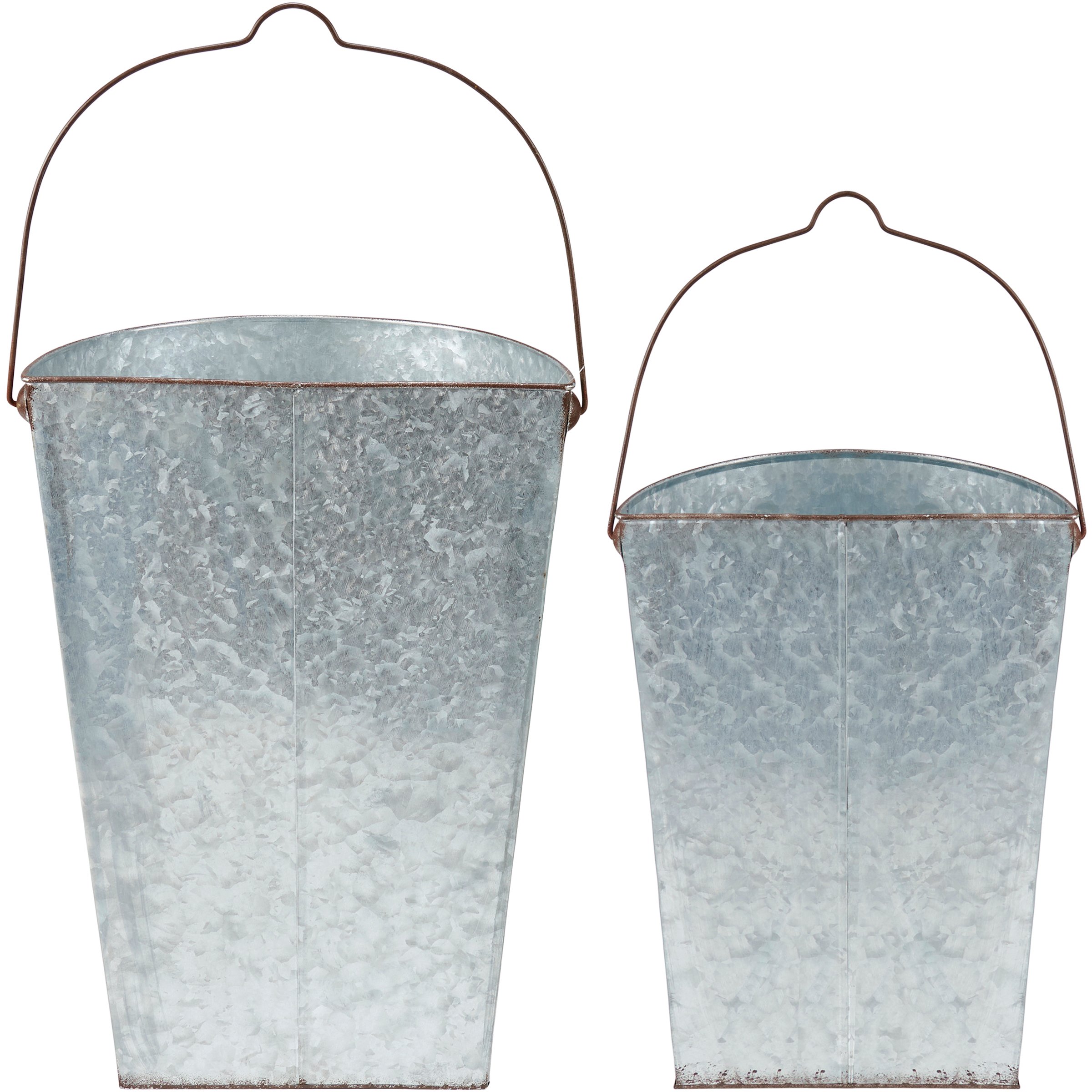 A set of metal wall buckets from our Christmas Collection displaying hand painted winter-themed designs with inspirational sentiments on each. Designs feature birds on winter branches surrounding a "Winter Blessings" sentiment on one bucket and a "Warm Winter Wishes" sentiment on the other. Set includes two buckets in different sizes that nest inside each other for convenient storage. Our Winter Blessings wall bucket set features a flat back and metal handle with a small groove at the top for easy hanging. Buckets can also free-stand on a flat surface. Greenery pictured not included. A rustic home accent perfect for seasonal displays.