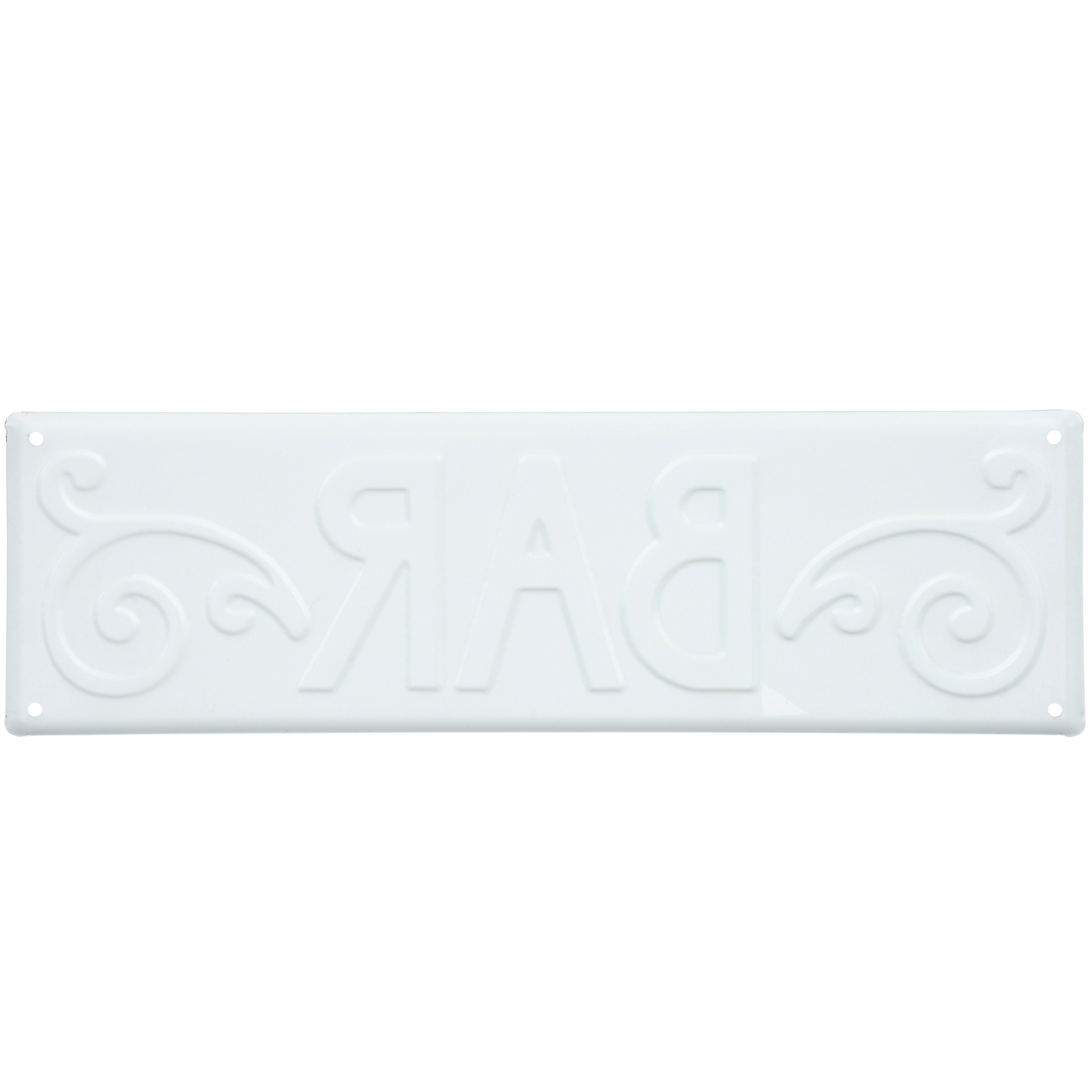 A metal wall décor piece from our Art Deco Collection featuring an elegant black and white bar sign design displaying a bold "Bar" sentiment and graphic accents. Bar sign features embossed details for added dimension. Our Bar metal wall décor is easy to hang against wall using the included mounting hardware and pre-drilled holes in each corner. A vintage alcohol themed home accent perfect for a home bar.