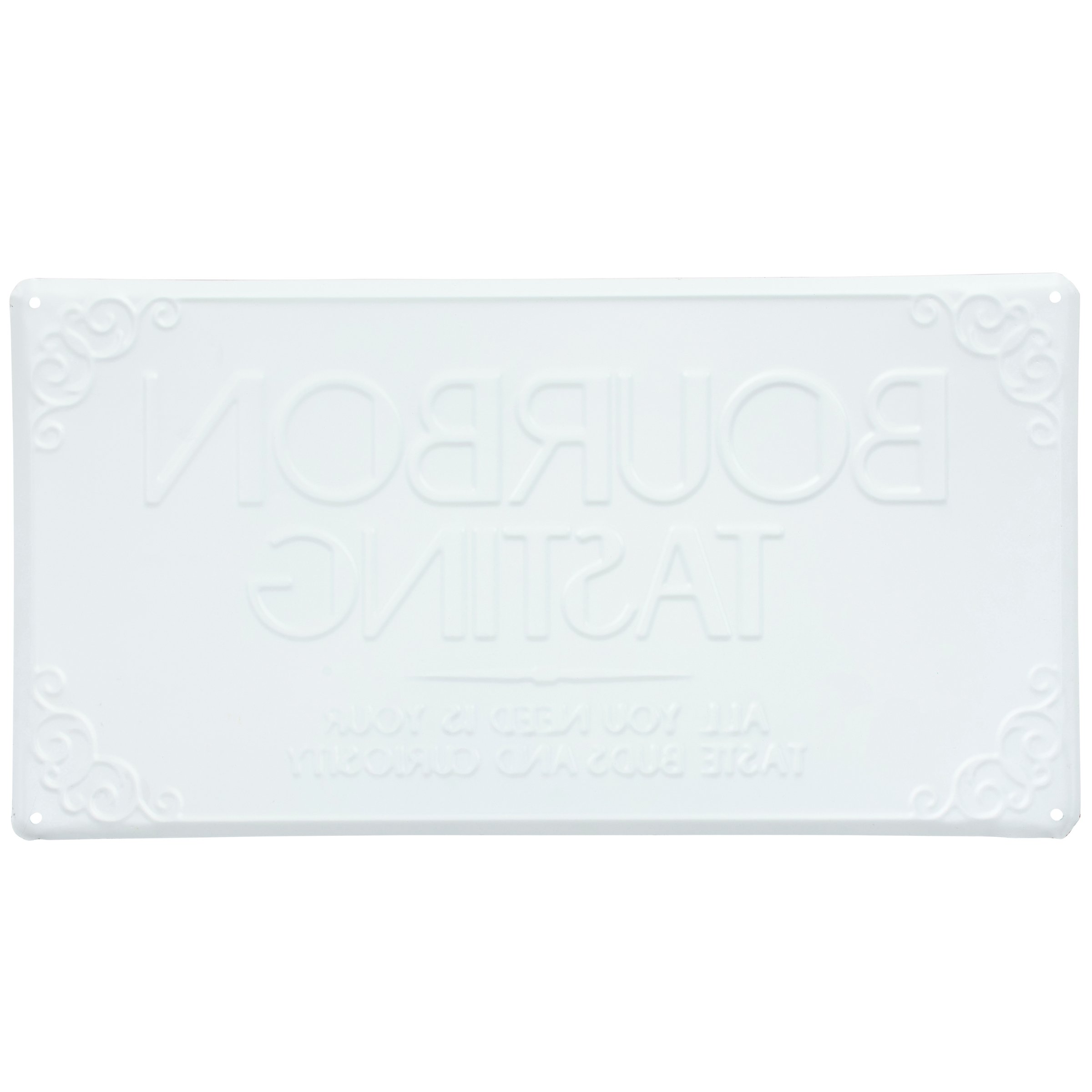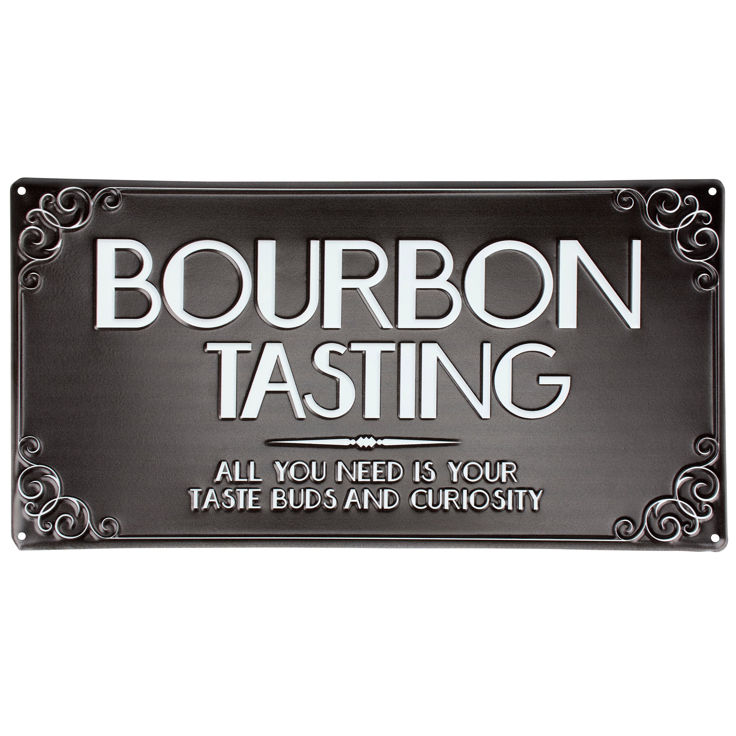 A metal wall décor piece from our Art Deco Collection featuring an elegant black and white bar sign design displaying a bold alcohol themed sentiment that reads "Bourbon Tasting - All You Need Is Your Taste Buds And Curiosity." Bar sign features embossed details for added dimension. Our Bourbon Tasting metal wall décor is easy to hang against wall using the included mounting hardware and pre-drilled holes in each corner. A vintage alcohol themed home accent perfect for a home bar.