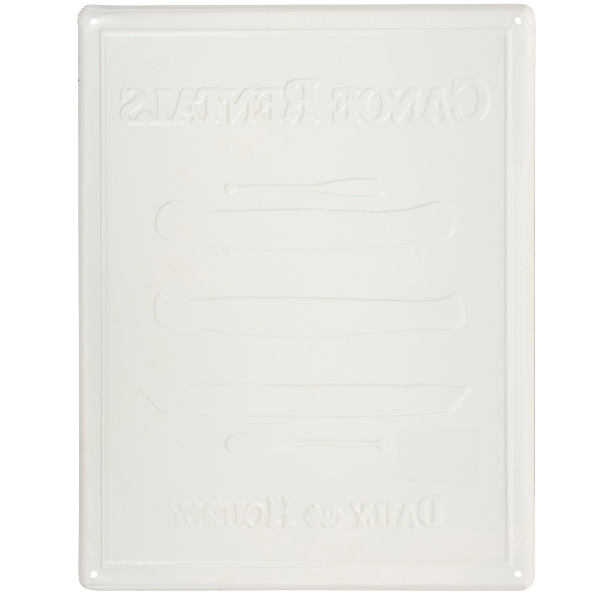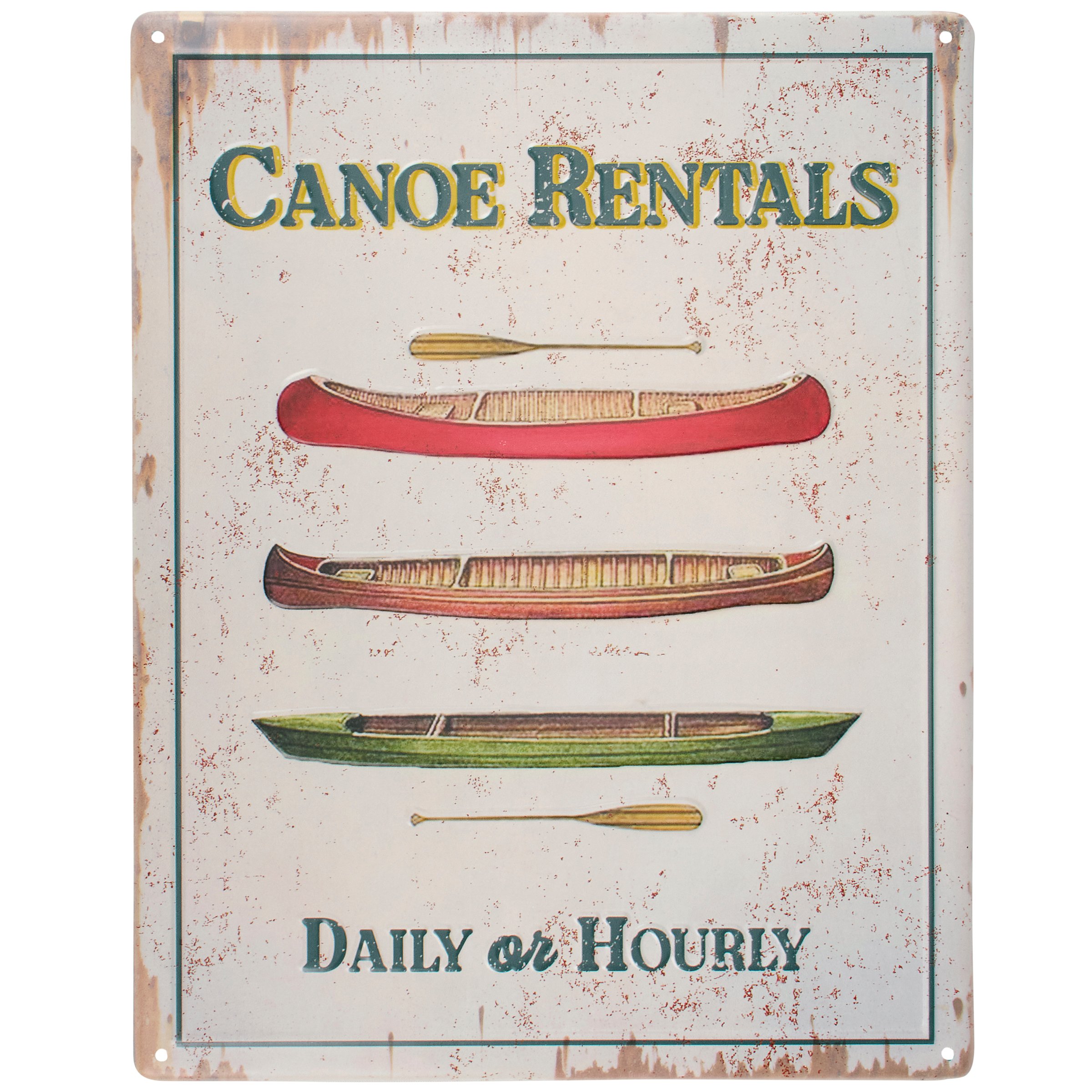 A metal wall décor piece from our Lake & Cabin Collection featuring a rustic camp sign design displaying a "Canoe Rentals - Daily Or Hourly" sentiment with various canoe graphics. Camp sign design features embossed details and a rust finish for an aged appearance. Our Canoe Rentals metal wall décor is easy to hang against wall using the included mounting hardware and pre-drilled holes in each corner. A rustic camping themed home accent that coordinates well with cabin decor.