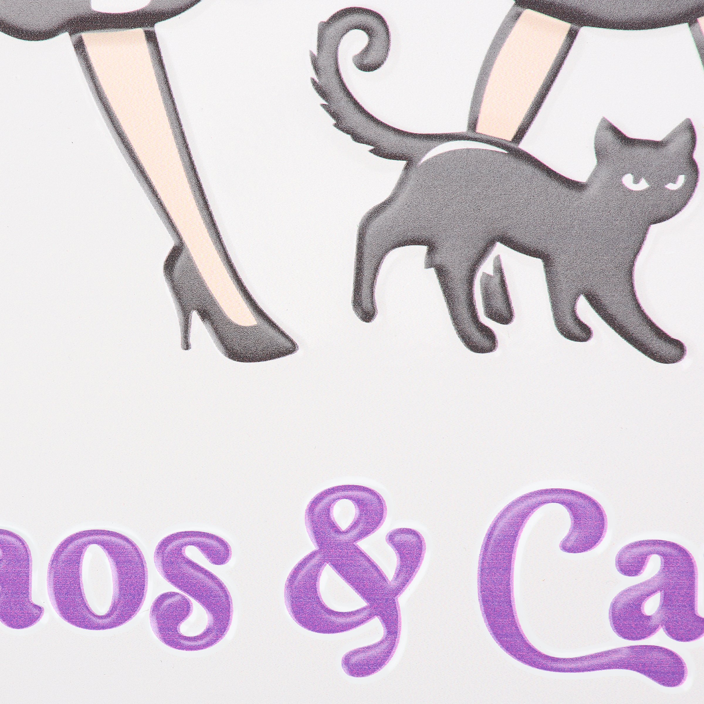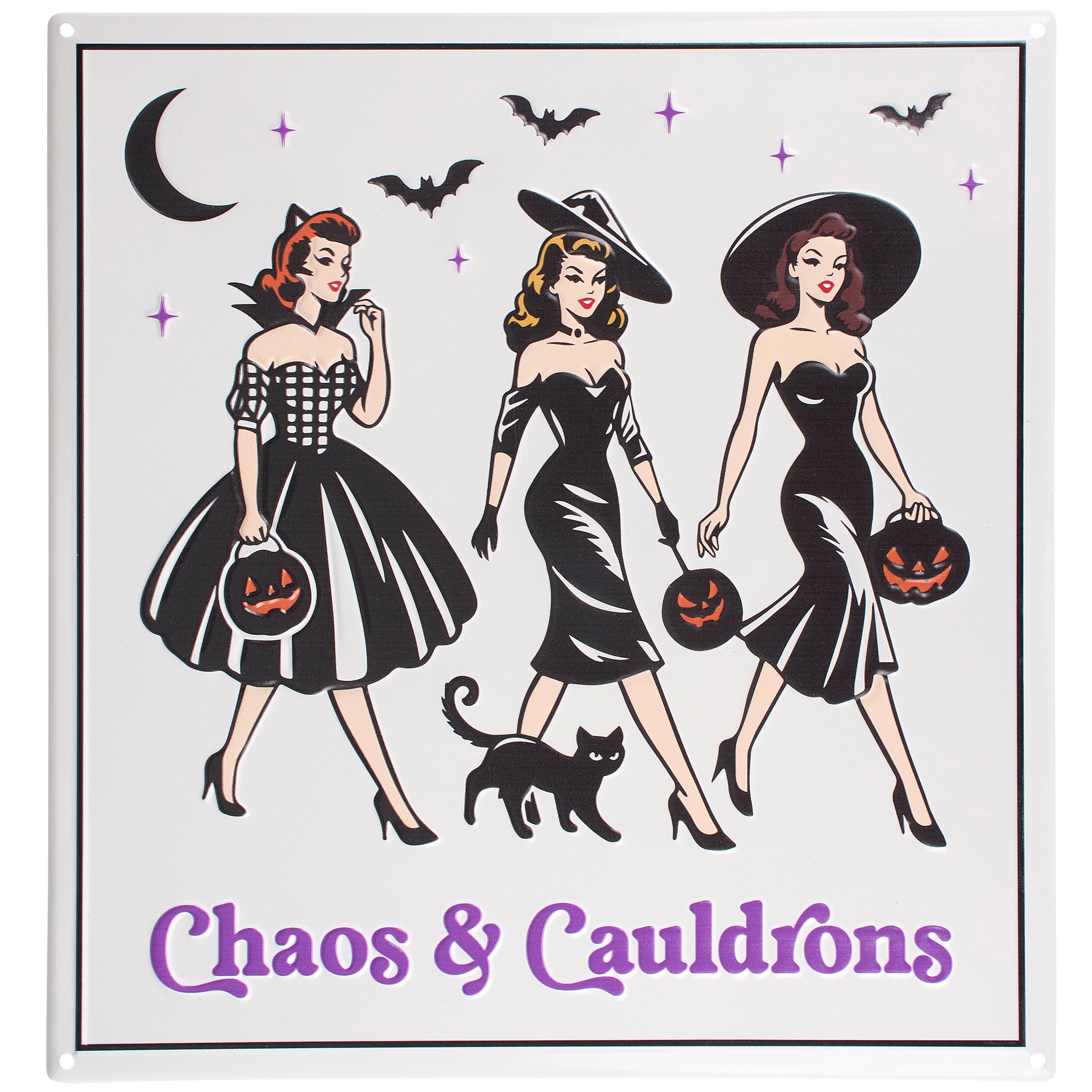 A metal wall décor piece from our Halloween Collection displaying a group of witches in a retro style with a fun witch inspired sentiment that reads "Chaos & Cauldrons." Witchy sign features embossed details for added dimension. Our Chaos & Cauldrons metal wall décor is ready to hang against wall using the included mounting hardware and pre-drilled holes in each corner. A Halloween home accent perfect for seasonal displays or for everyday witch themed decor.
