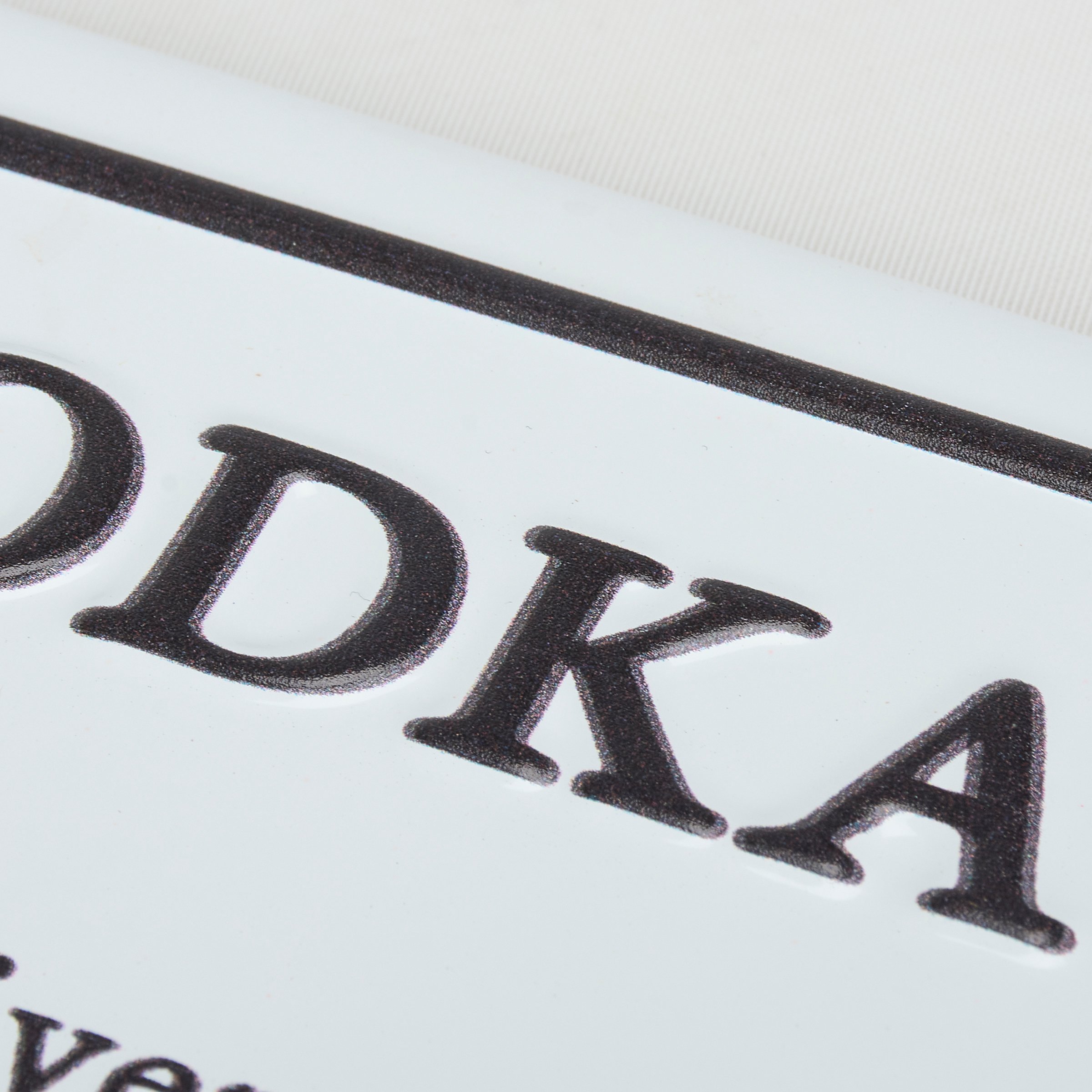 A metal wall décor piece from our Art Deco Collection featuring a cocktail recipe inspired design displaying a "Classic Vodka Drinks" sentiment above stylish cocktail illustrations with drink names and recipes for each. Vodka recipes sign features embossed details for added dimension. Our Classic Vodka Recipes metal wall décor is easy to hang against wall using the included mounting hardware and pre-drilled holes in each corner. A stylish alcohol themed home accent perfect for a home bar.