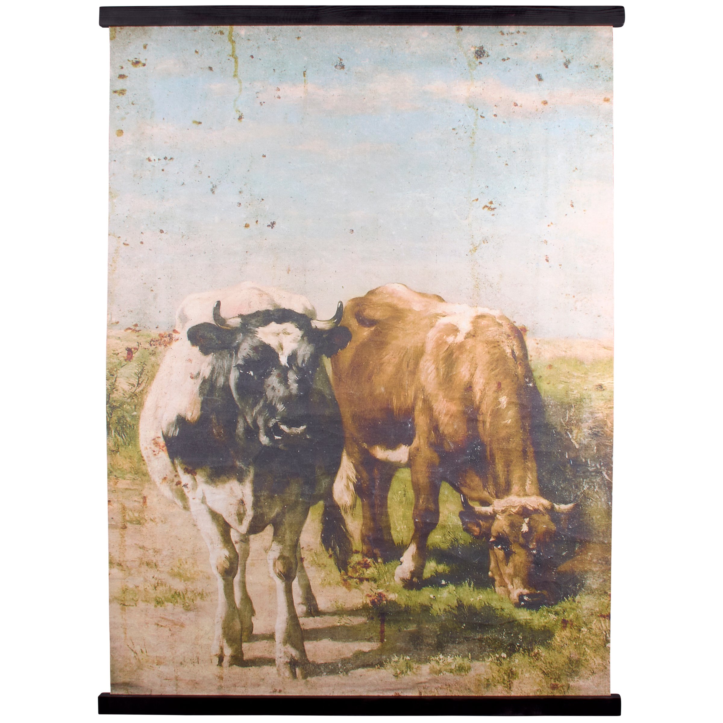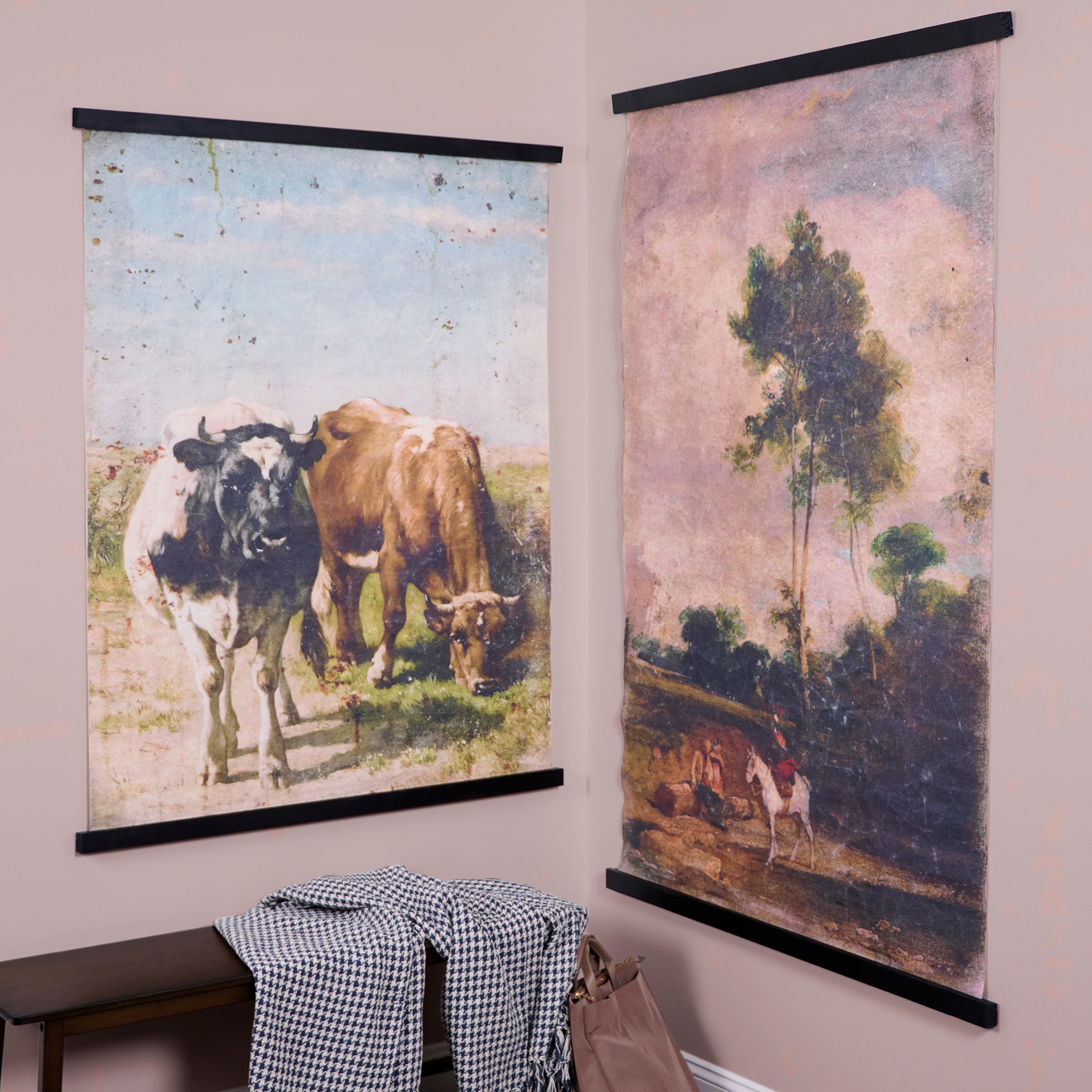 A wall décor piece from our Cottage Charm Collection featuring vintage art of farm cows in a pasture displayed on fabric stretched between two wooden borders. Fabric art also features distressed details for aged appearance. Our Cow Pasture wall décor is easy to hang for display via metal keyhole slots on the back and rolls up for compact storage. A farm themed home accent perfect for adding vintage style to home decor.