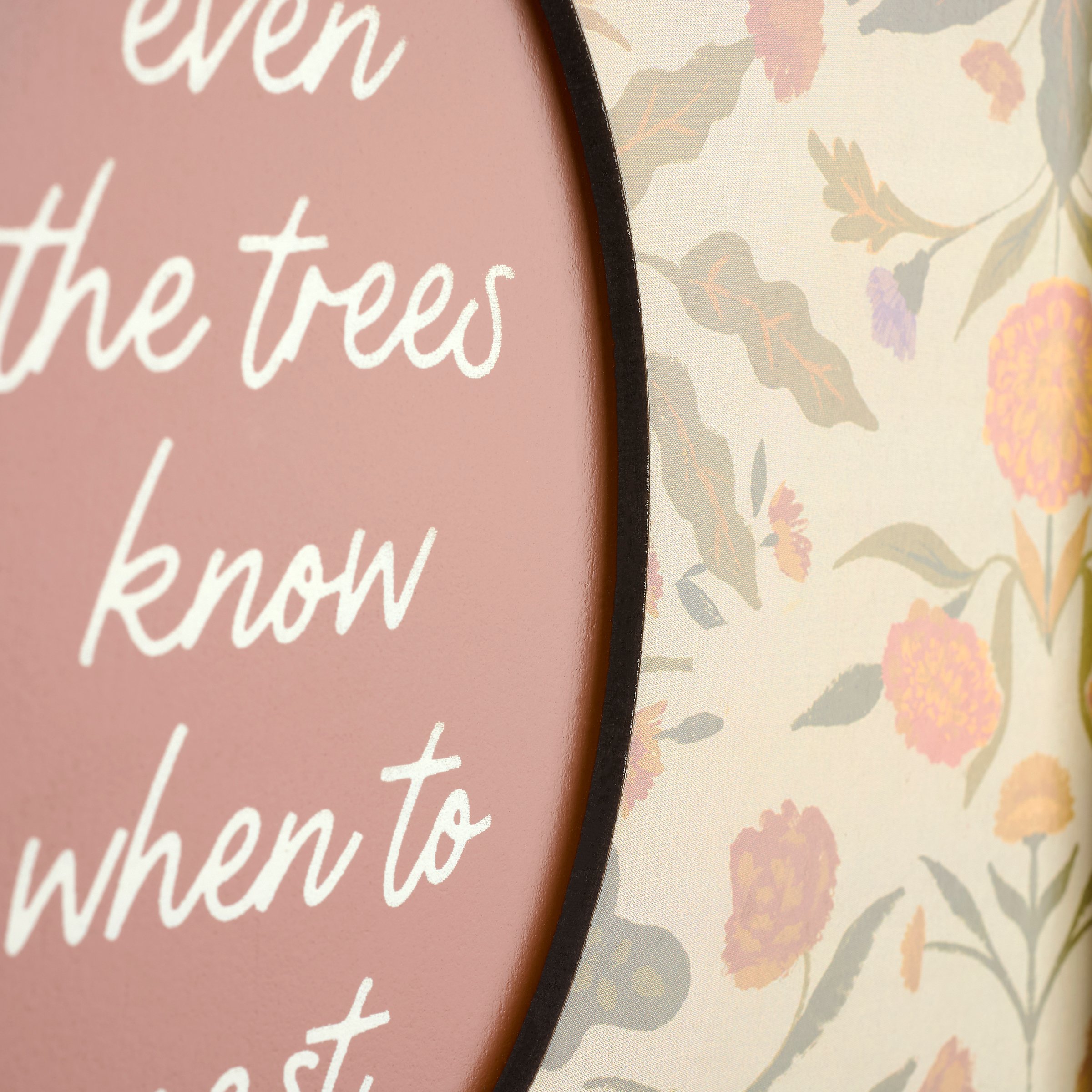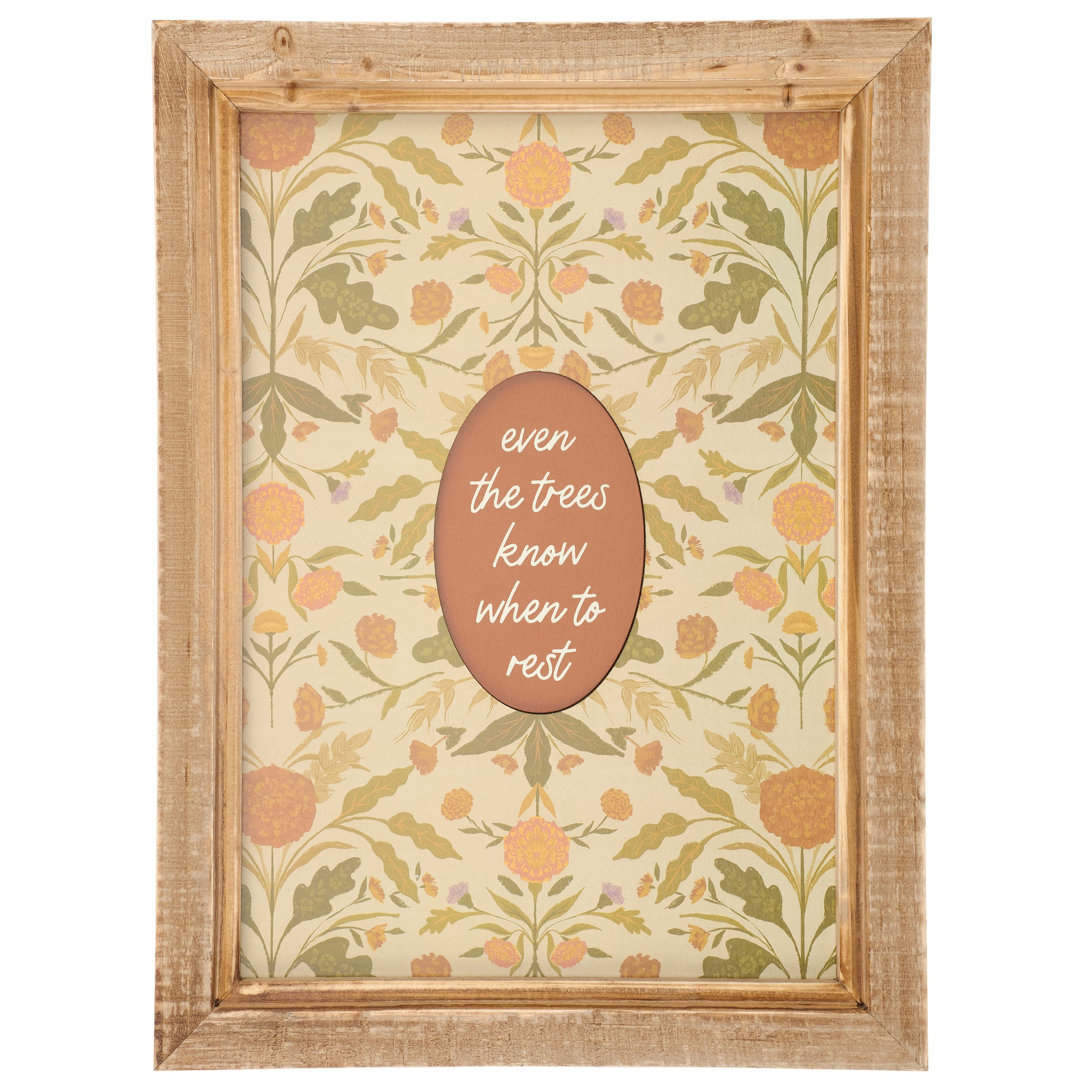 A wall décor piece from our Fall & Harvest Collection featuring a folk art inspired pattern of fall florals with an oval cutout in the middle displaying an inspirational sentiment that reads "Even The Trees Know When To Rest." Inspirational folk art design is displayed inside a distressed natural wood frame. Our Trees Know When To Rest wall décor is ready to hang via the attached sawtooth hanger on the back. A folk art fall home accent perfect for adding seasonal style to any home.