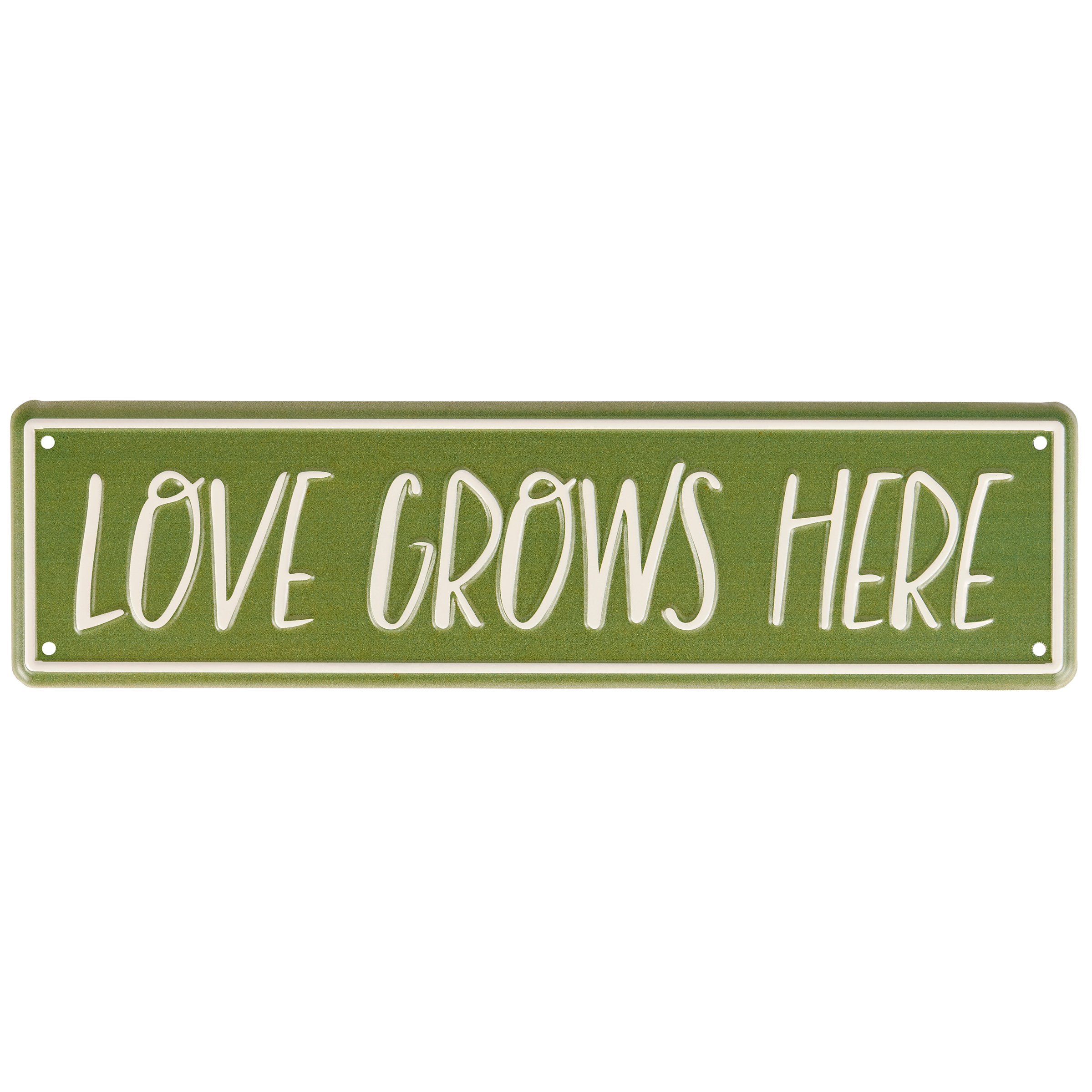 A metal wall décor piece from our Plant Parent Collection displaying an inspirational plant-themed sentiment that reads "Love Grows Here." Plant sign design features embossed details for added dimension. Our Love Grows Here metal wall décor is easy to hang against wall using the included mounting hardware and pre-drilled holes in each corner. An inspirational plant-themed home accent perfect for everyday display.