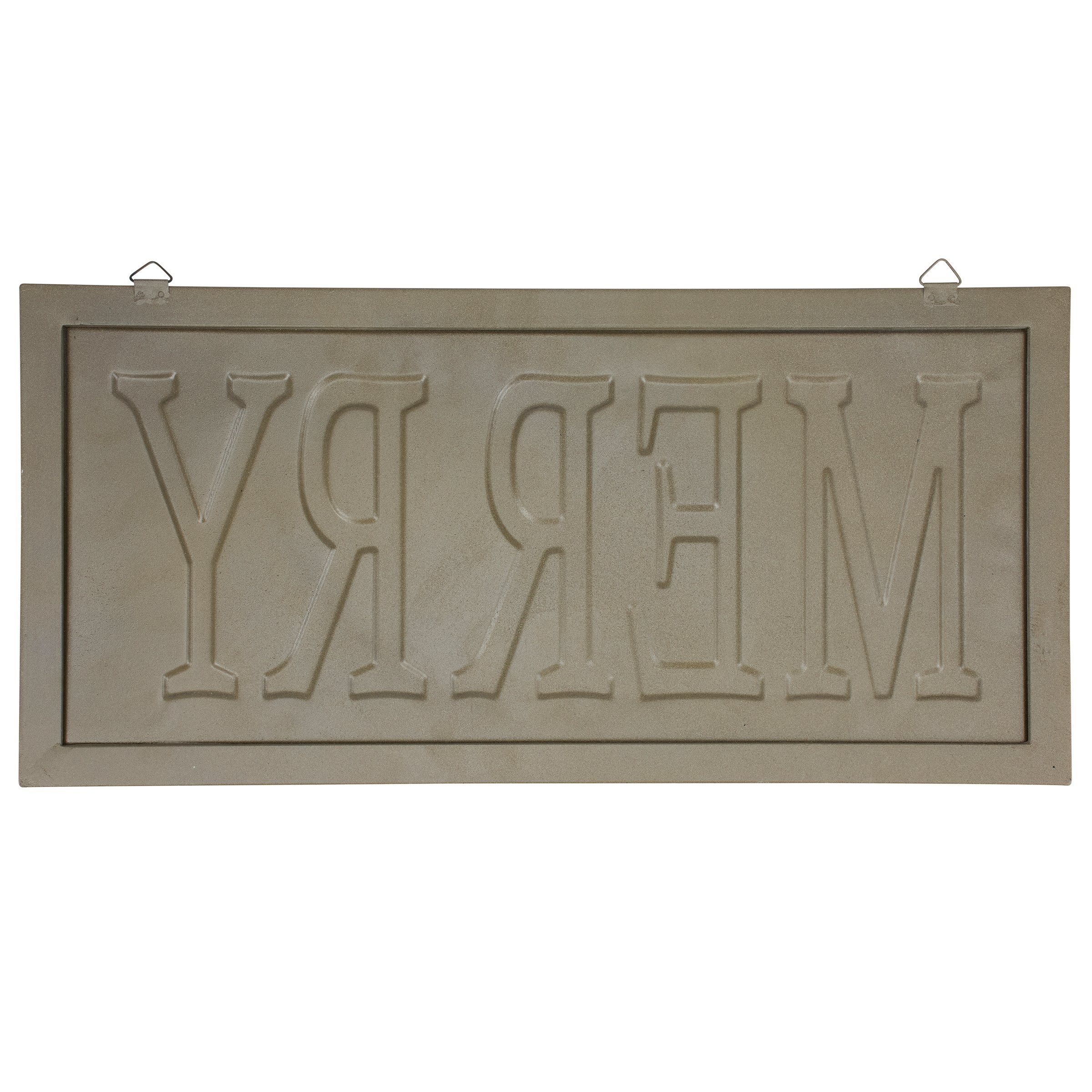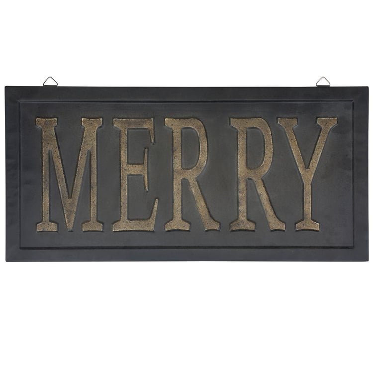 A metal wall décor piece from our Christmas Collection displaying a vintage black sign that displays an embossed seasonal sentiment with distressed details that reads "Merry." Our Merry sign is ready to hang on wall for display via the attached hangers at the top. A vintage Christmas home accent perfect for adding seasonal style to any room.