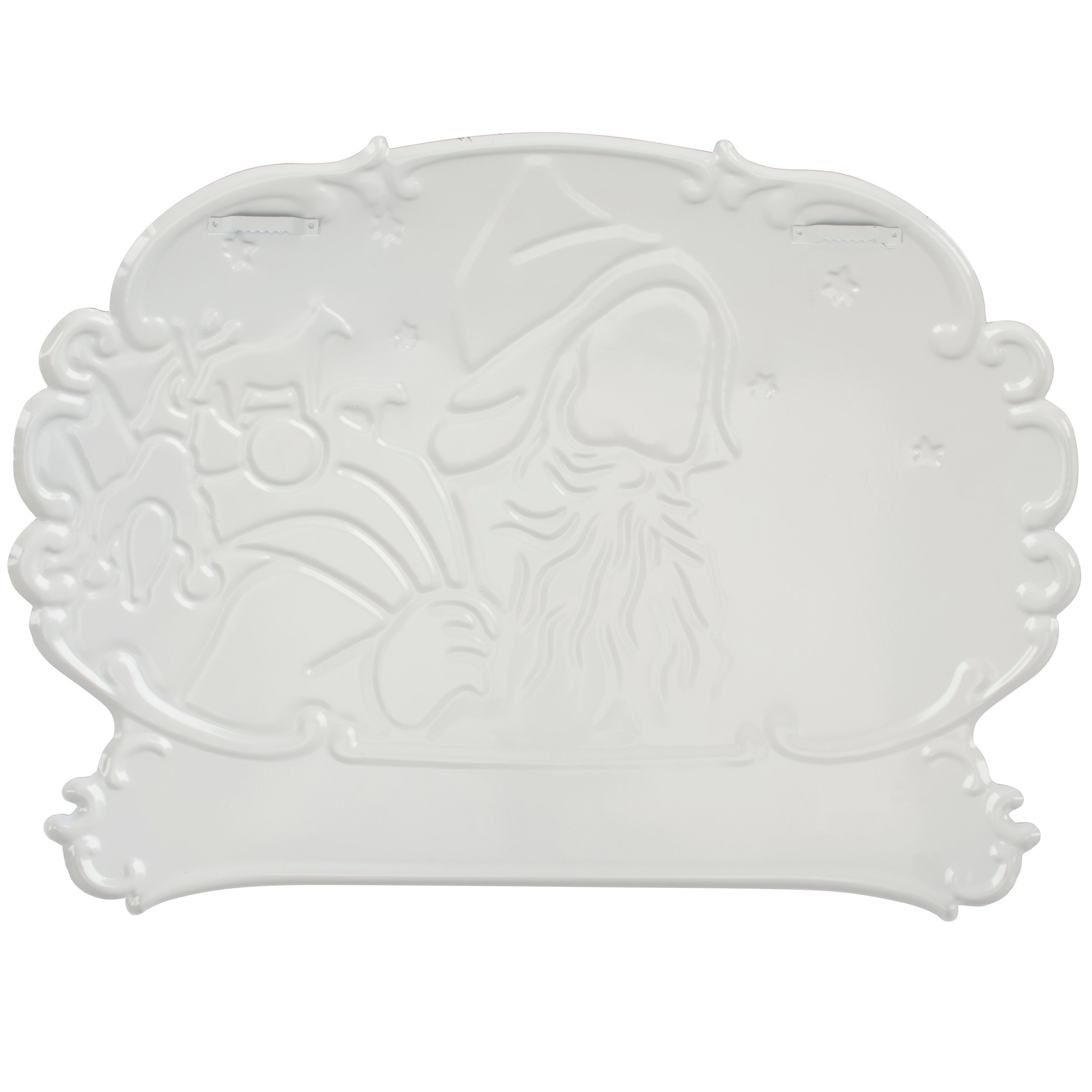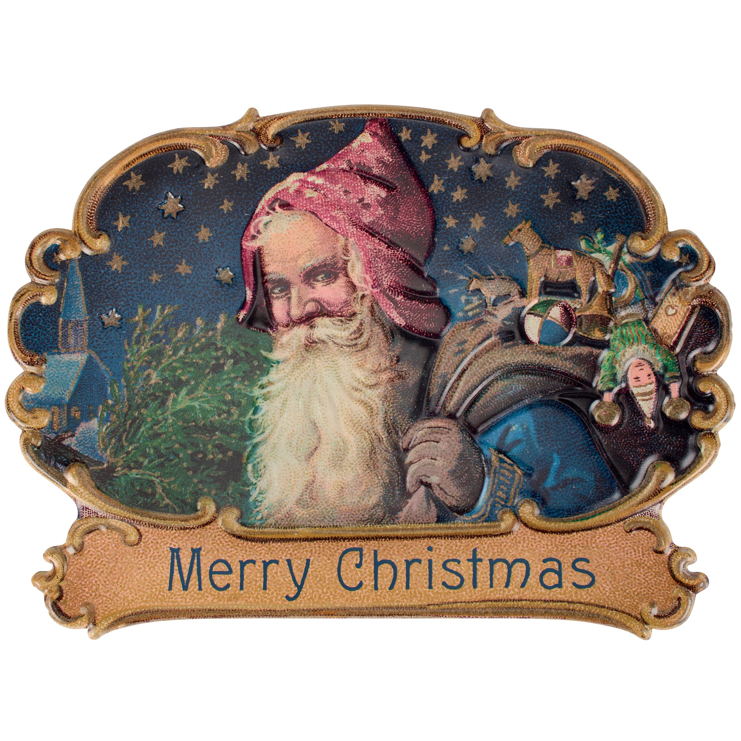 A metal wall décor piece from our Christmas Collection displaying vintage art of an old world Santa delivering presents under a starry midnight sky as well as a seasonal sentiment that reads "Merry Christmas." Vintage sign features embossed and debossed details for added dimension as well as metallic gold accents. Our Merry Christmas sign is ready to hang on wall for display via the attached sawtooth hangers on the back. A vintage Christmas home accent perfect for adding seasonal style to any room.