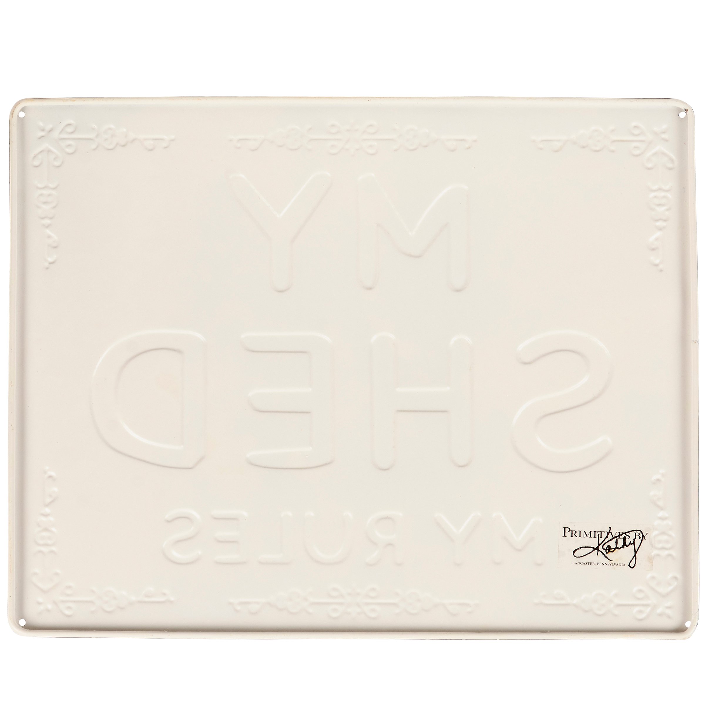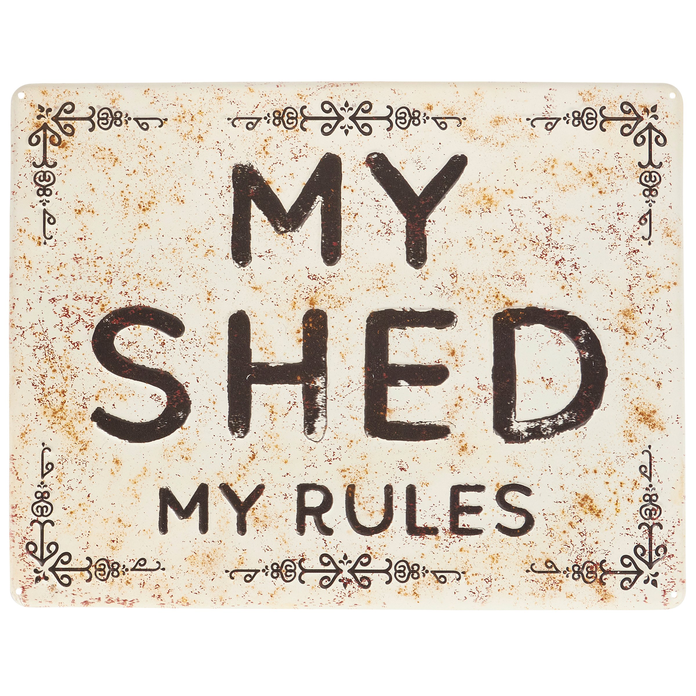 A metal wall décor piece from our Garden Collection displaying a rustic sign inspired sentiment that reads "My Shed My Rules." Design features embossed details as well as a rust finish for an aged appearance. Our My Shed My Rules wall décor is easy to hang against wall using the included nails and pre-drilled holes in each corner. A rustic garden-themed home accent perfect for everyday display.
