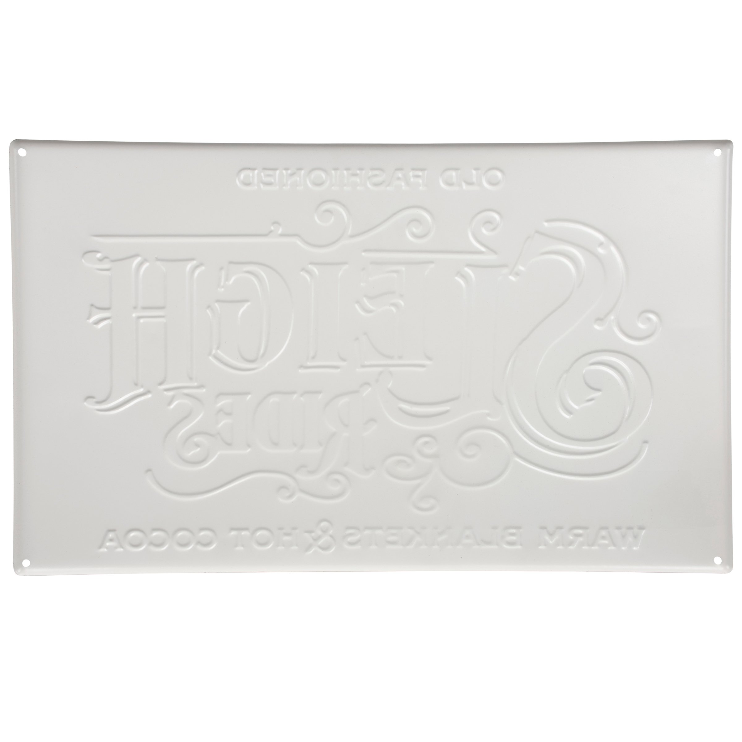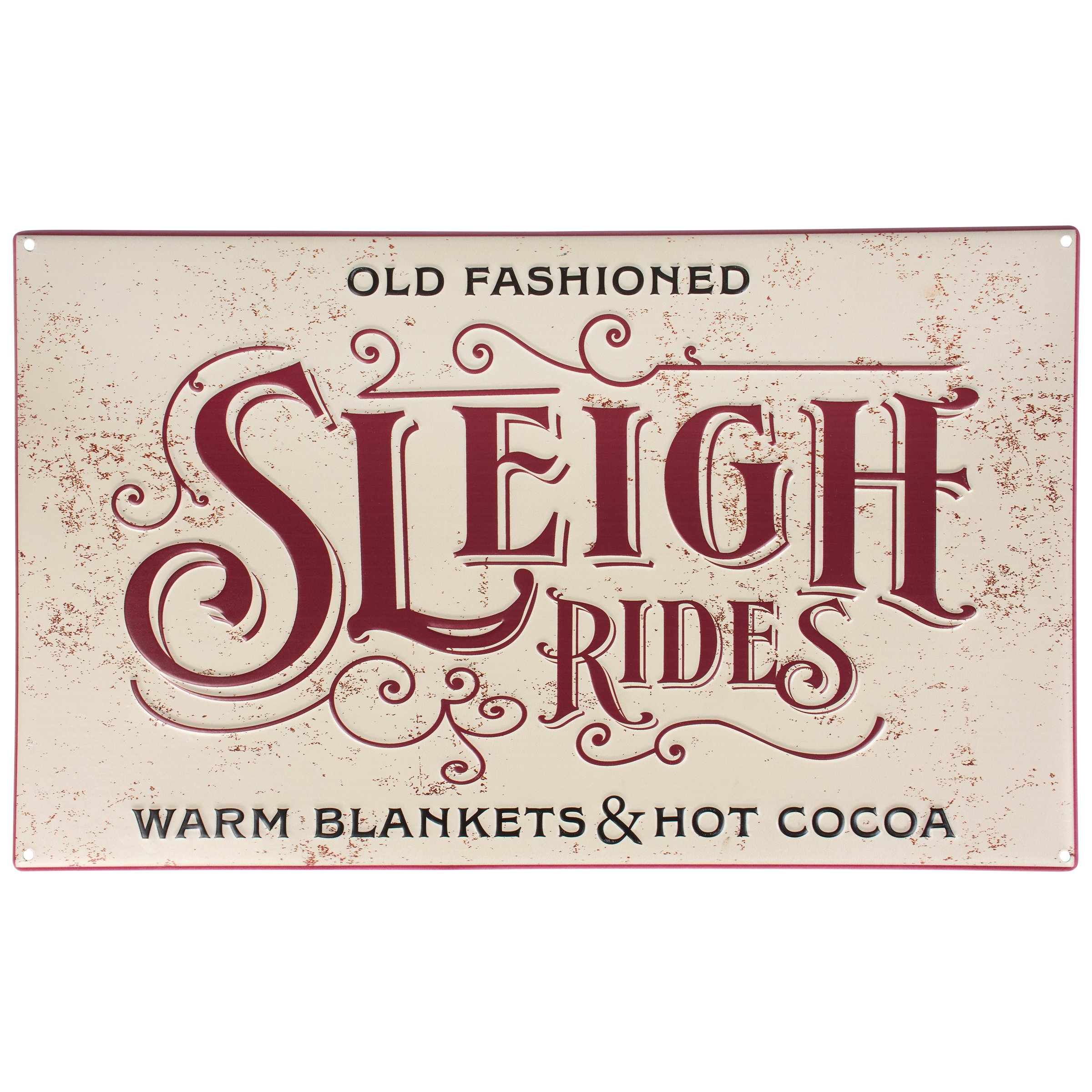 A metal wall décor piece from our Christmas Collection displaying a vintage sleigh ride sign inspired design with sentiment that reads "Old Fashioned Sleigh Rides - Warm Blankets & Hot Cocoa." Sleigh ride sign features a rust finish and embossed details for added dimension. Our Old Fashioned Sleigh Rides metal wall décor is ready to hang against wall using the included mounting hardware and pre-drilled holes in each corner. A vintage Christmas home accent perfect for seasonal display.