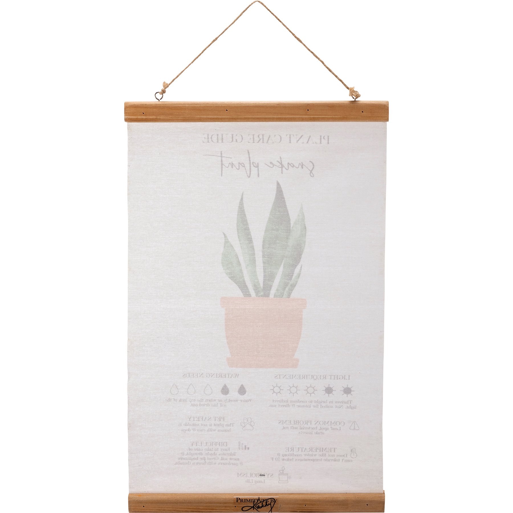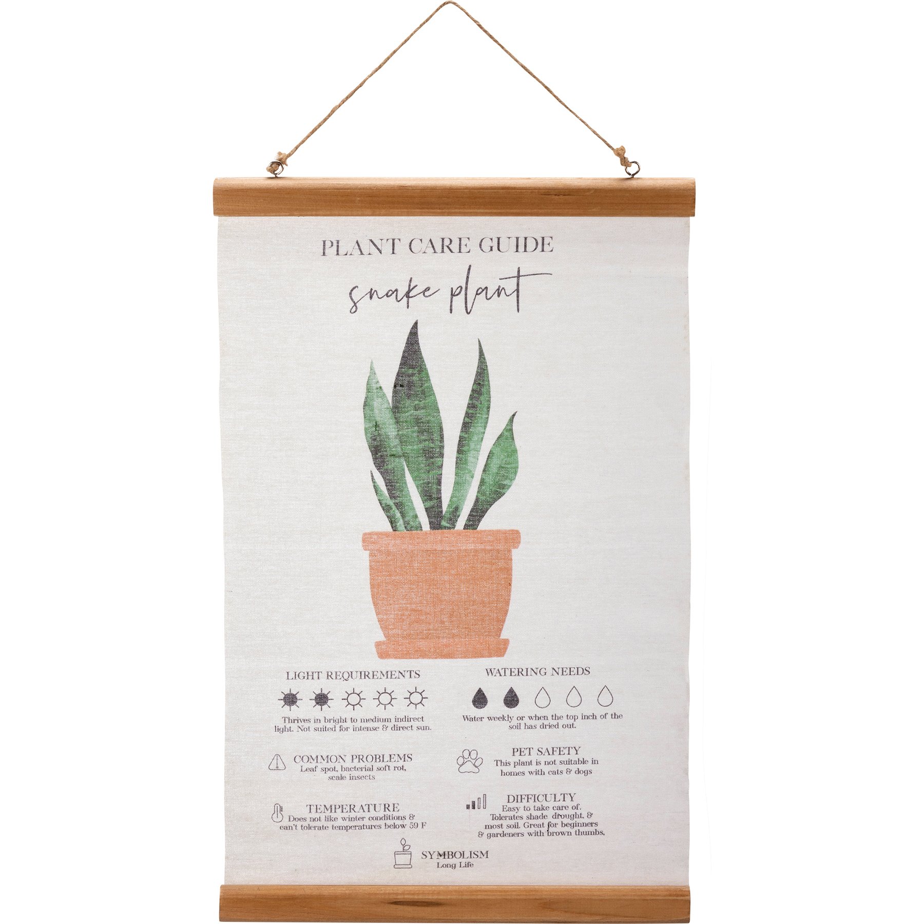 A hanging wall décor piece featuring a "Plant Care Guide - Snake Plant" sentiment with a snake plant illustration alongside detailed care instructions. Canvas art is pulled between two wooden slats and hangs easily via jute loop.