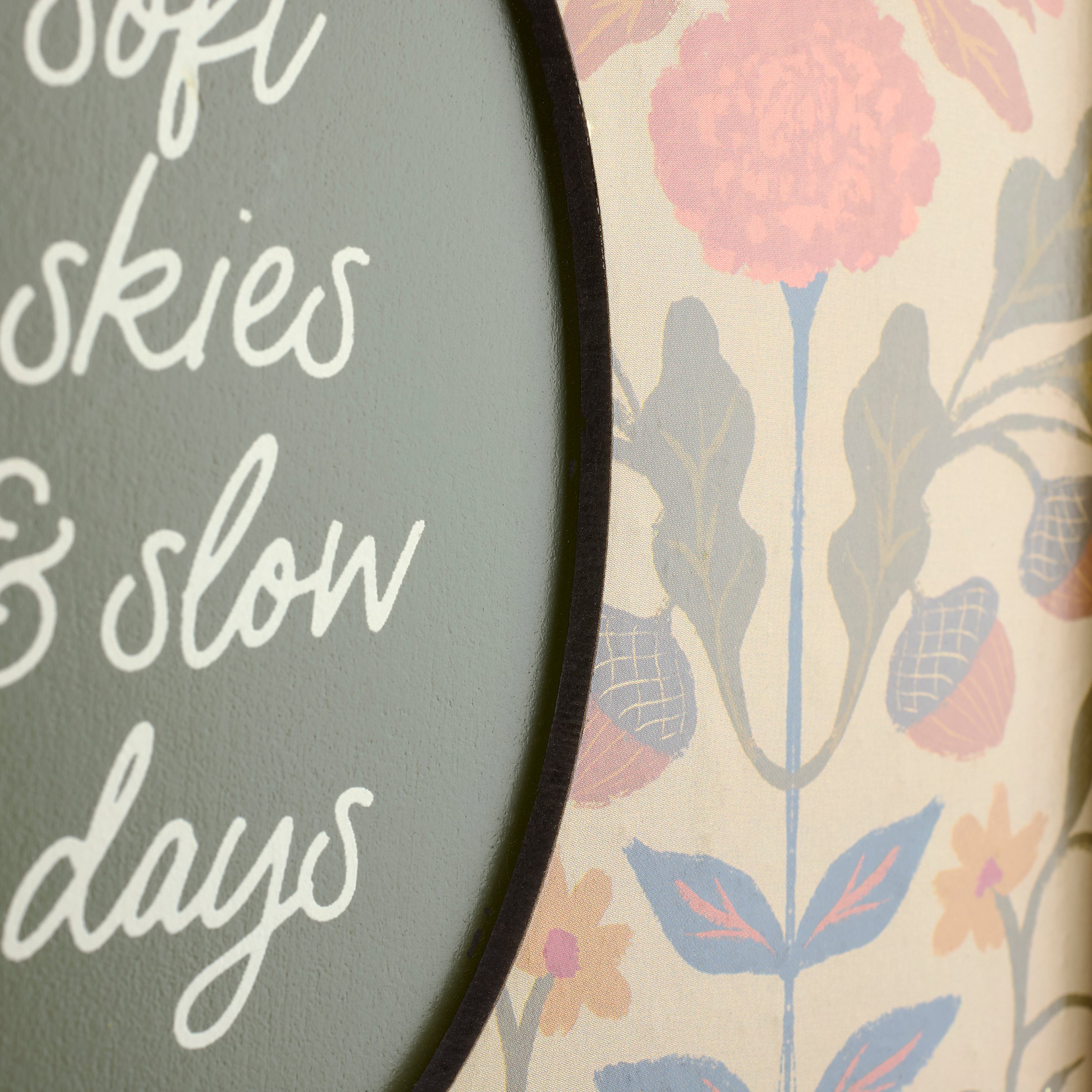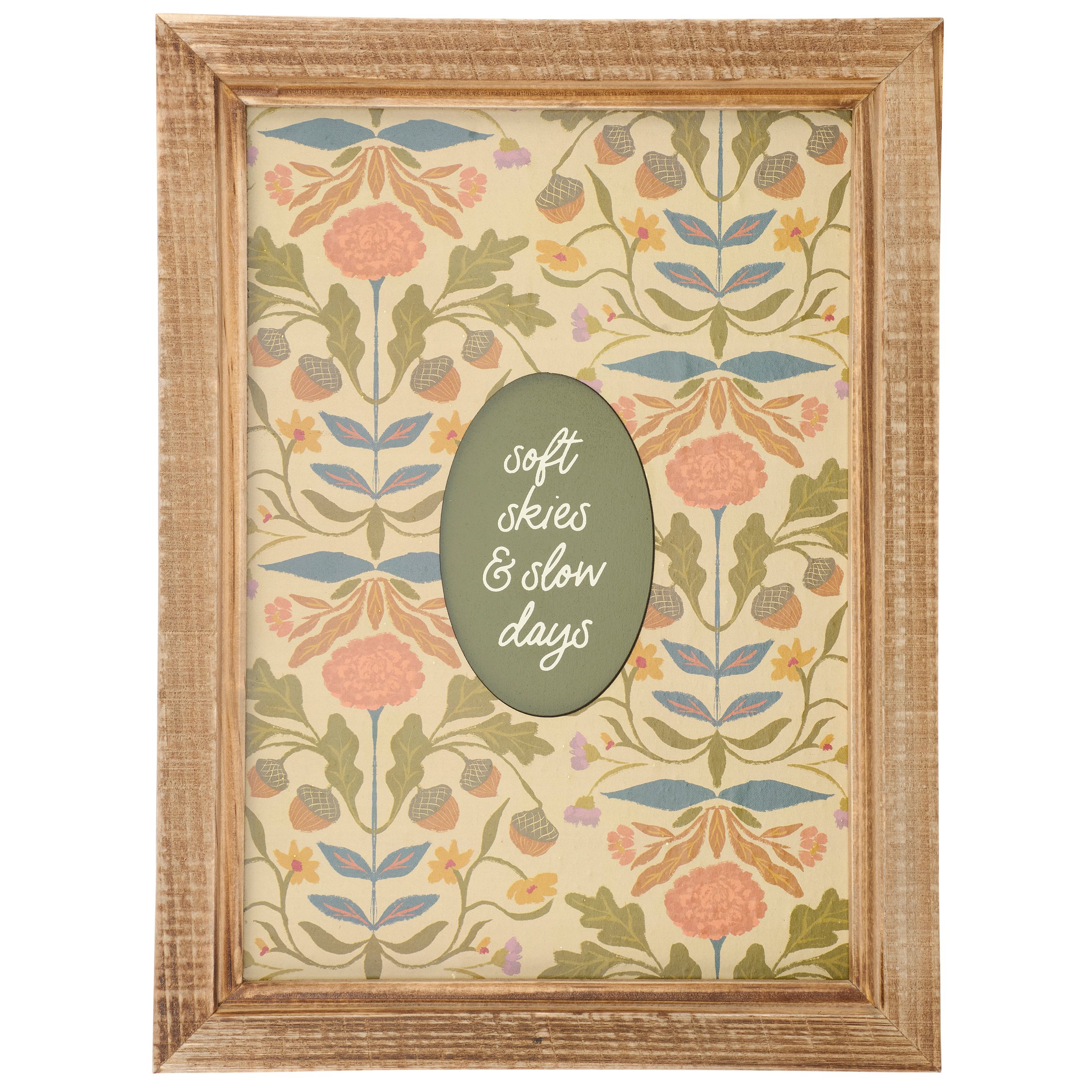 A wall décor piece from our Fall & Harvest Collection featuring a folk art inspired pattern of fall florals with an oval cutout in the middle displaying an inspirational sentiment that reads "Soft Skies & Slow Days." Inspirational folk art design is displayed inside a distressed natural wood frame. Our Soft Skies & Slow Days wall décor is ready to hang via the attached sawtooth hanger on the back. A folk art fall home accent perfect for adding seasonal style to any home.