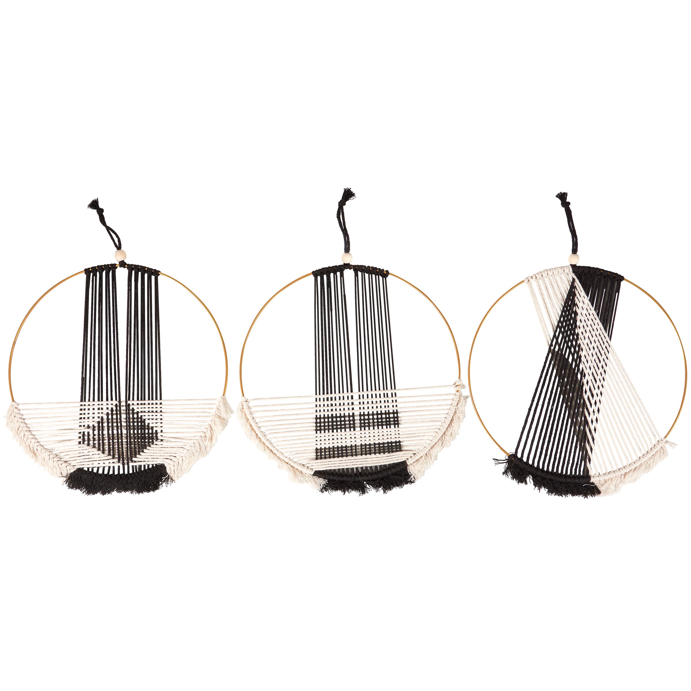 A set of wall hangings from our Home Collection including 3 metal rings with individual woven designs on each in a black and white color palette. Each hanging features strings pulled across the ring to form a different geometric pattern. Our Woven Ring wall hanging set is easy to display using the string hanger on the top with a wooden bead accent. A bohemian inspired set of home accents with a variety of display options.