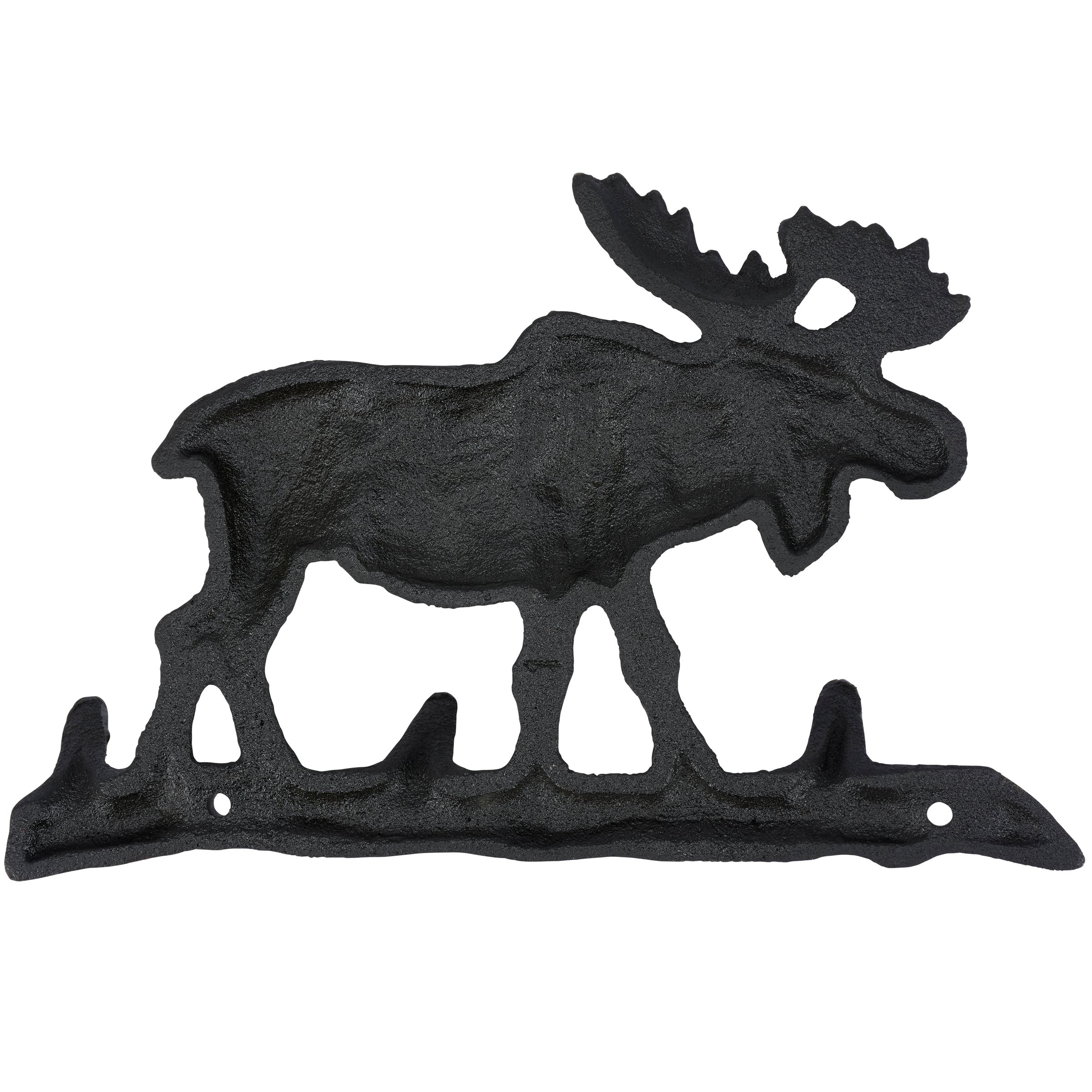 A metal wall hook from our Lake & Cabin Collection displaying a rustic design inspired by cabin décor. This sturdy wall hook features a sculpted design of a moose on a log with antique finish and three angled tree branches to create hooks for hanging accessories or clothing on the wall. Our Bull Moose wall hook is easy to hang for display and use via predrilled holes. A rustic home accent that adds functional style to any space.