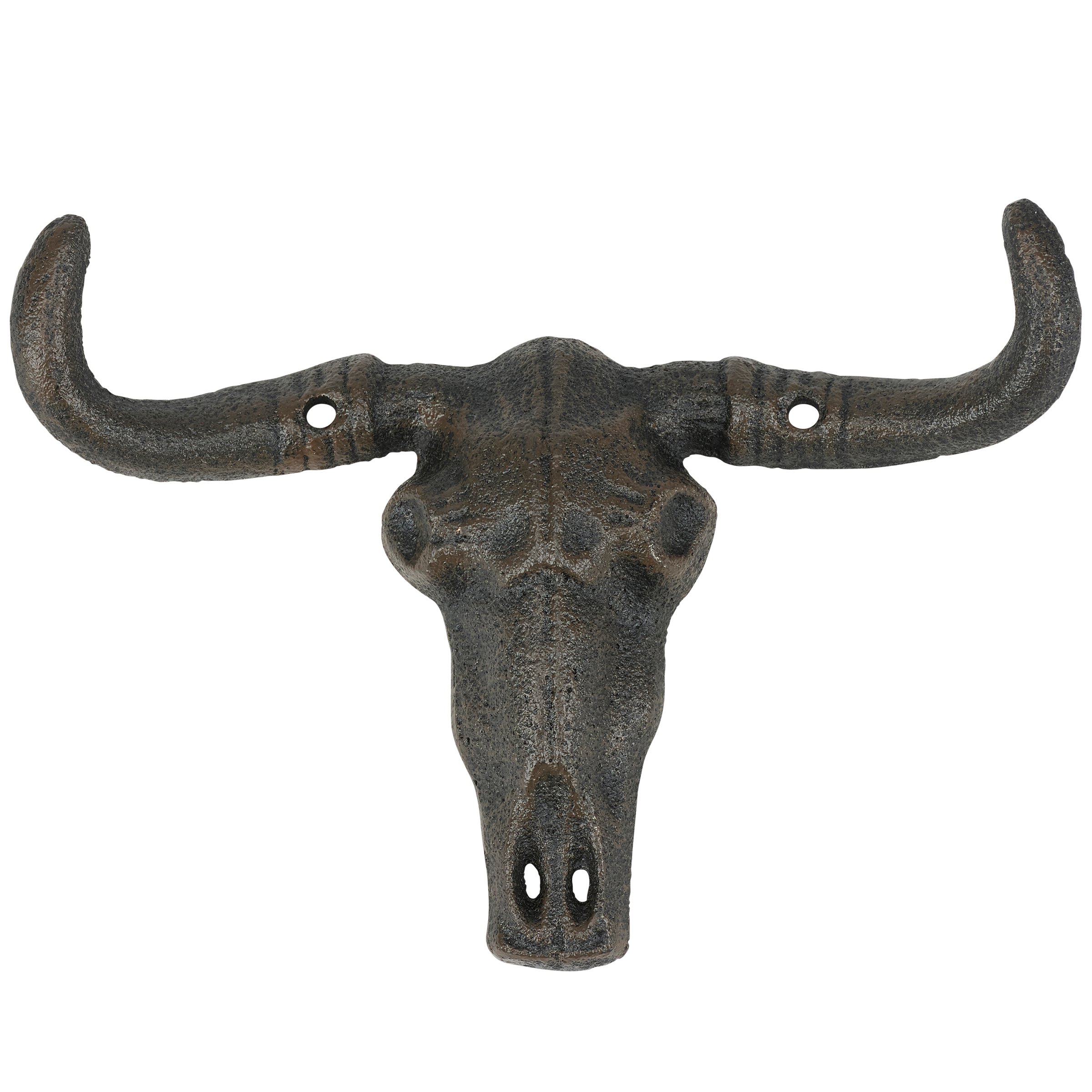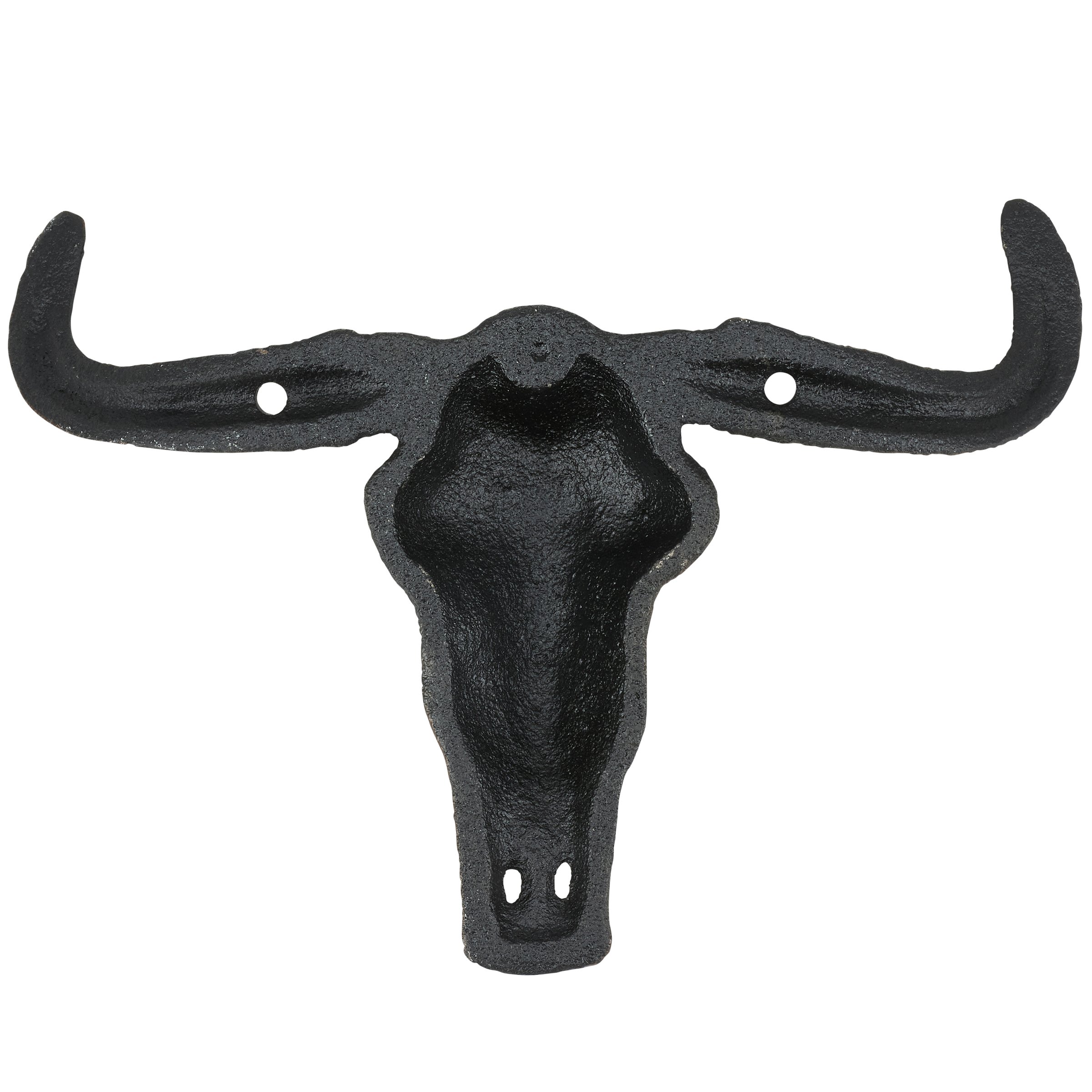A metal wall hook from our Western Collection featuring a sculpted bull skull design with antique finish and angled horns to create two hooks for hanging accessories or clothing on the wall. Our Bull Skull wall hook is easy to hang for display and use via predrilled holes. A western home accent that adds functional style to any space.