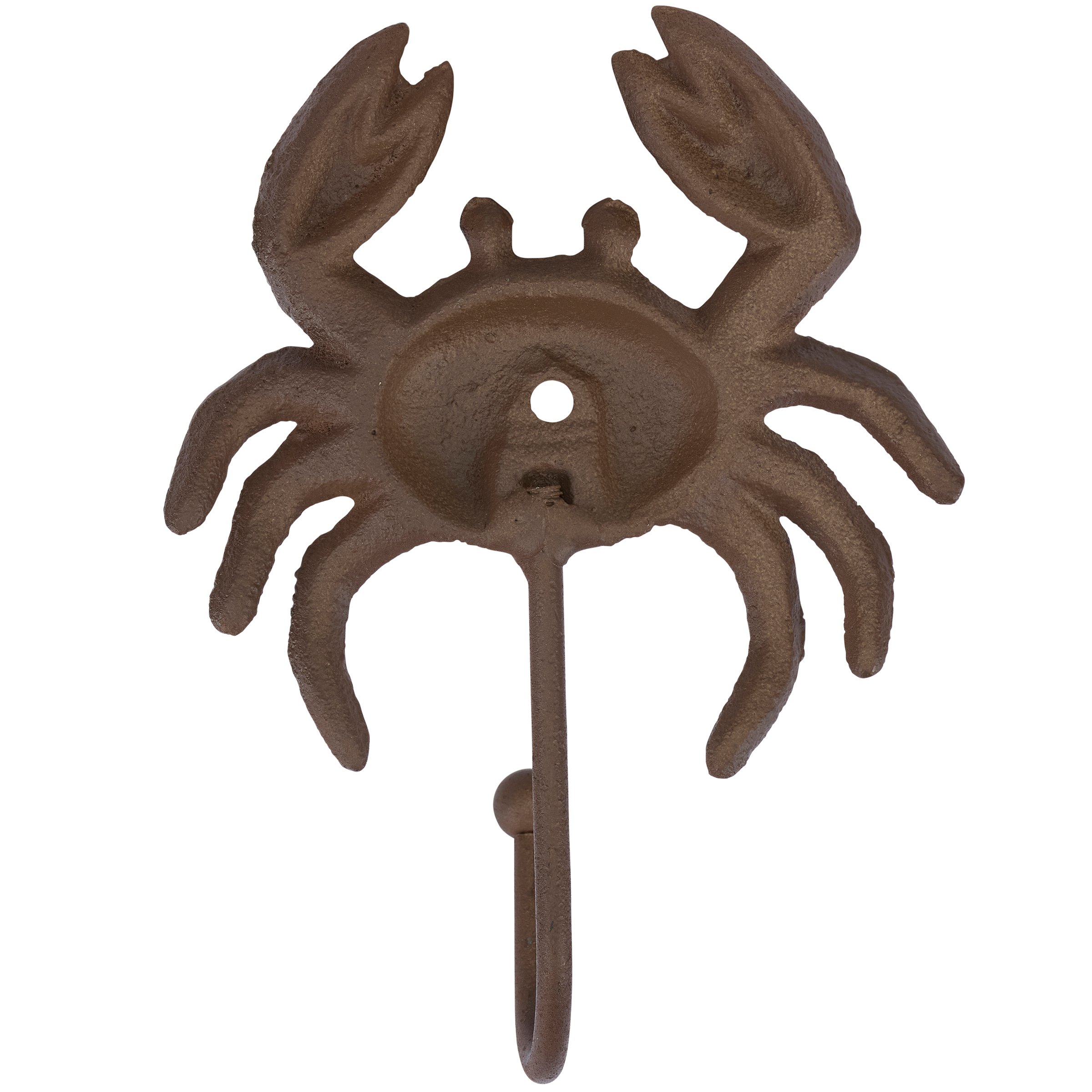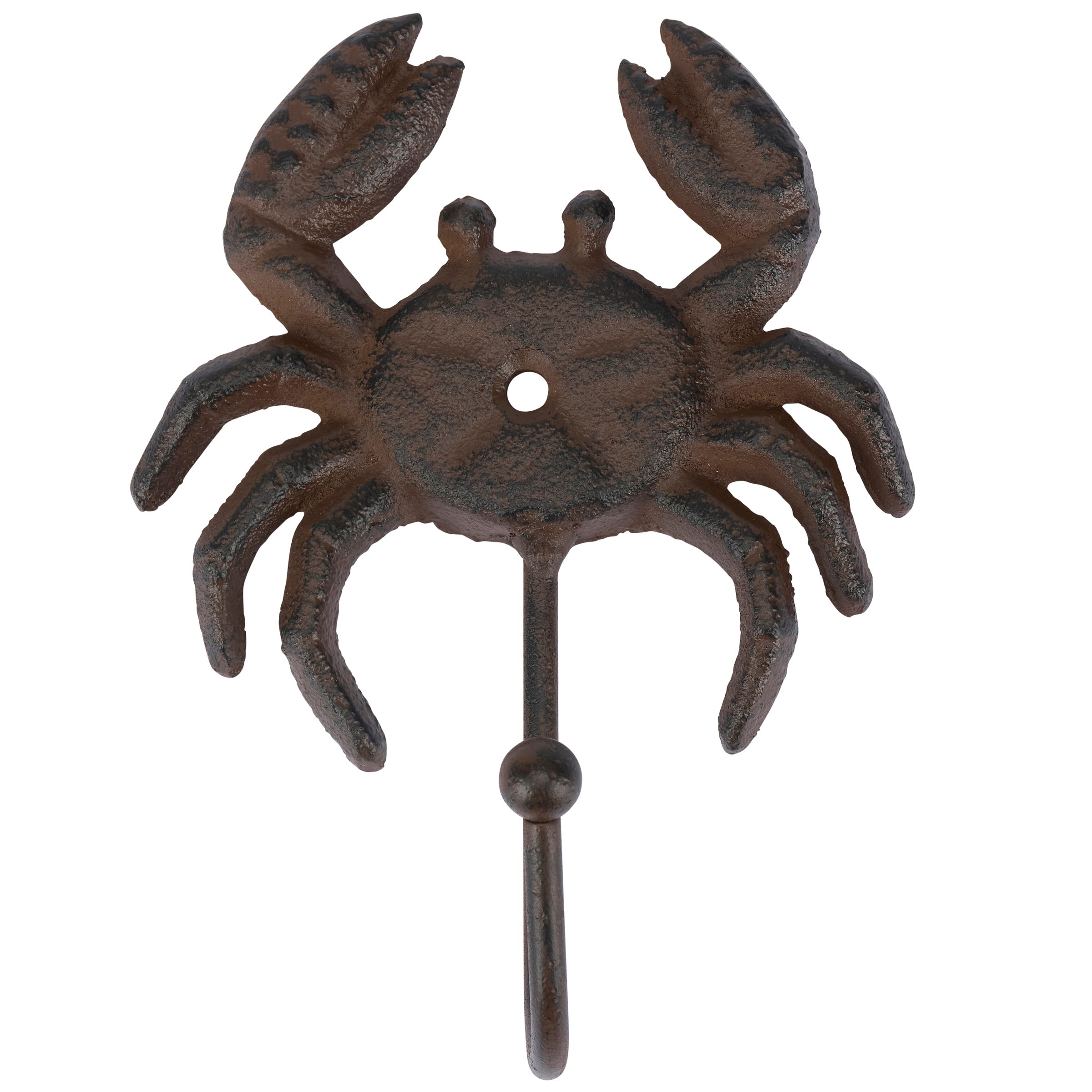 A metal wall hook from our Beach Collection displaying a rustic design inspired by beach décor. This sturdy wall hook features a sculpted crab design with antique finish and hook at the bottom for hanging accessories or clothing on the wall. Our Crab wall hook is easy to hang for display and use via predrilled holes. A rustic home accent that adds functional style to any space.