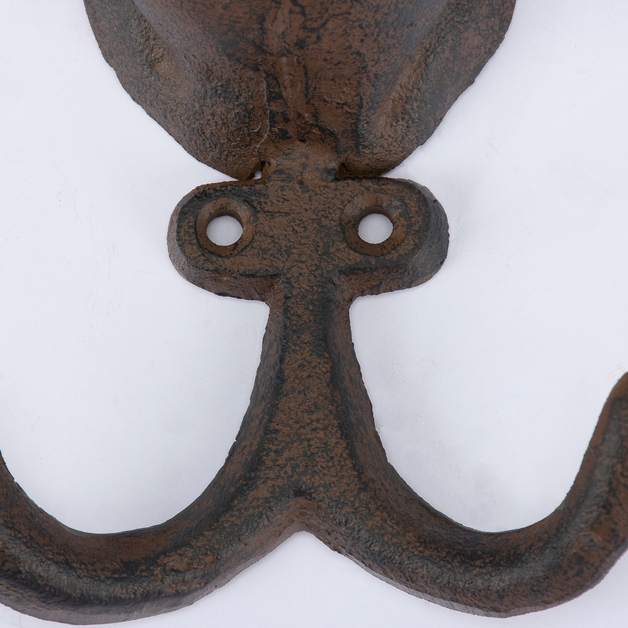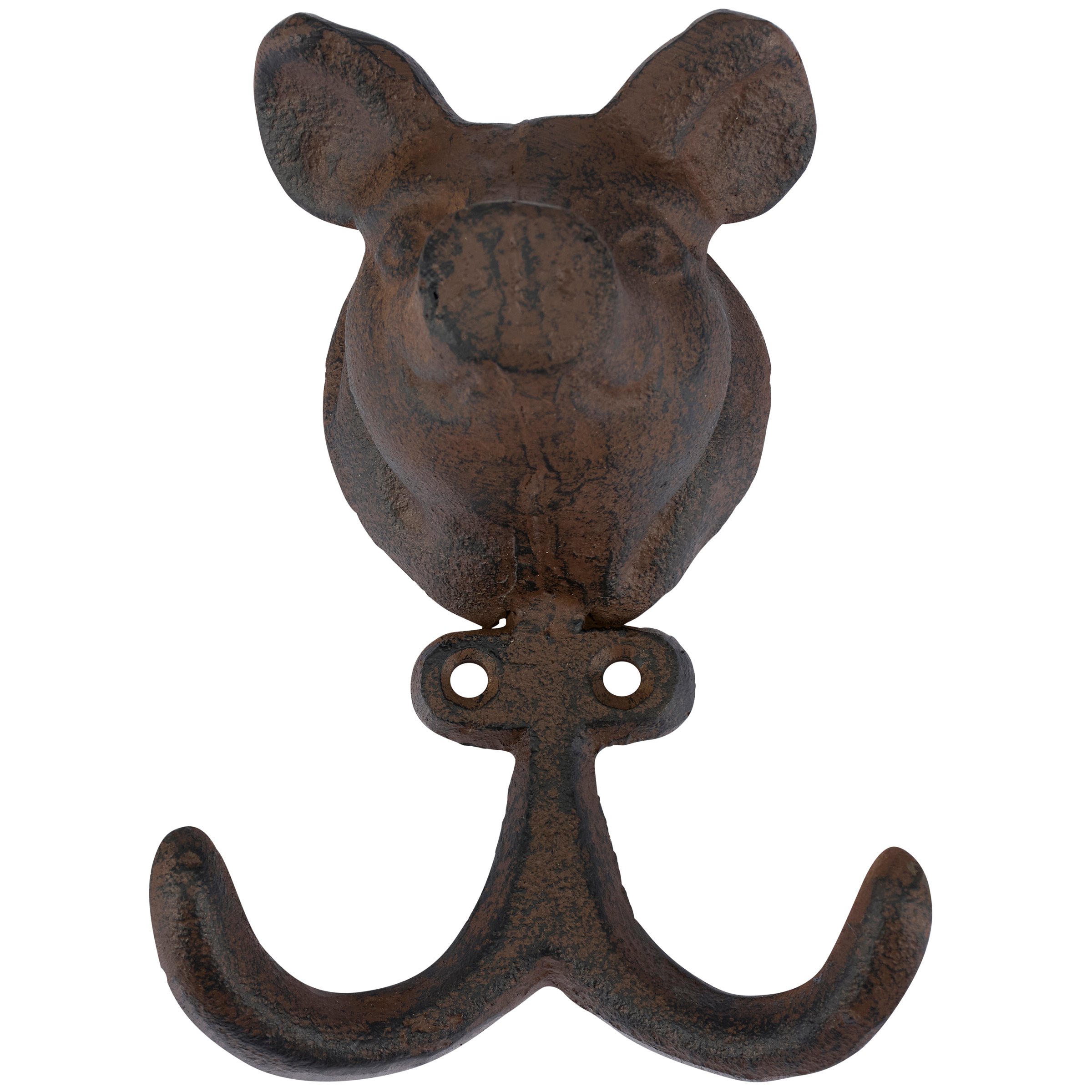 A metal wall hook from our Farmhouse Collection featuring a sculpted pig head design with antique finish and two hooks attached at the bottom for hanging accessories or clothing on the wall. Our Pig wall hook is easy to hang for display and use via predrilled holes. A rustic home accent that adds functional style to any space.