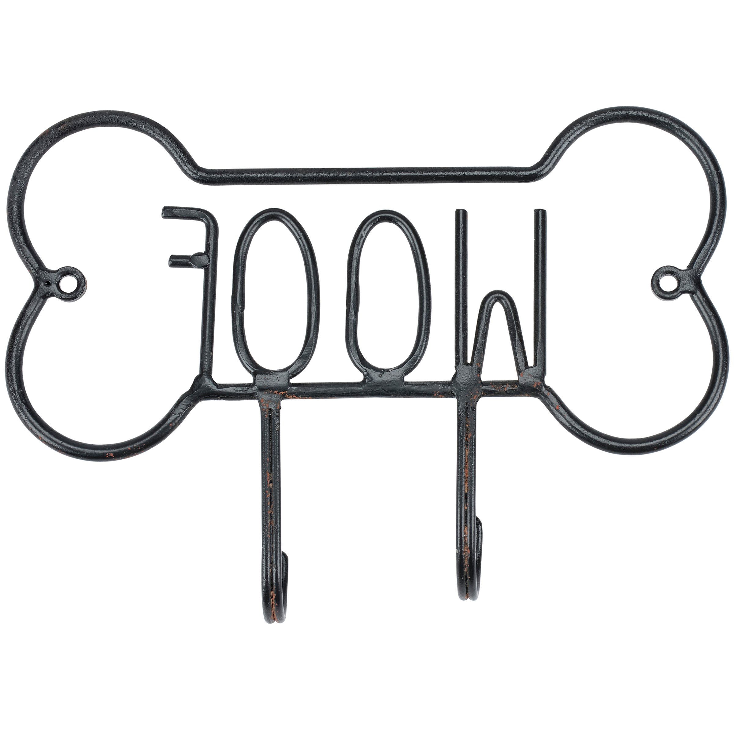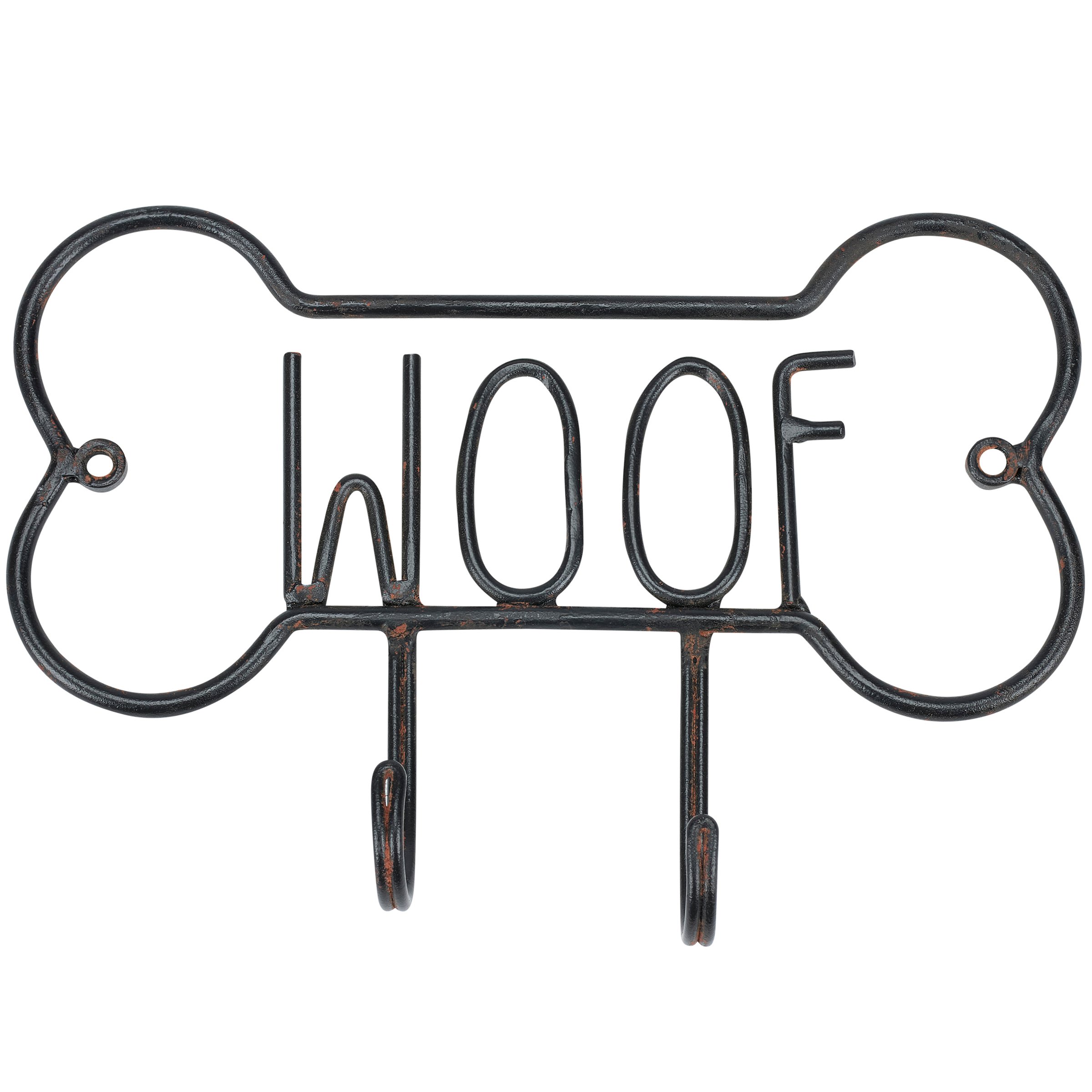 A metal wall hook from our Pet Collection featuring a dog bone outline and "Woof" sentiment with two sturdy hooks attached at the bottom for hanging pet accessories or clothing on the wall. Our Woof wall hook is easy to hang for display and use via predrilled holes. A rustic dog themed home accent that adds functional style to any space while showing off a love for pets.