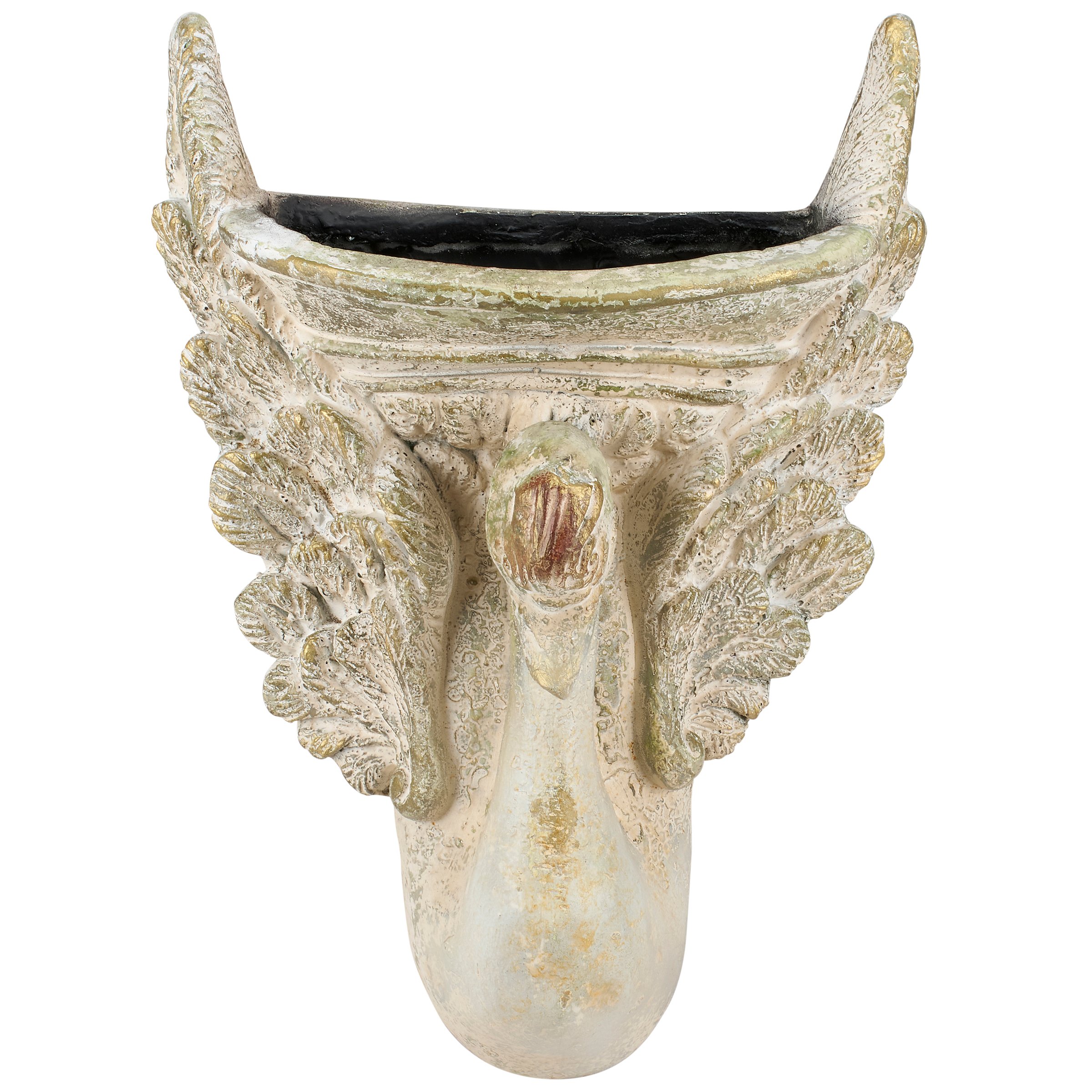 A wall vase from our Art Nouveau Collection displaying an elegant sculpted swan design with metallic finish and distressed details for aged appearance. Swan planter features a flat back to hang against wall and a hole on the top to place greenery or décor. Greenery pictured not included. Our Swan wall vase is ready to hang for display via keyhole slots on the back. A nature themed home accent perfect for adding vintage style to home decor displays.